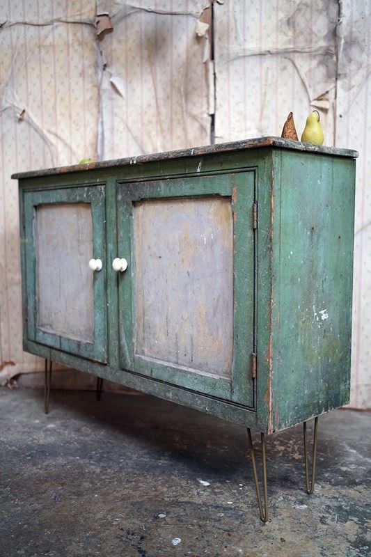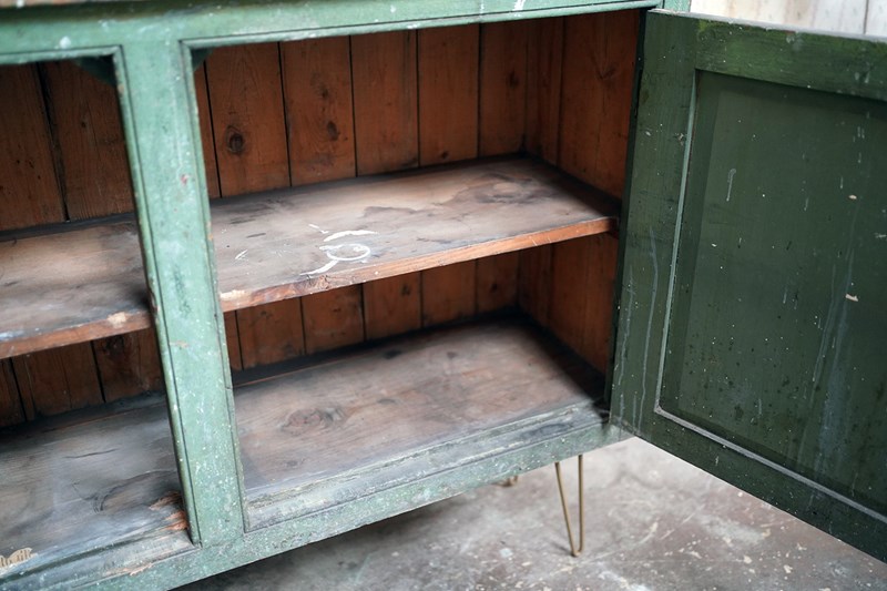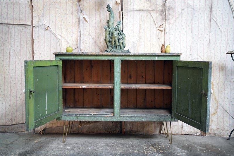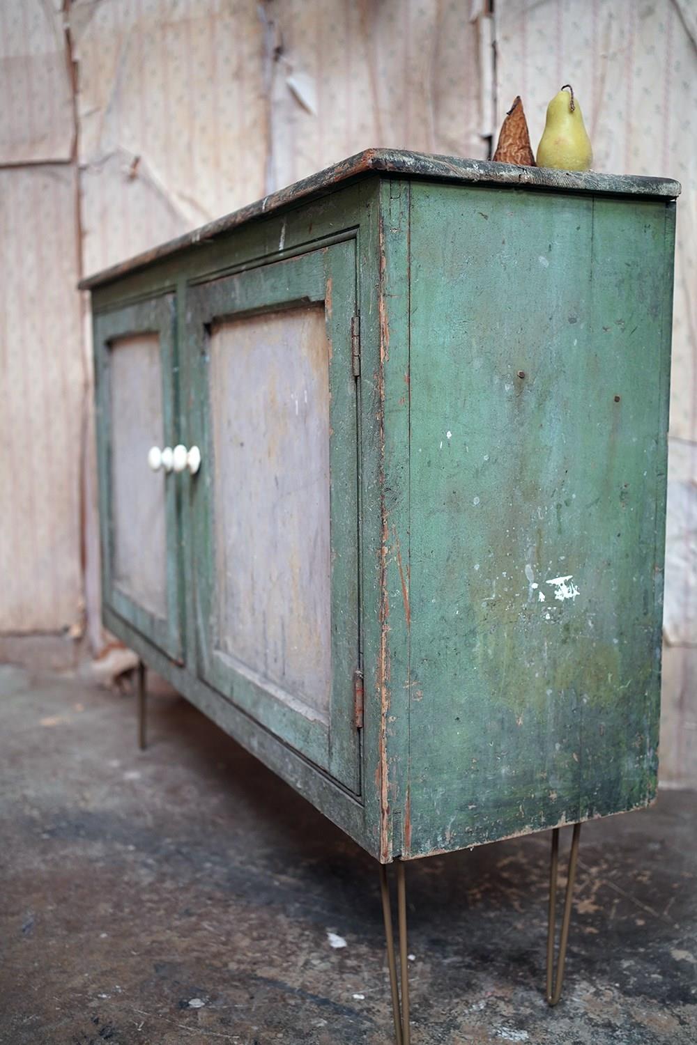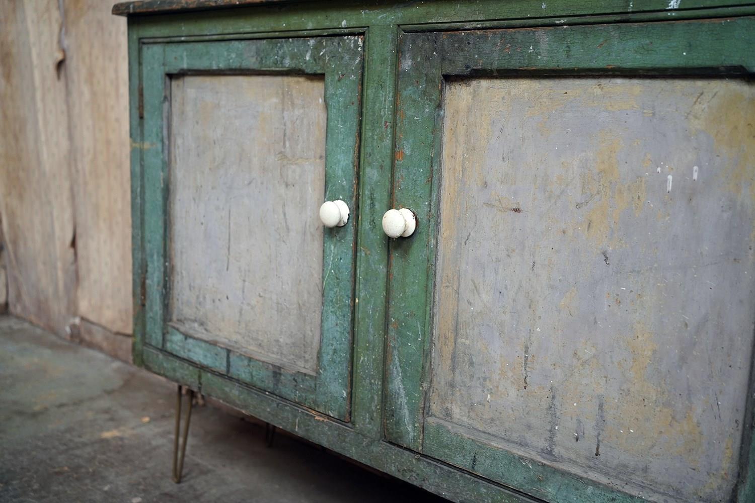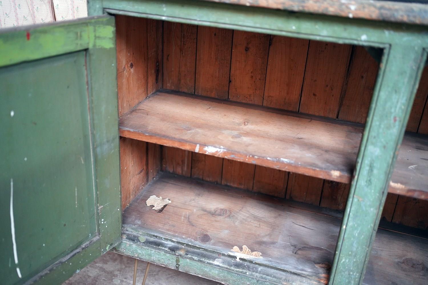 The mid-Victorian pine sideboard of pleasing proportions, the rectangular two-plank rustic top above two panelled doors opening to reveal a shelved interior, the carcass retaining a beautifully time-worn green paint surface, now softly muted and chalked through decades of use, with the recessed panels washed to a pale, almost limed tone, the whole raised on later hairpin legs, giving the piece a subtle lift and a gentle mid-century tension against its Victorian bones.