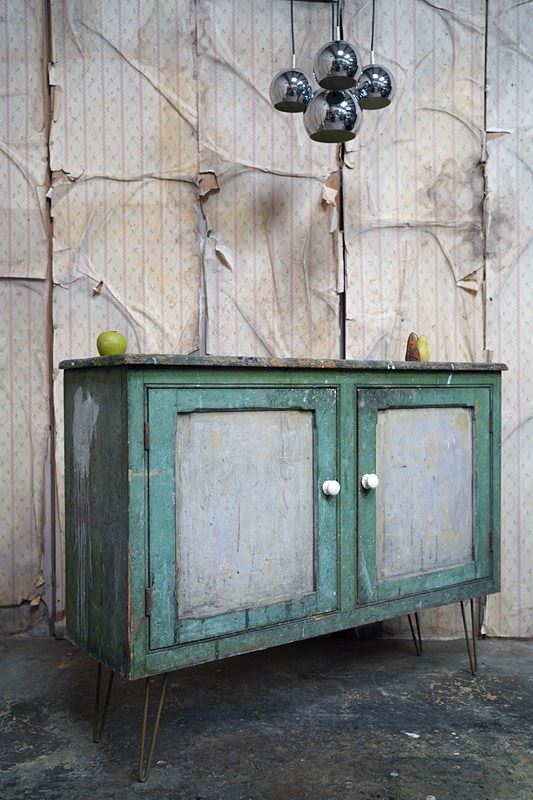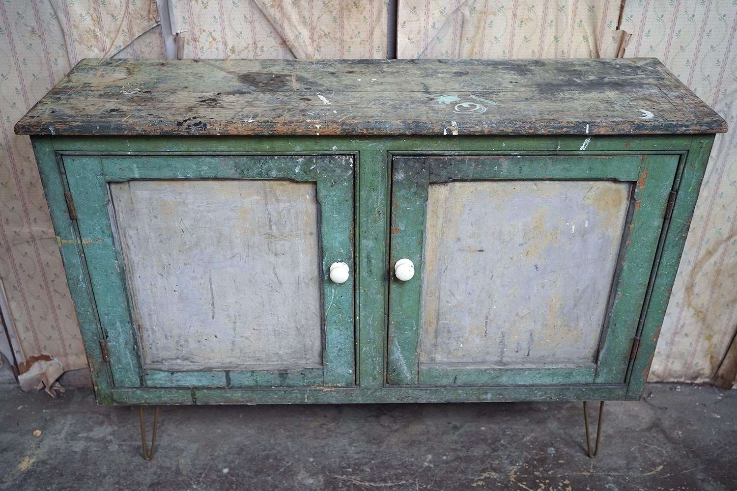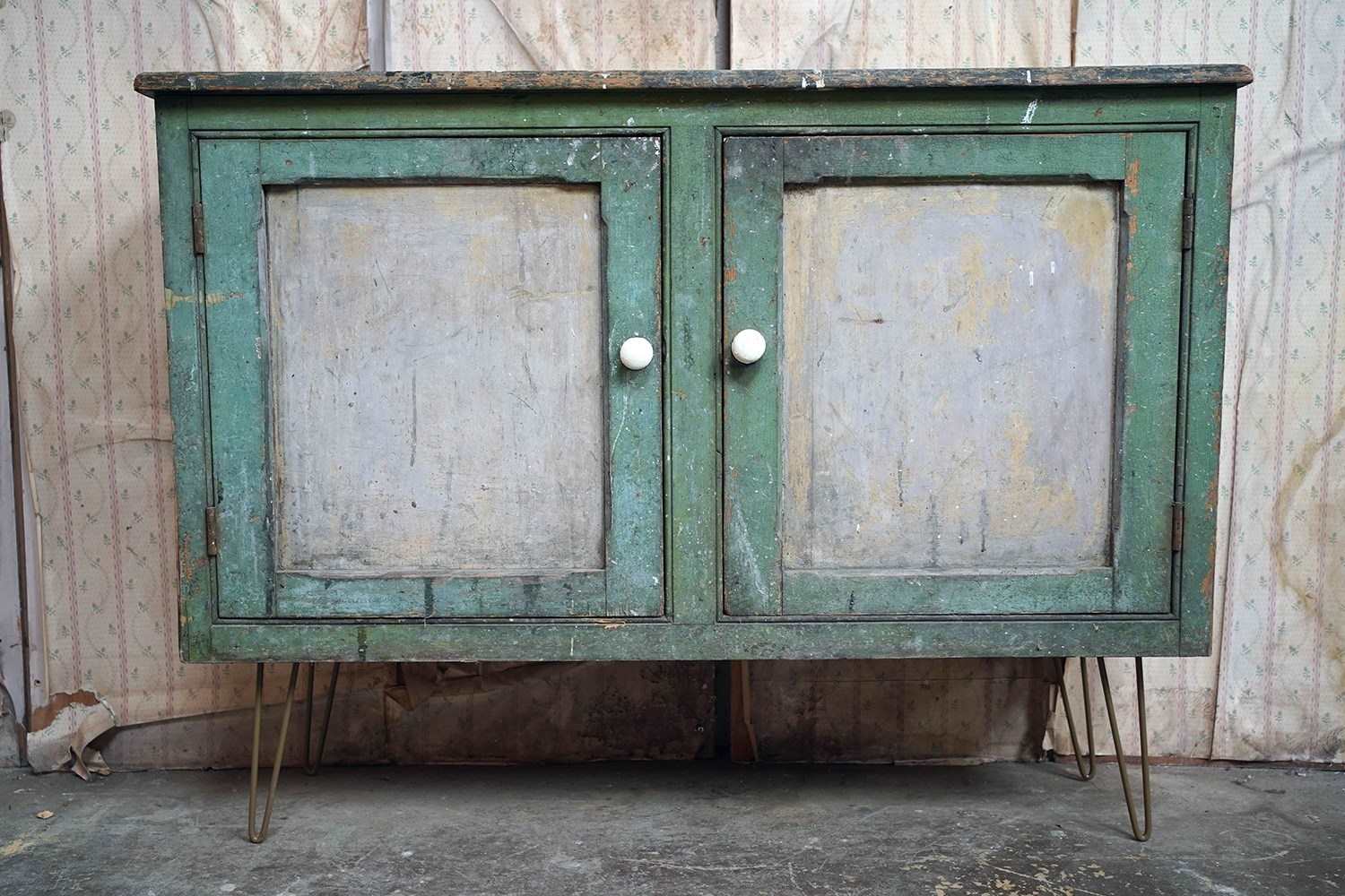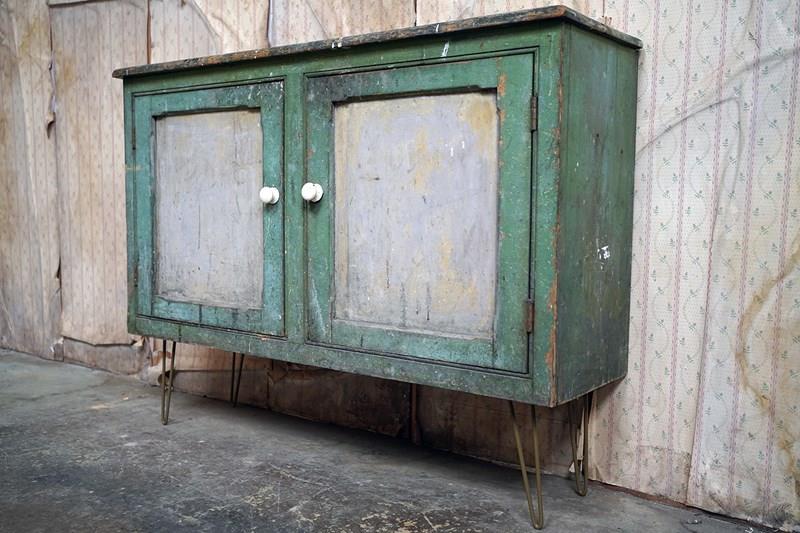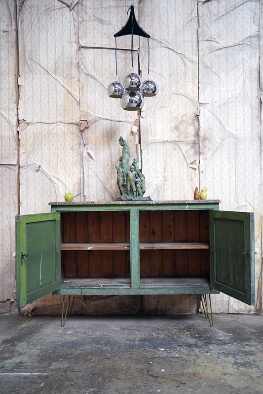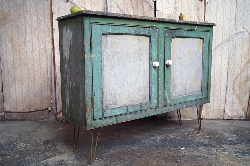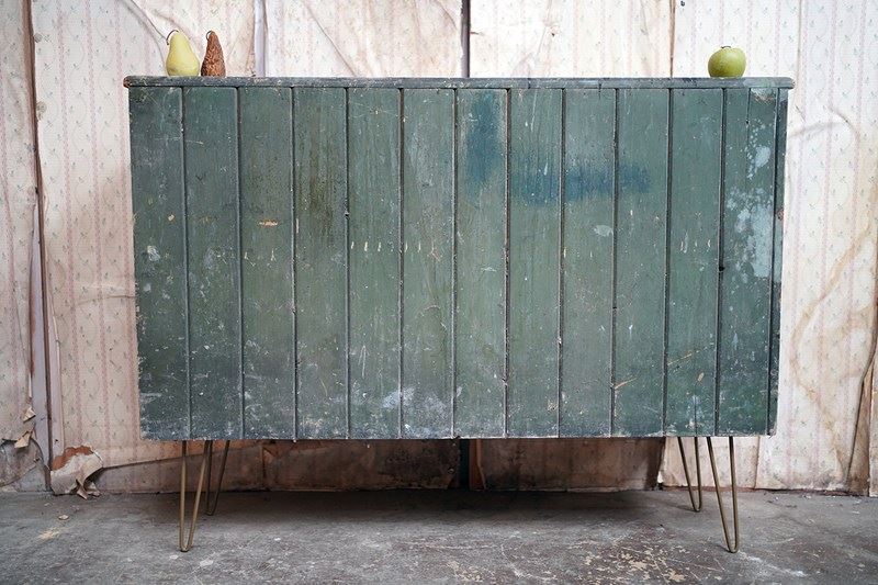 The mid-Victorian pine sideboard of pleasing proportions, the rectangular two-plank rustic top above two panelled doors opening to reveal a shelved interior, the carcass retaining a beautifully time-worn green paint surface, now softly muted and chalked through decades of use, with the recessed panels washed to a pale, almost limed tone, the whole raised on later hairpin legs, giving the piece a subtle lift and a gentle mid-century tension against its Victorian bones.