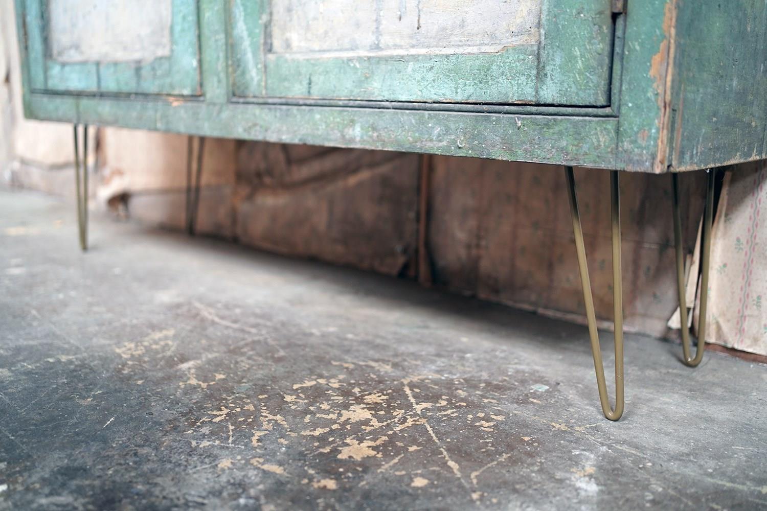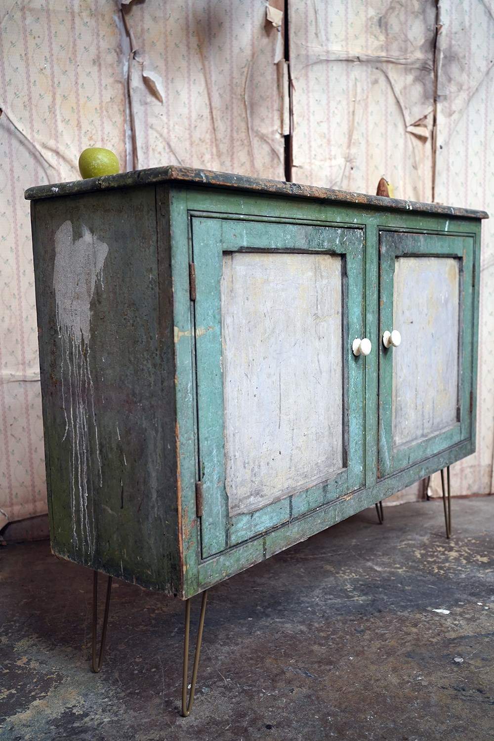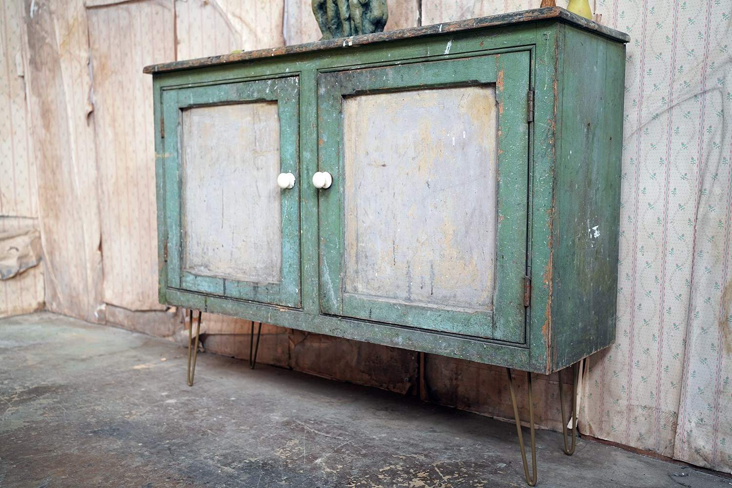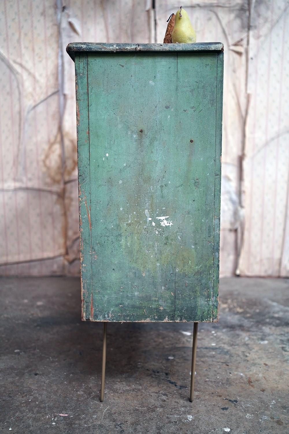 The mid-Victorian pine sideboard of pleasing proportions, the rectangular two-plank rustic top above two panelled doors opening to reveal a shelved interior, the carcass retaining a beautifully time-worn green paint surface, now softly muted and chalked through decades of use, with the recessed panels washed to a pale, almost limed tone, the whole raised on later hairpin legs, giving the piece a subtle lift and a gentle mid-century tension against its Victorian bones.