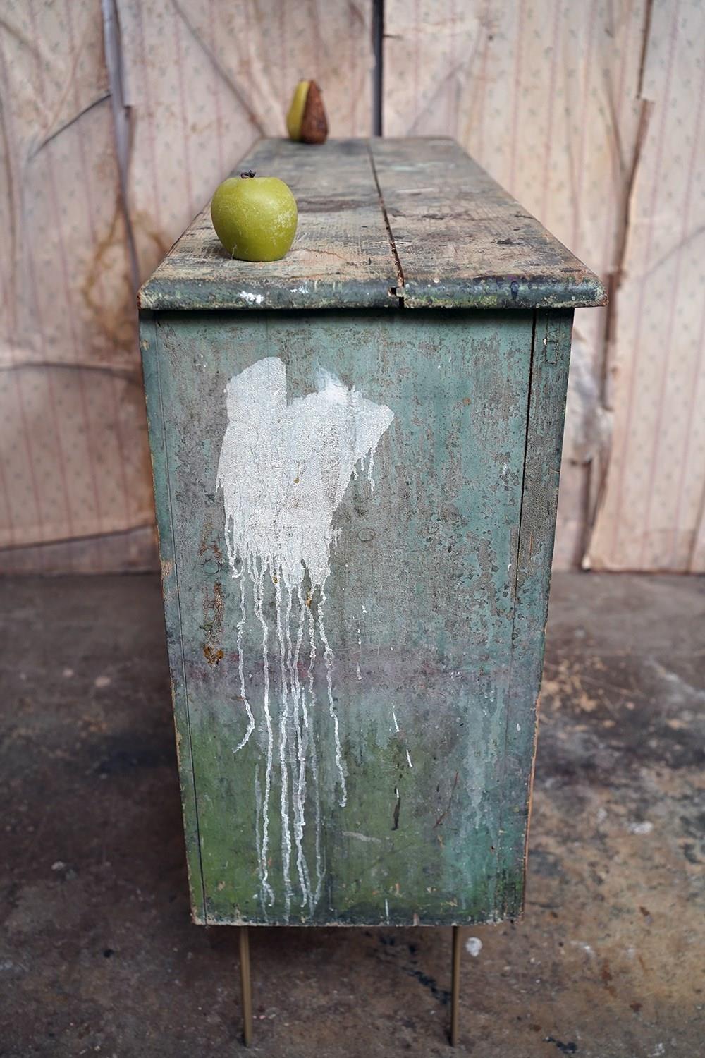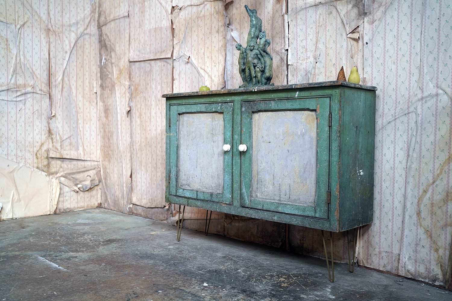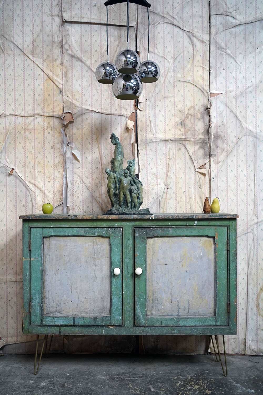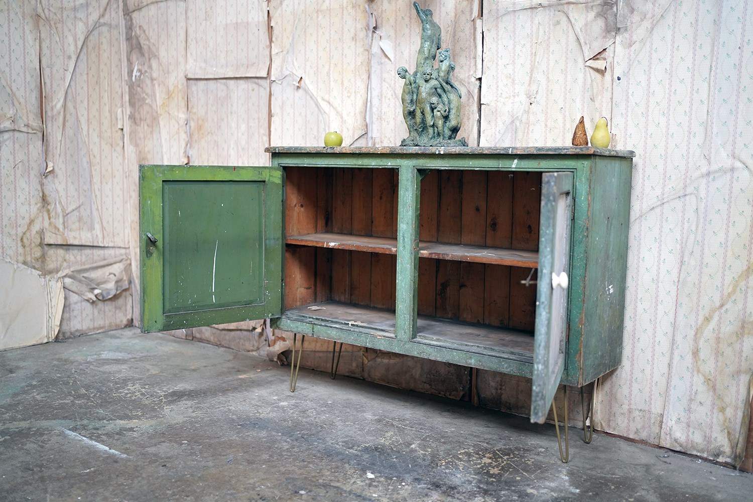 The mid-Victorian pine sideboard of pleasing proportions, the rectangular two-plank rustic top above two panelled doors opening to reveal a shelved interior, the carcass retaining a beautifully time-worn green paint surface, now softly muted and chalked through decades of use, with the recessed panels washed to a pale, almost limed tone, the whole raised on later hairpin legs, giving the piece a subtle lift and a gentle mid-century tension against its Victorian bones.
