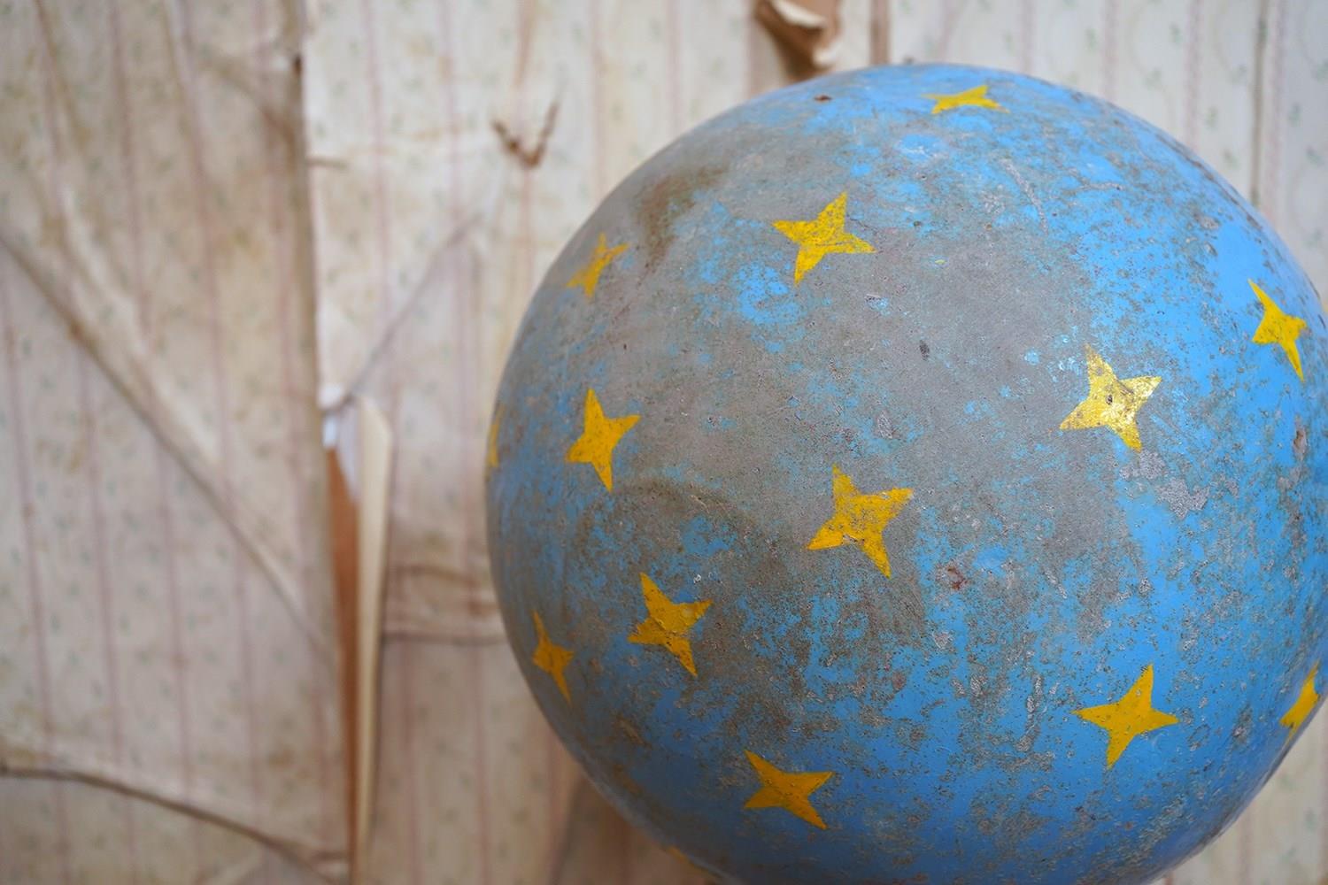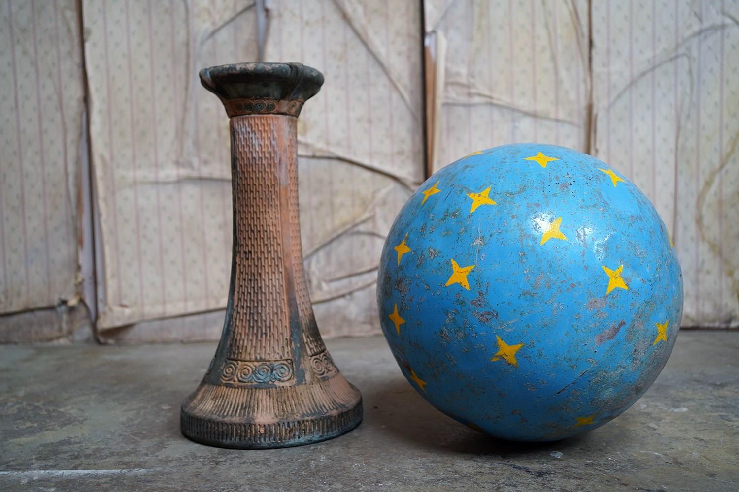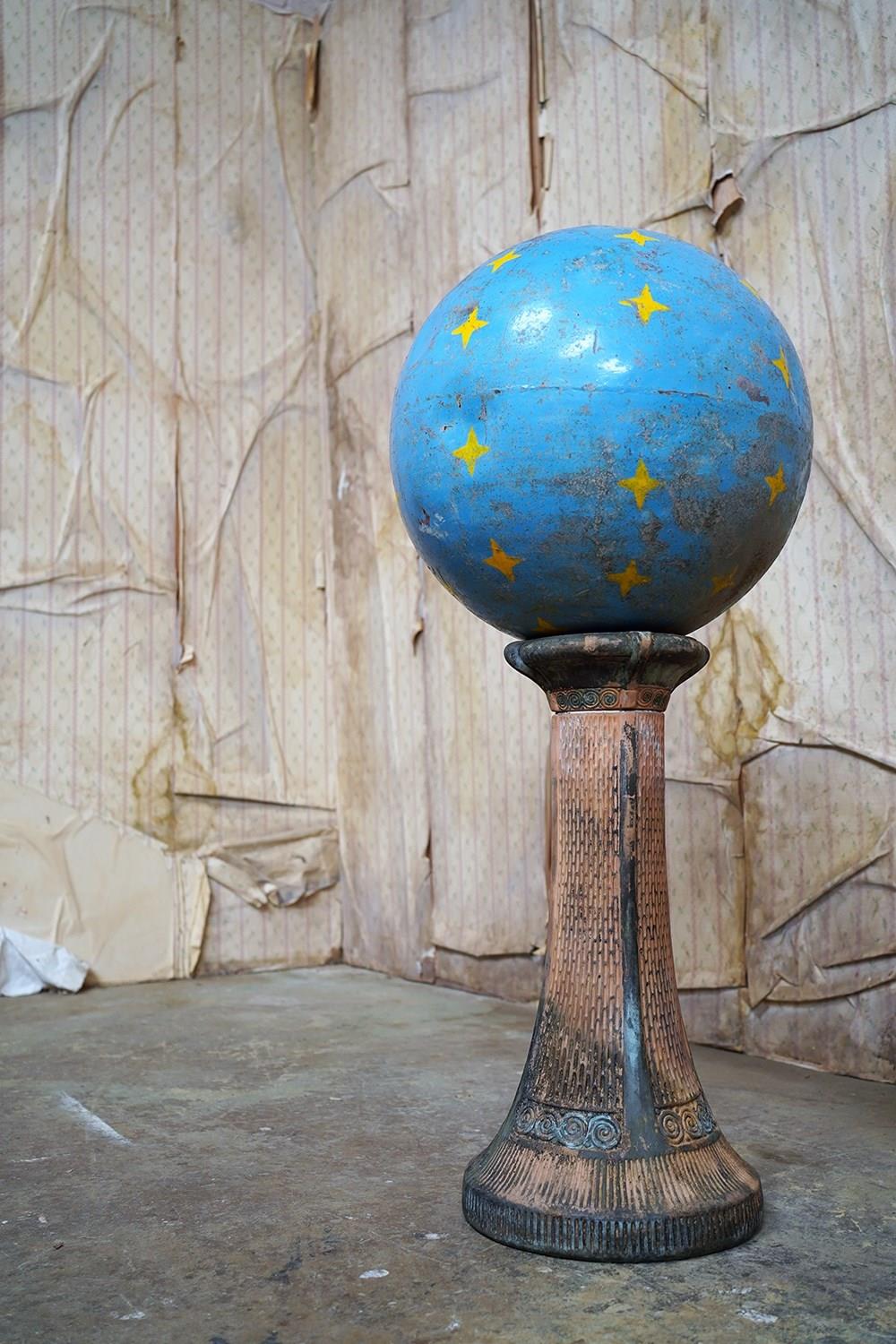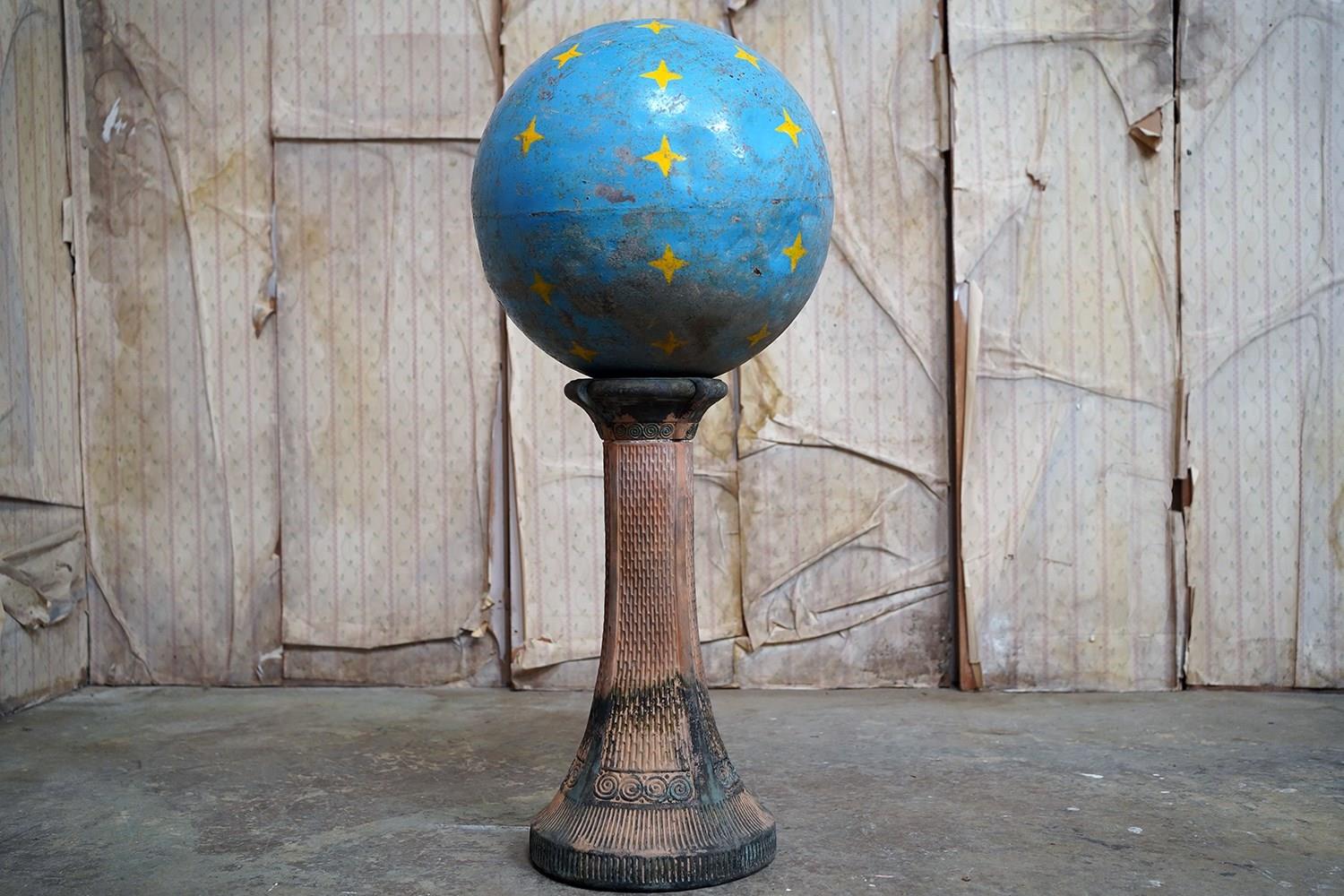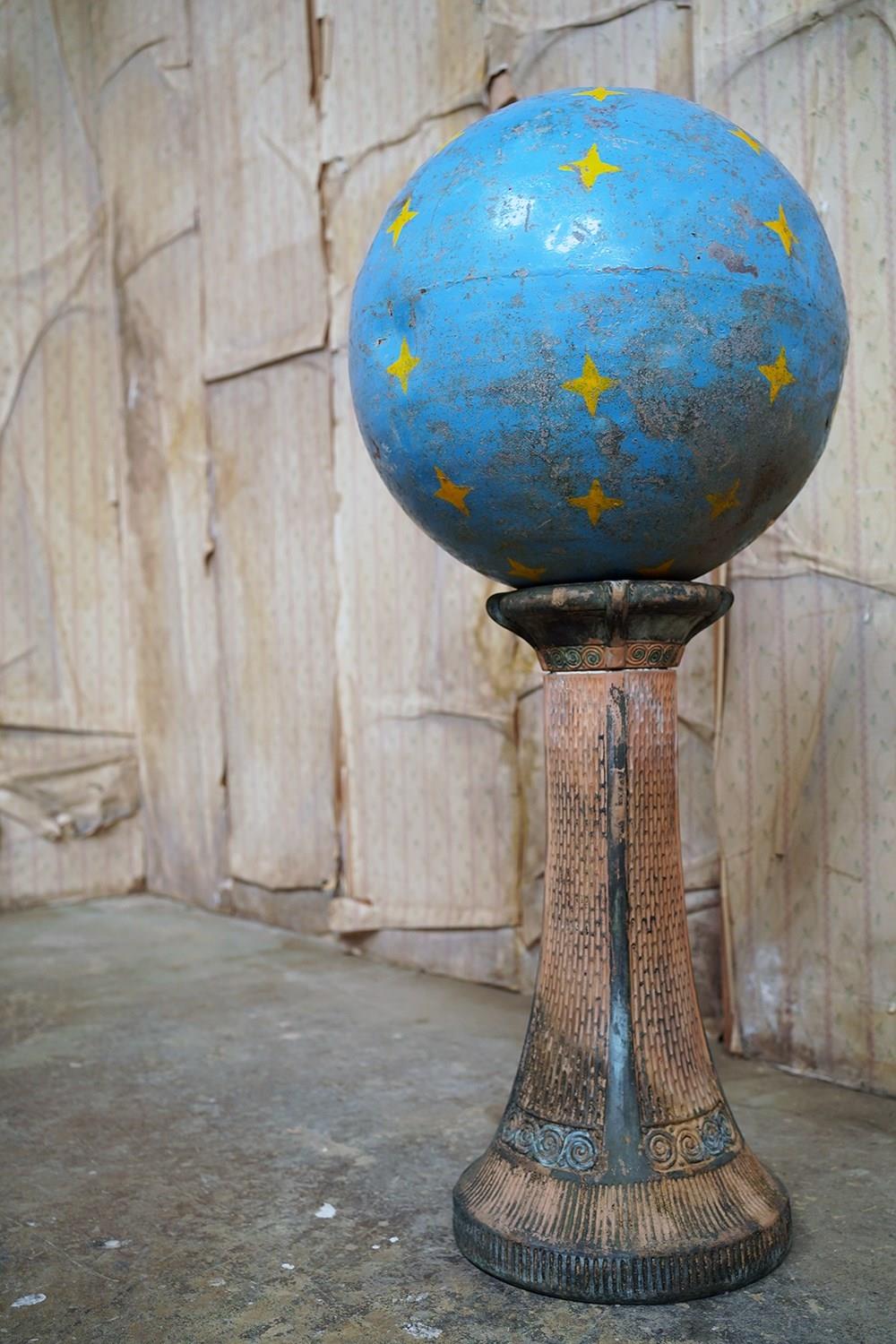 The very rarely seen painted sheet metal hollow circus act balancing ball, almost certainly used by larger animals due to its imposing size, namely the elephant, bear or walrus seal, the whole hand-painted in a sky blue ground with gold stars and later matched to a weathered terracotta pedestal with slightly dished top, the whole surviving from the second quarter of the twentieth century and an unknown travelling circus.