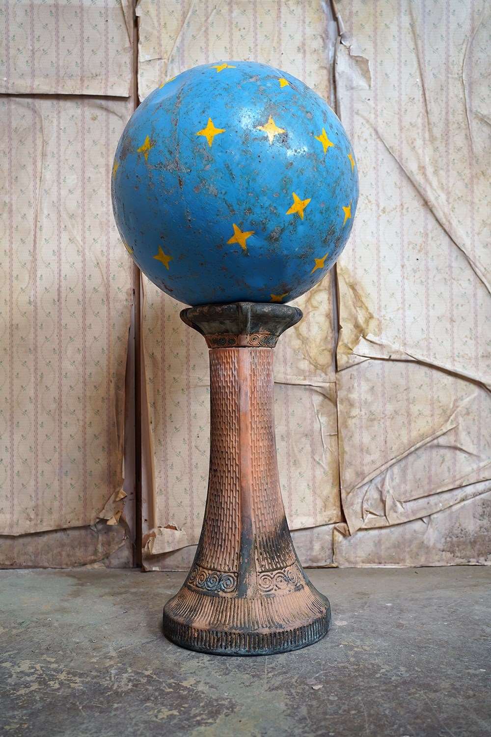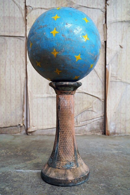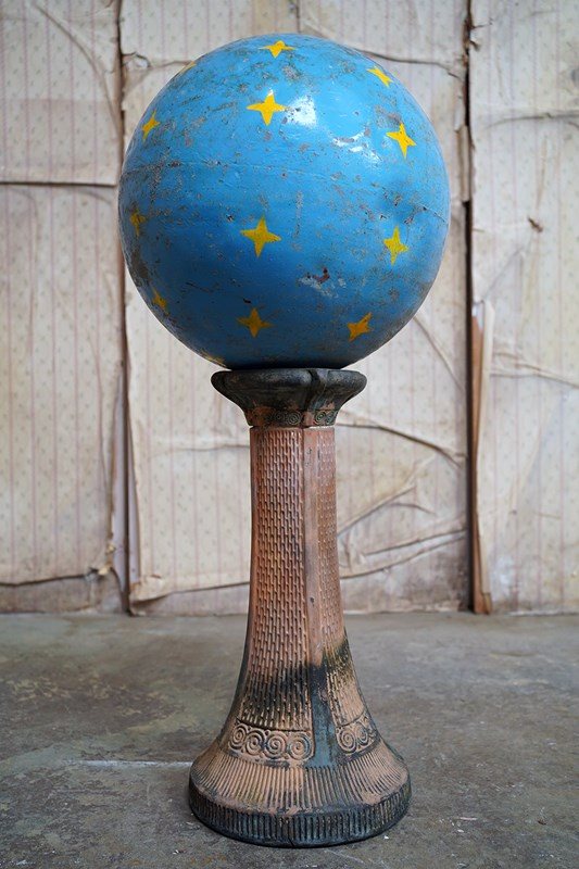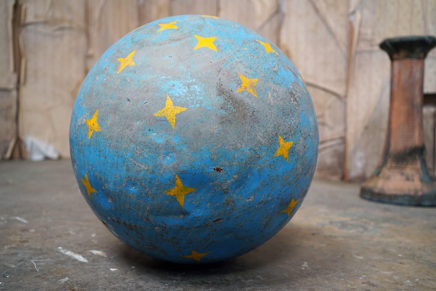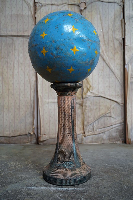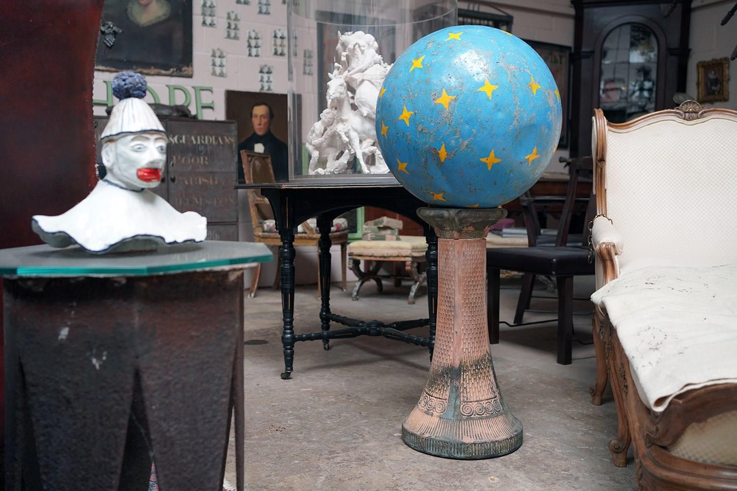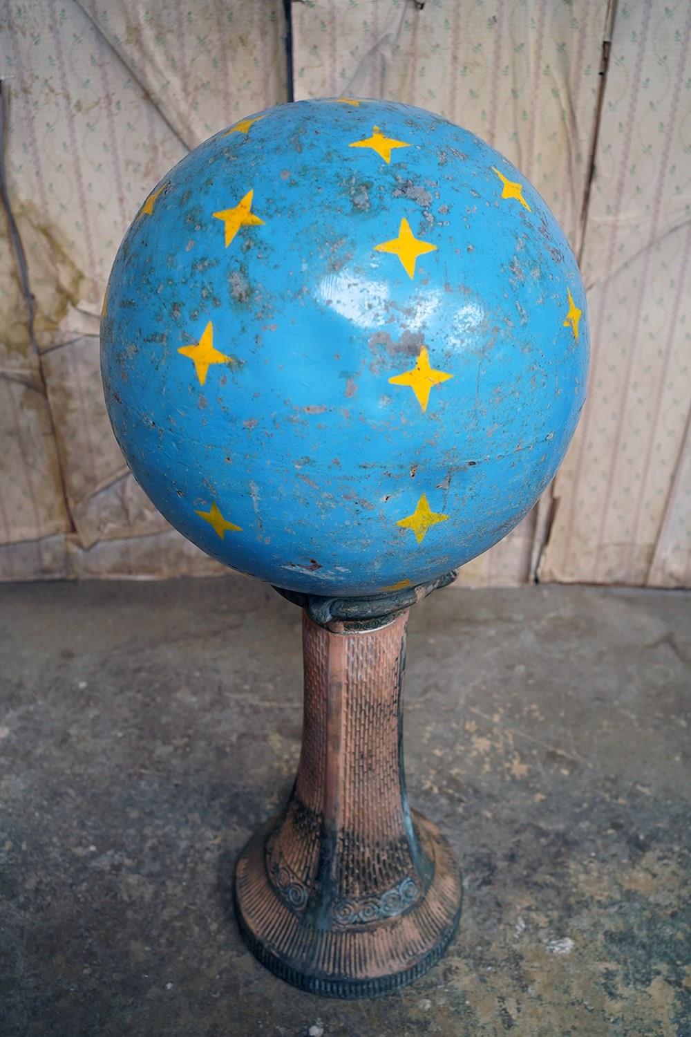 The very rarely seen painted sheet metal hollow circus act balancing ball, almost certainly used by larger animals due to its imposing size, namely the elephant, bear or walrus seal, the whole hand-painted in a sky blue ground with gold stars and later matched to a weathered terracotta pedestal with slightly dished top, the whole surviving from the second quarter of the twentieth century and an unknown travelling circus.