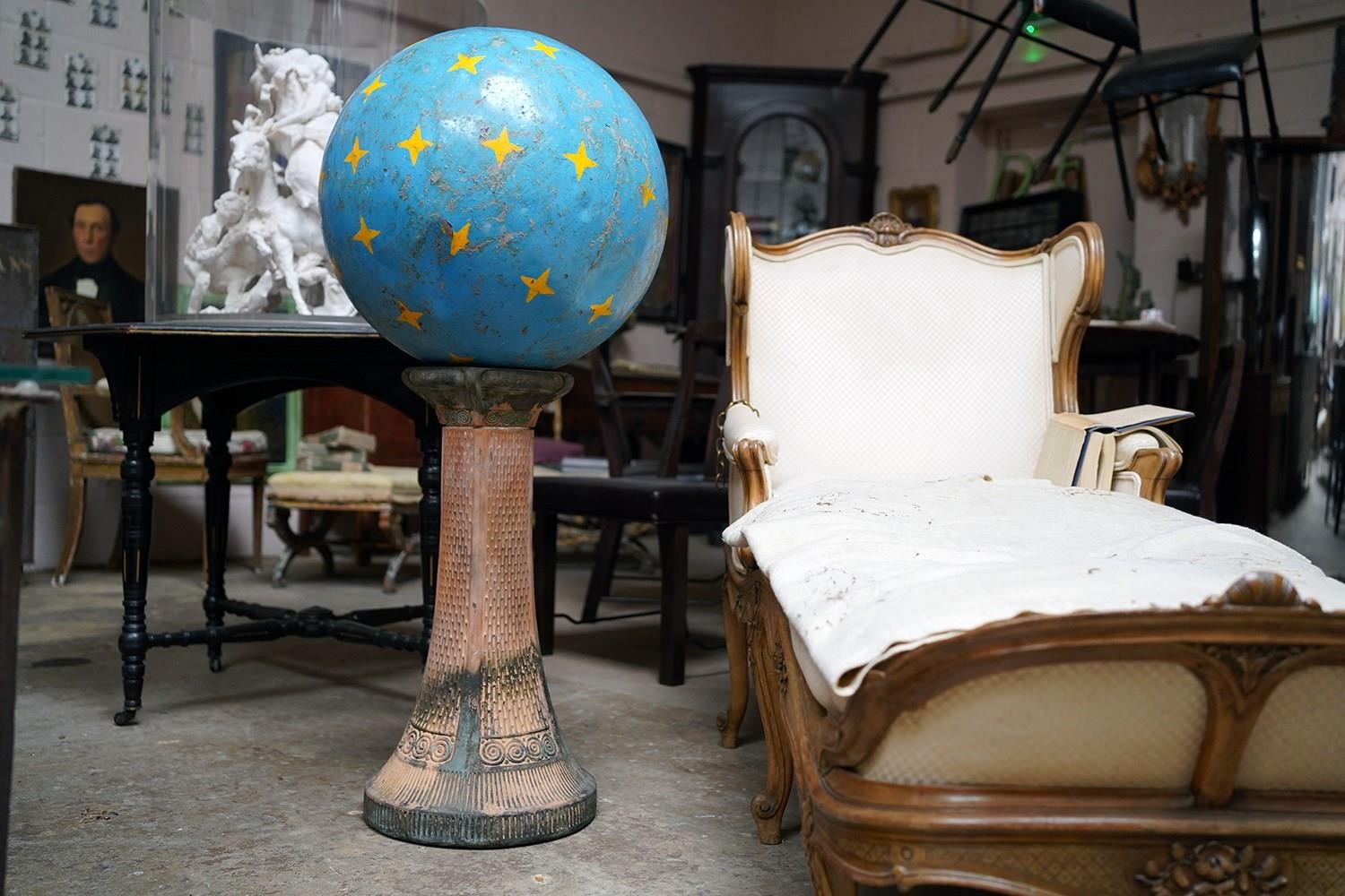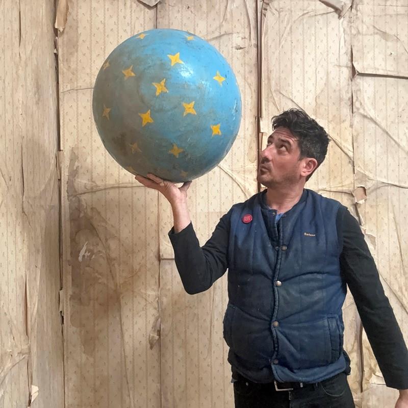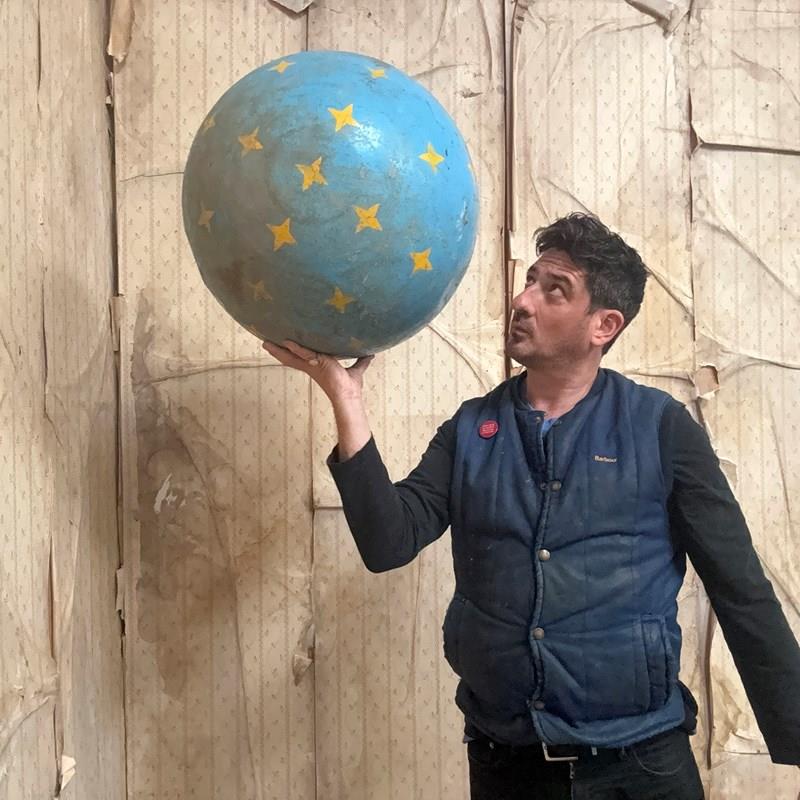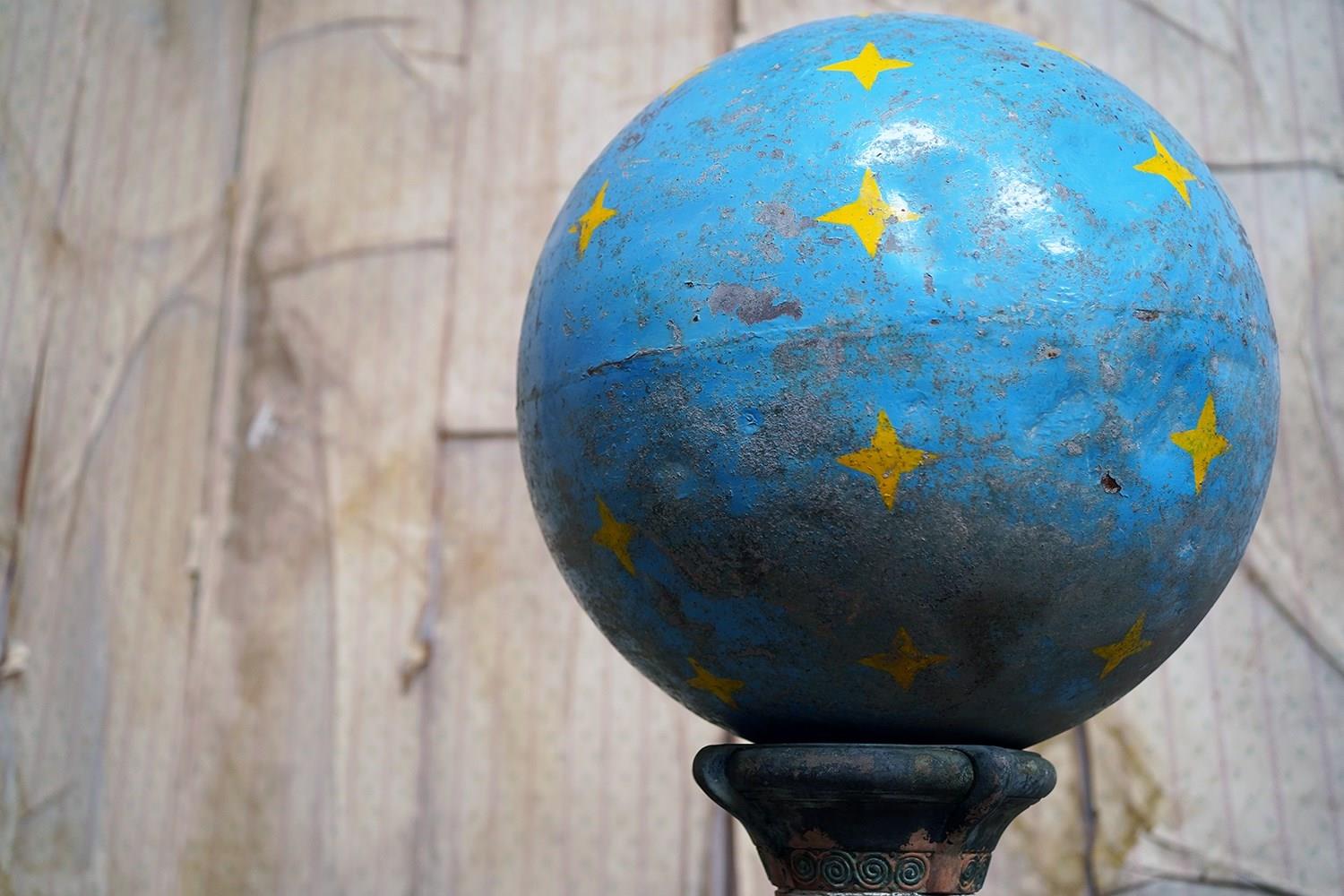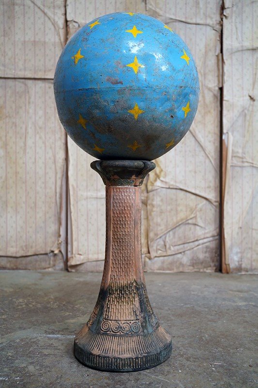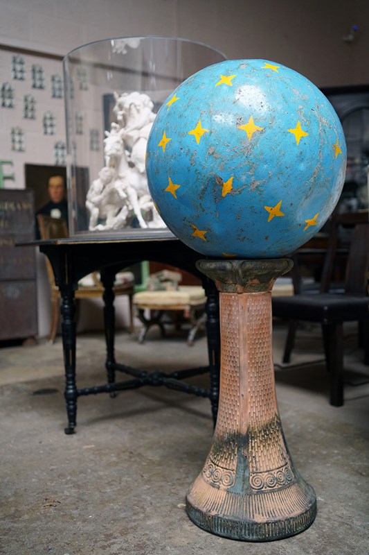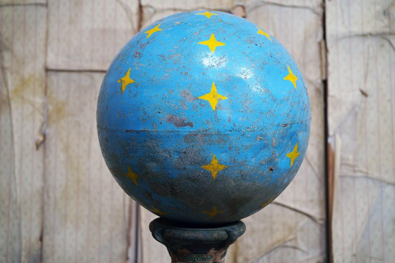 The very rarely seen painted sheet metal hollow circus act balancing ball, almost certainly used by larger animals due to its imposing size, namely the elephant, bear or walrus seal, the whole hand-painted in a sky blue ground with gold stars and later matched to a weathered terracotta pedestal with slightly dished top, the whole surviving from the second quarter of the twentieth century and an unknown travelling circus.
