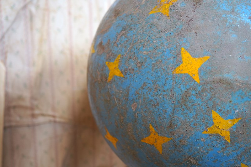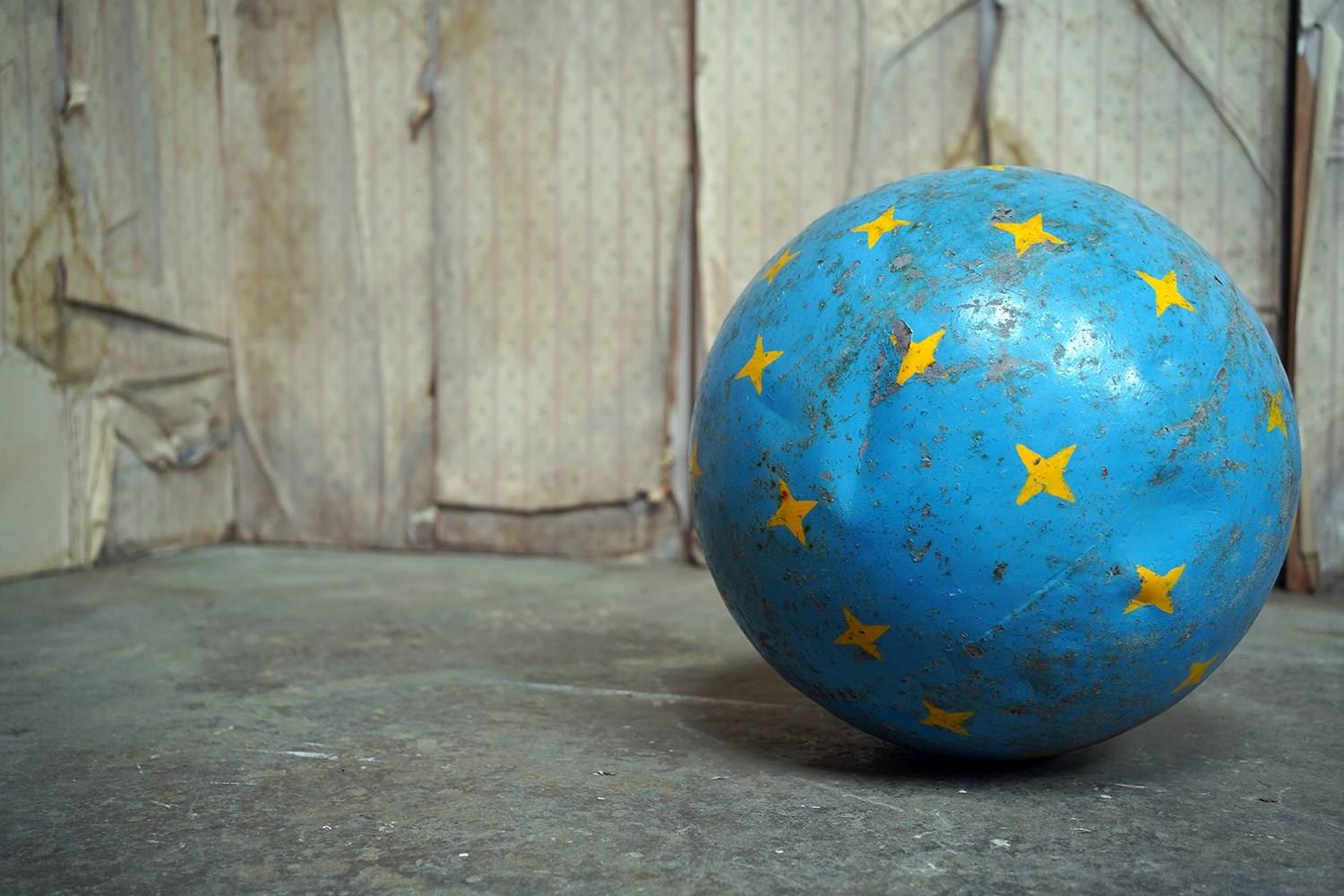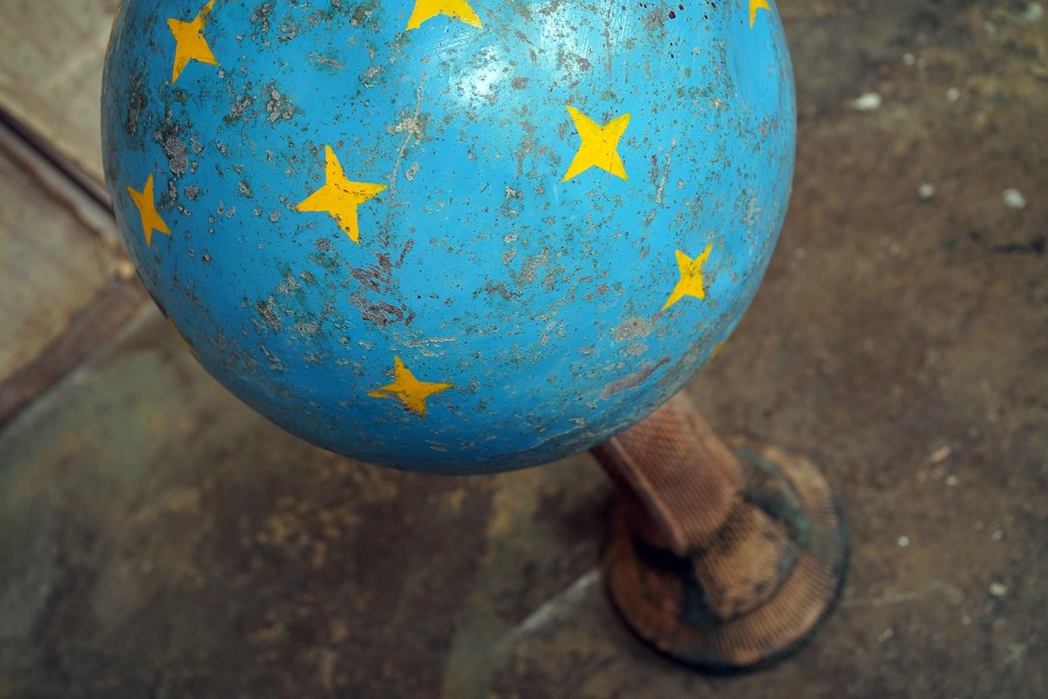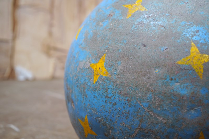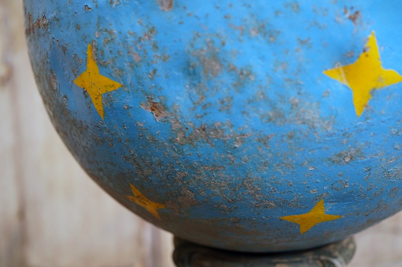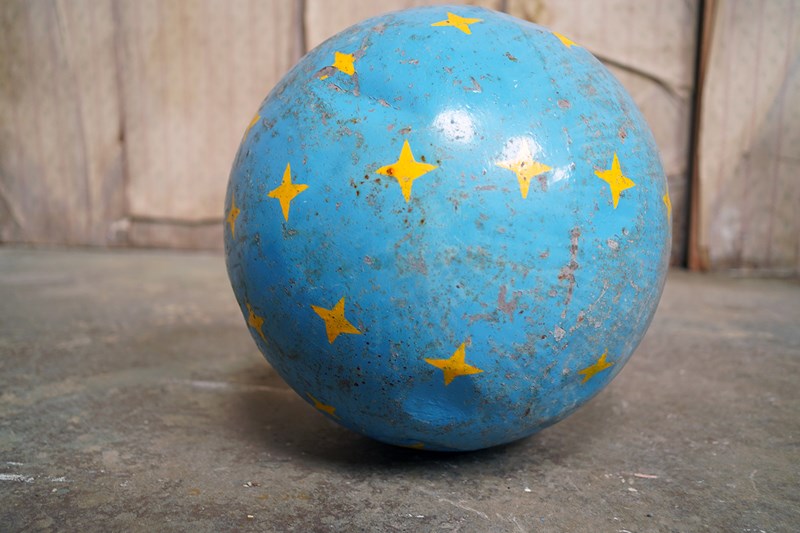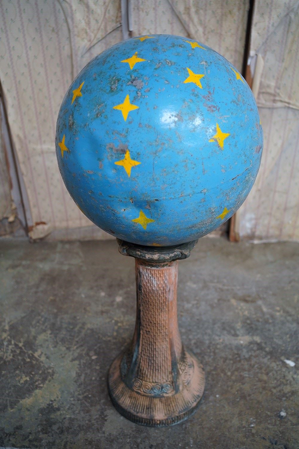 The very rarely seen painted sheet metal hollow circus act balancing ball, almost certainly used by larger animals due to its imposing size, namely the elephant, bear or walrus seal, the whole hand-painted in a sky blue ground with gold stars and later matched to a weathered terracotta pedestal with slightly dished top, the whole surviving from the second quarter of the twentieth century and an unknown travelling circus.