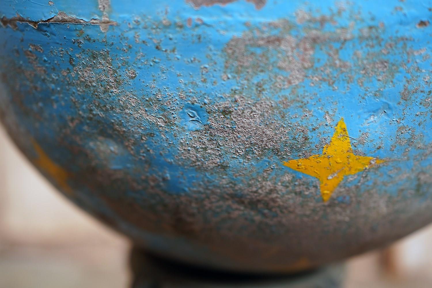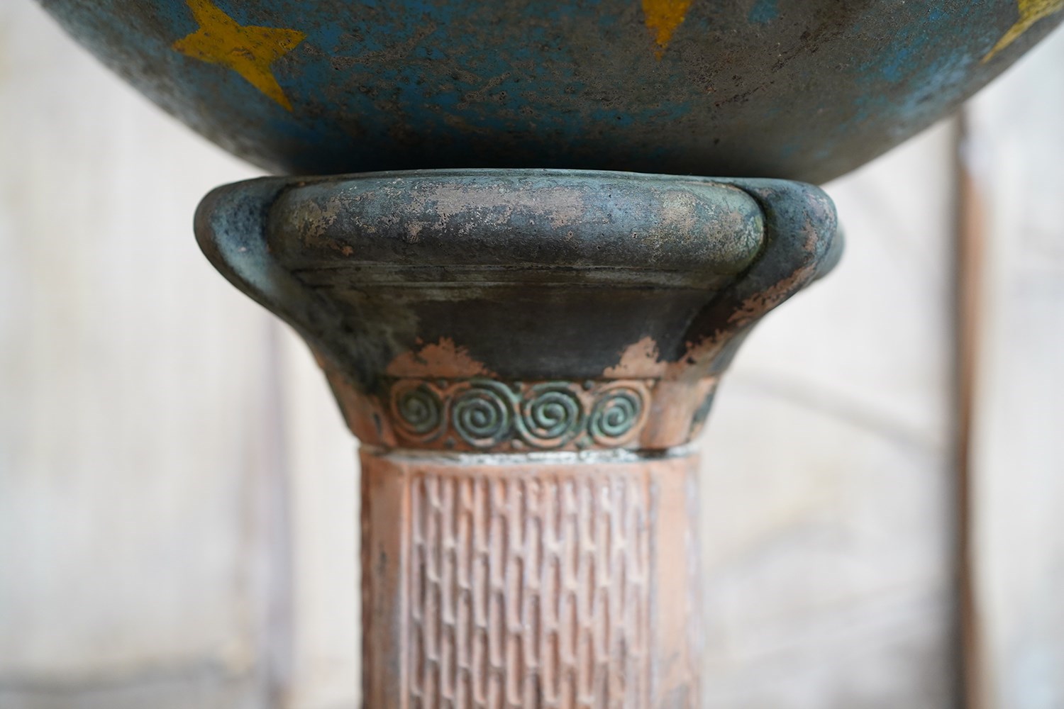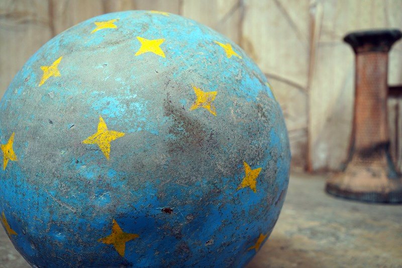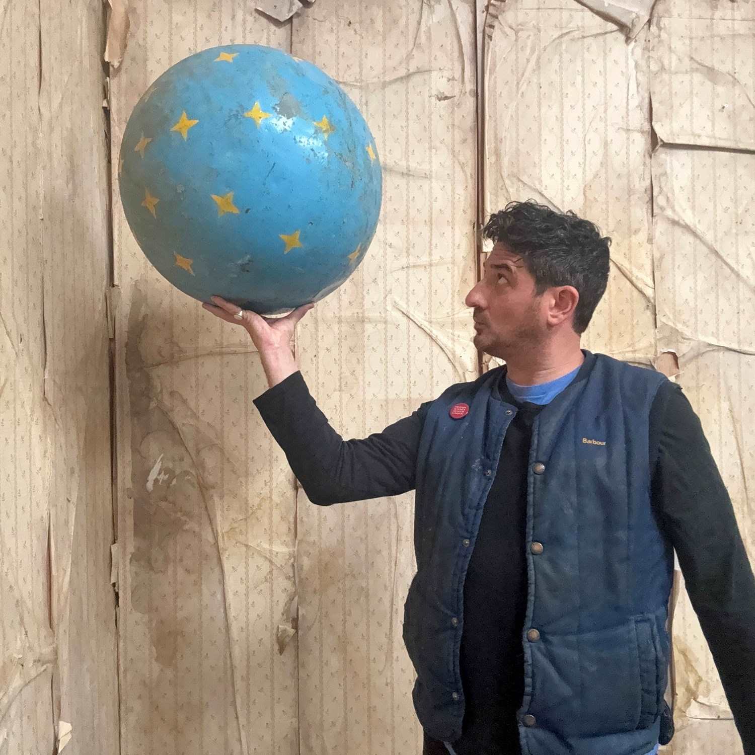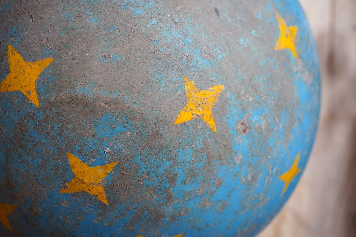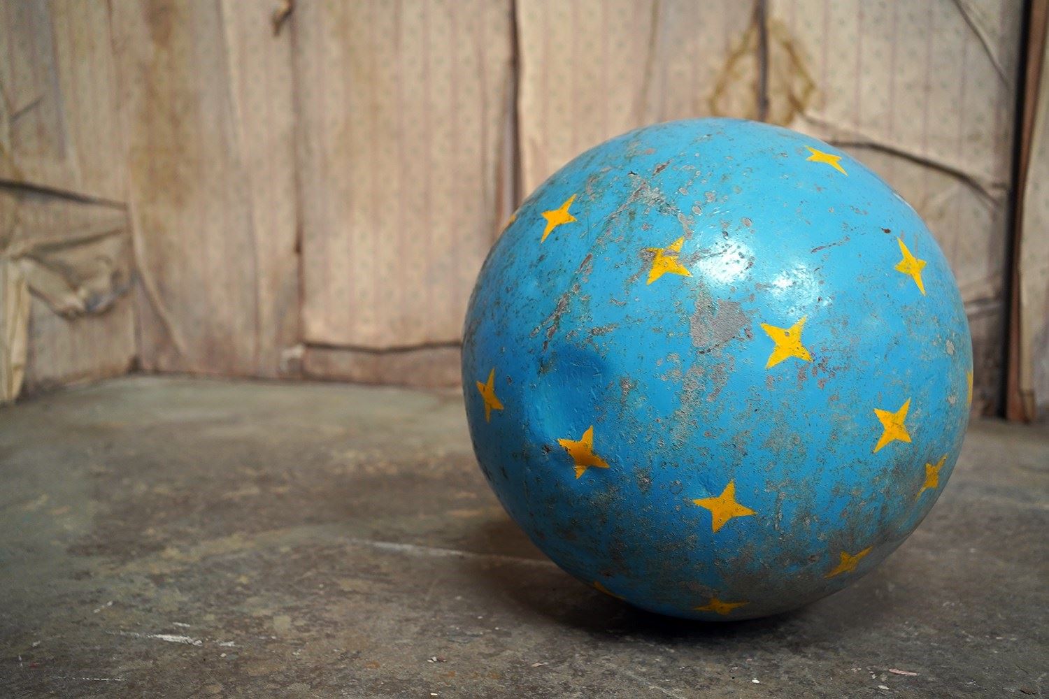 The very rarely seen painted sheet metal hollow circus act balancing ball, almost certainly used by larger animals due to its imposing size, namely the elephant, bear or walrus seal, the whole hand-painted in a sky blue ground with gold stars and later matched to a weathered terracotta pedestal with slightly dished top, the whole surviving from the second quarter of the twentieth century and an unknown travelling circus.
