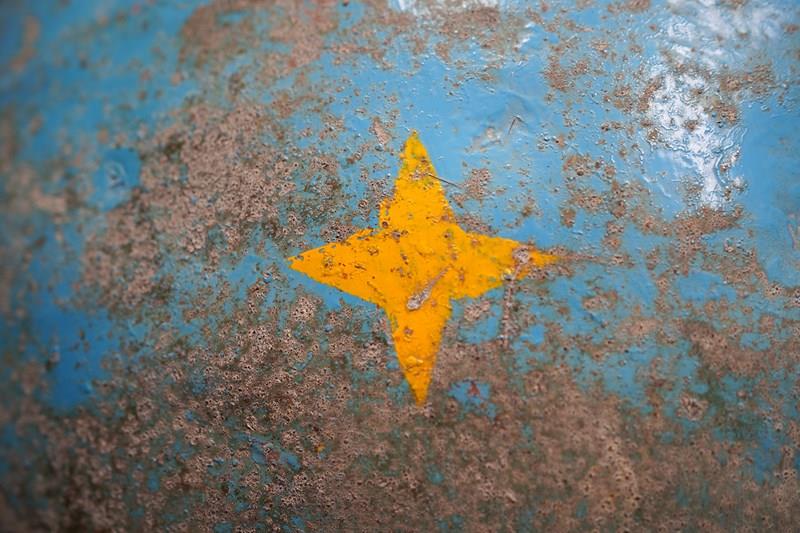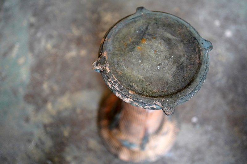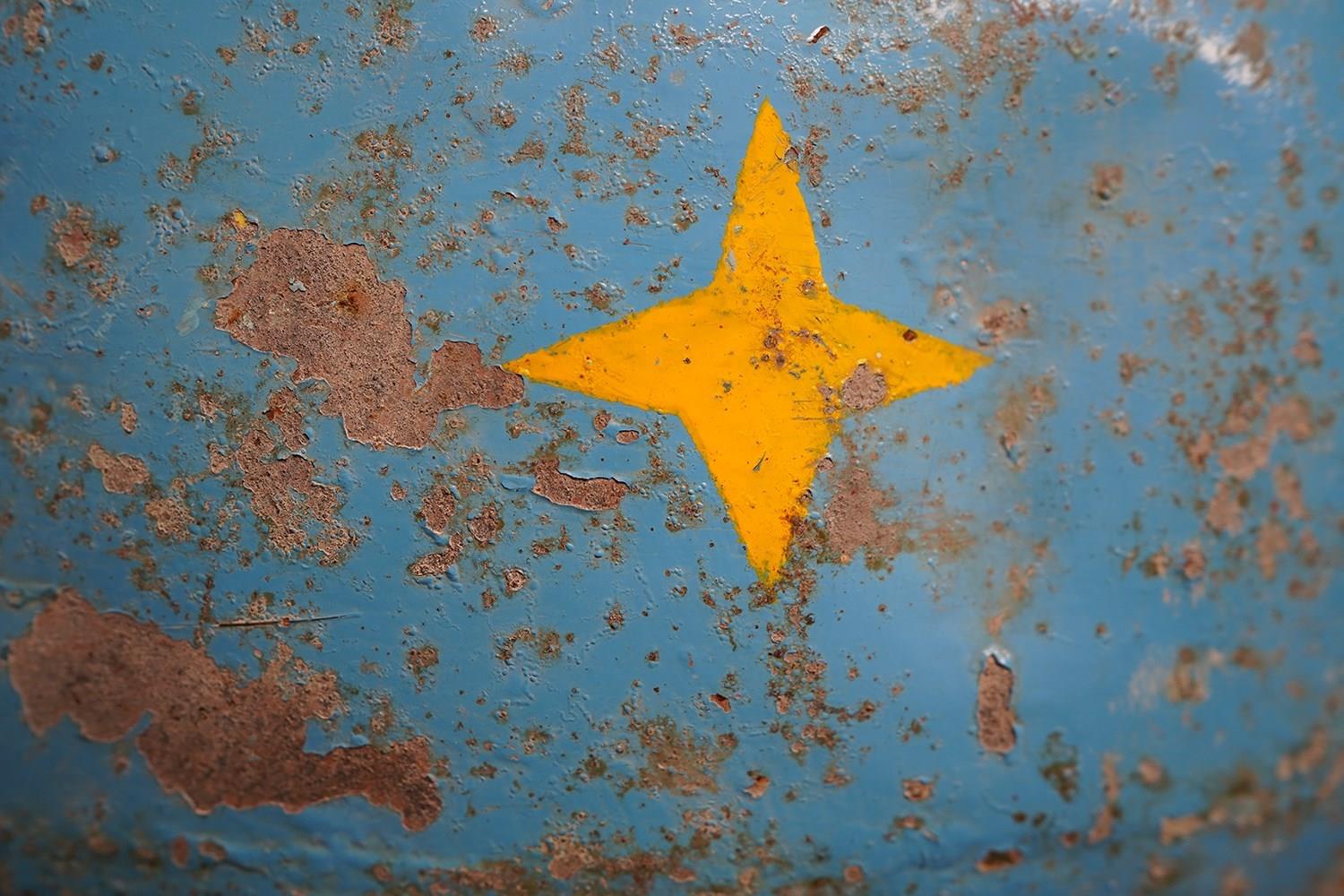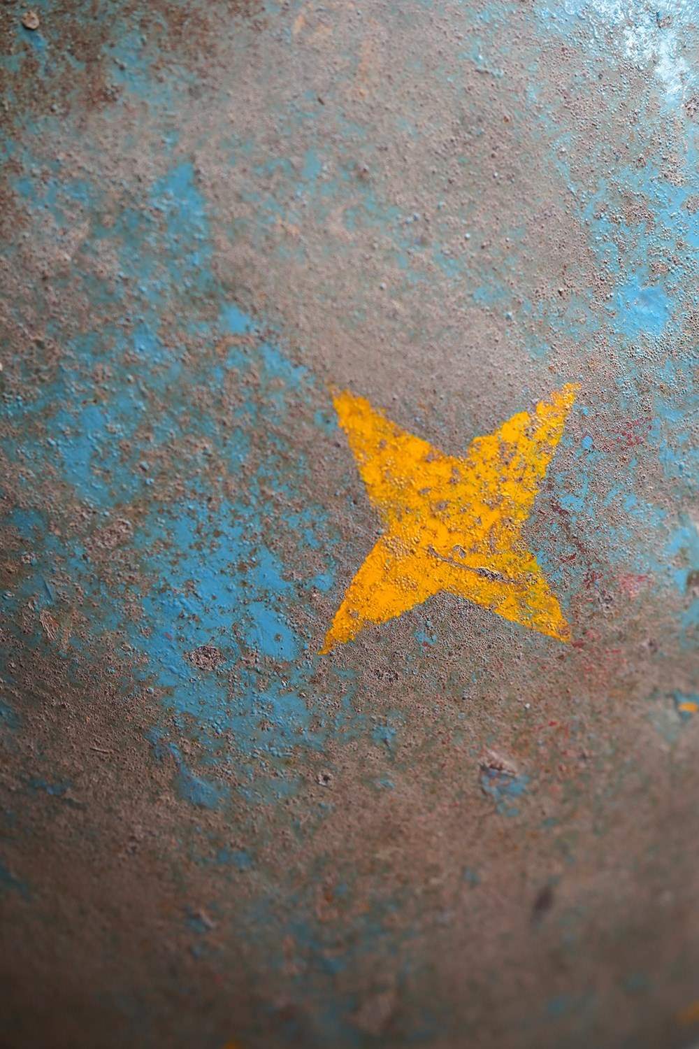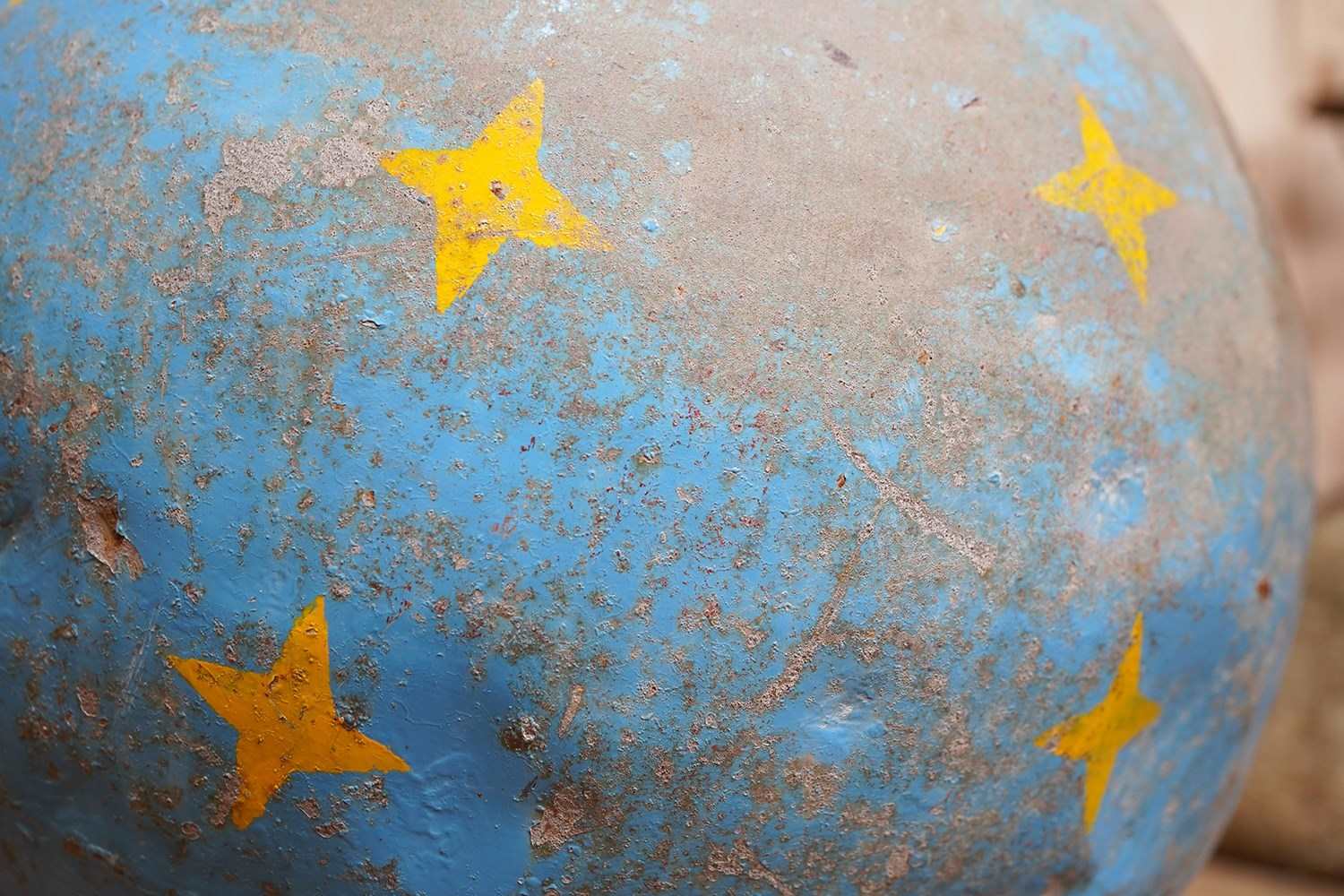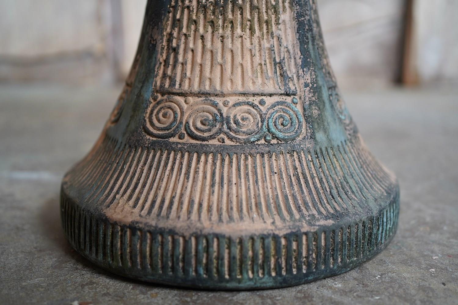 The very rarely seen painted sheet metal hollow circus act balancing ball, almost certainly used by larger animals due to its imposing size, namely the elephant, bear or walrus seal, the whole hand-painted in a sky blue ground with gold stars and later matched to a weathered terracotta pedestal with slightly dished top, the whole surviving from the second quarter of the twentieth century and an unknown travelling circus.