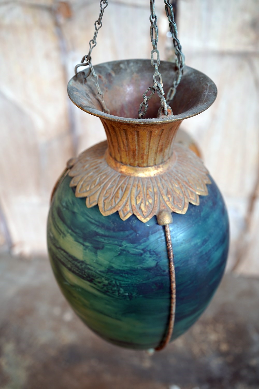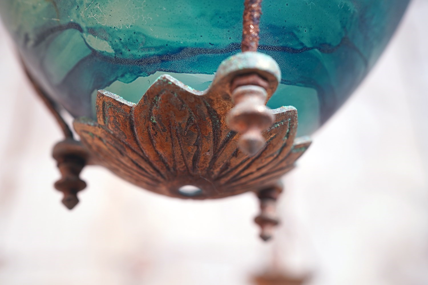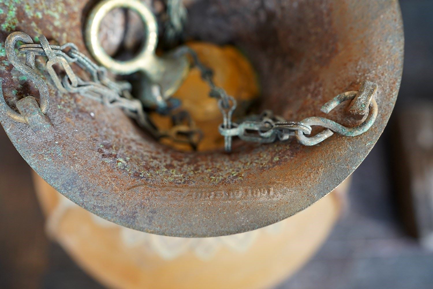 Both bottles show age and use consistent with their period. The painted glass retains its original finish with areas of light rubbing and surface wear that contribute to a pleasing time-softened patina. The metal mounts show oxidation and surface wear, particularly to the stabilising bands and interior surfaces of the collars, while the suspension chains remain intact. The collars are stamped “PAT. JUNE 16 1891”, indicating the mounts were manufactured under a late-19th-century patent designed to suspend heavy glass vessels safely by distributing the weight across the body of the bottle rather than the fragile neck.