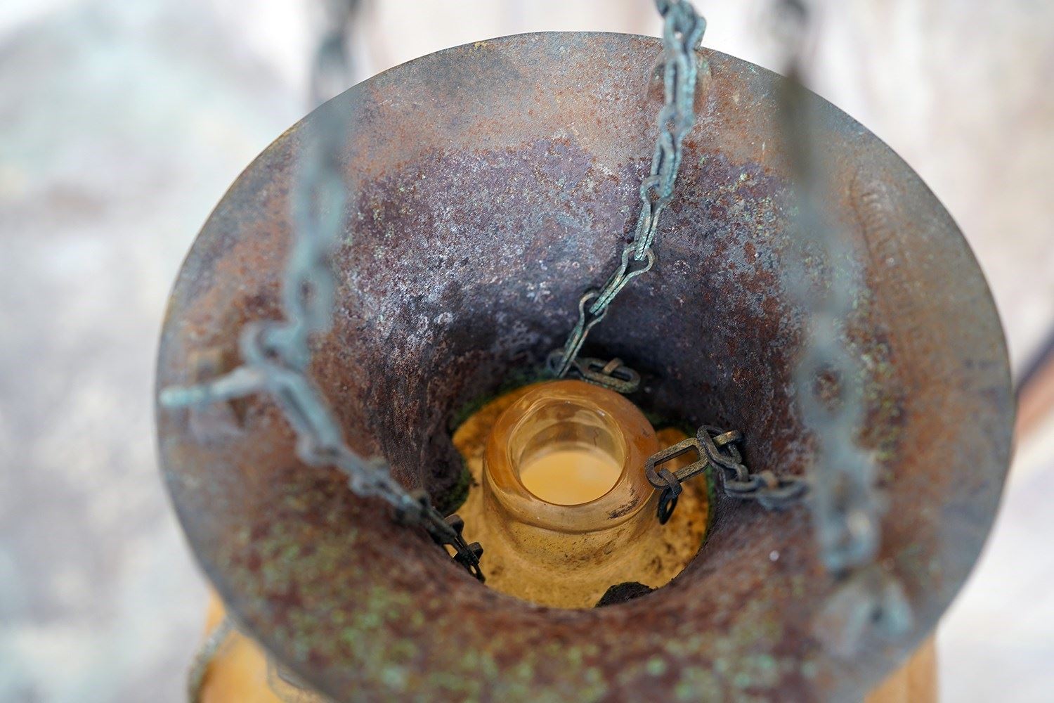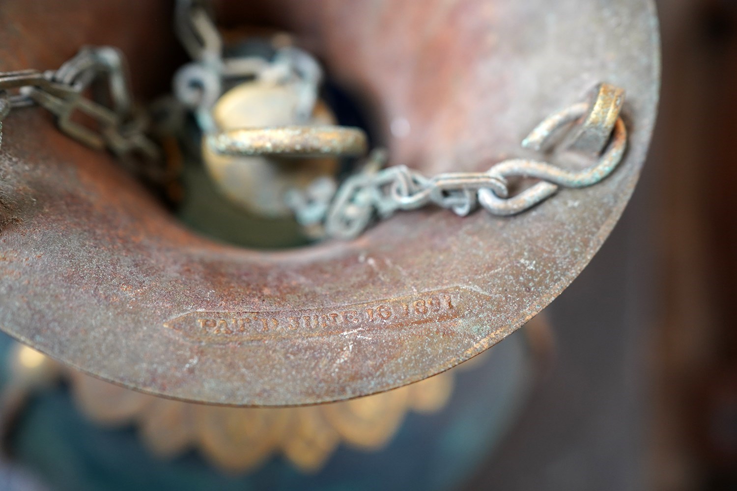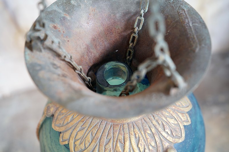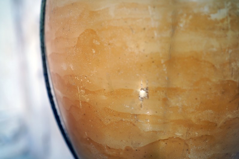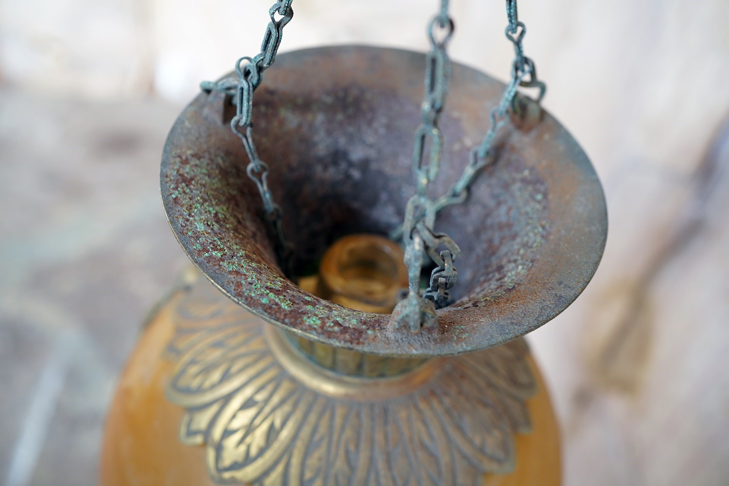 Both bottles show age and use consistent with their period. The painted glass retains its original finish with areas of light rubbing and surface wear that contribute to a pleasing time-softened patina. The metal mounts show oxidation and surface wear, particularly to the stabilising bands and interior surfaces of the collars, while the suspension chains remain intact. The collars are stamped “PAT. JUNE 16 1891”, indicating the mounts were manufactured under a late-19th-century patent designed to suspend heavy glass vessels safely by distributing the weight across the body of the bottle rather than the fragile neck.