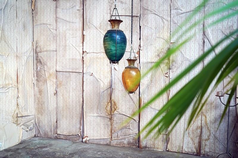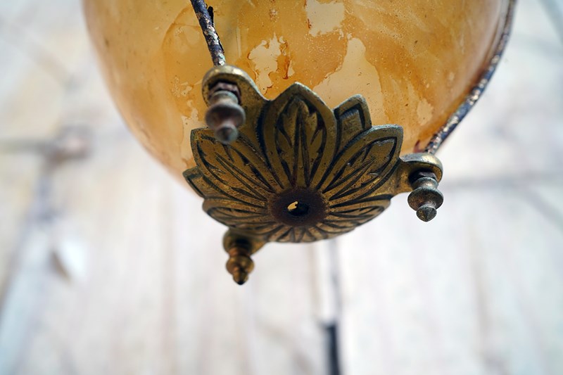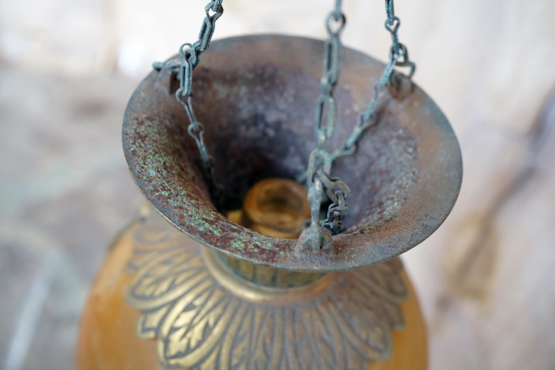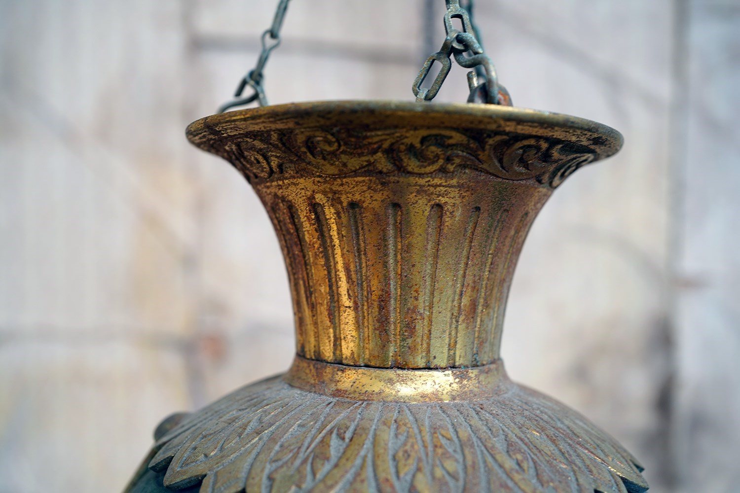 Pair Of Gilt Metal & Painted Glass Hanging Apothecary Display Carboys C.1891