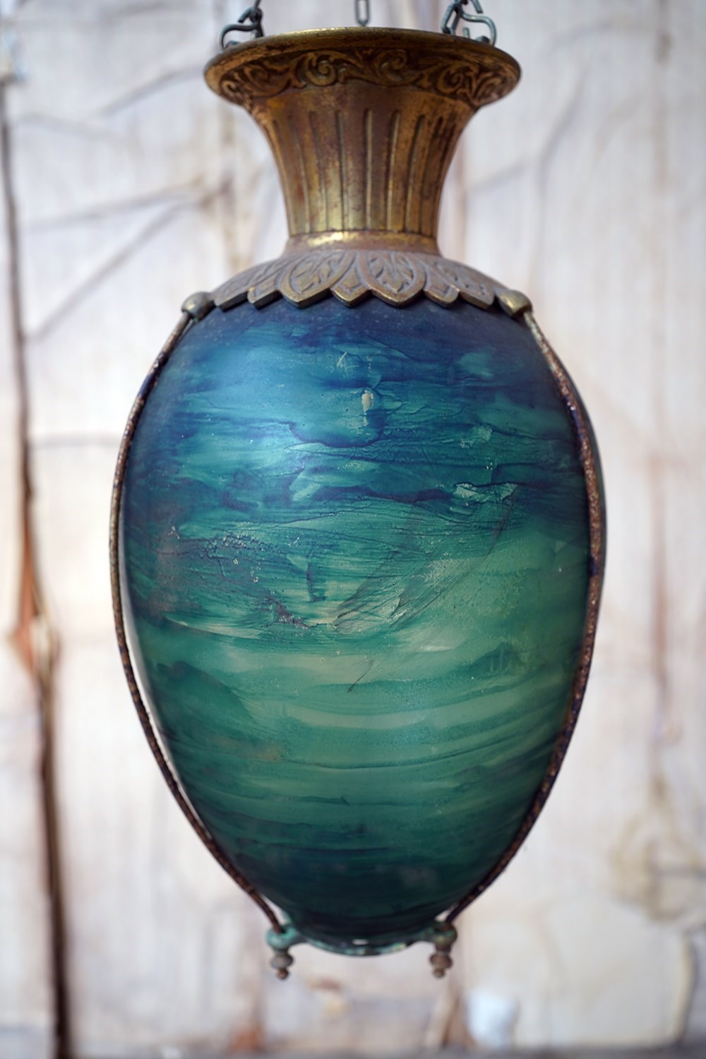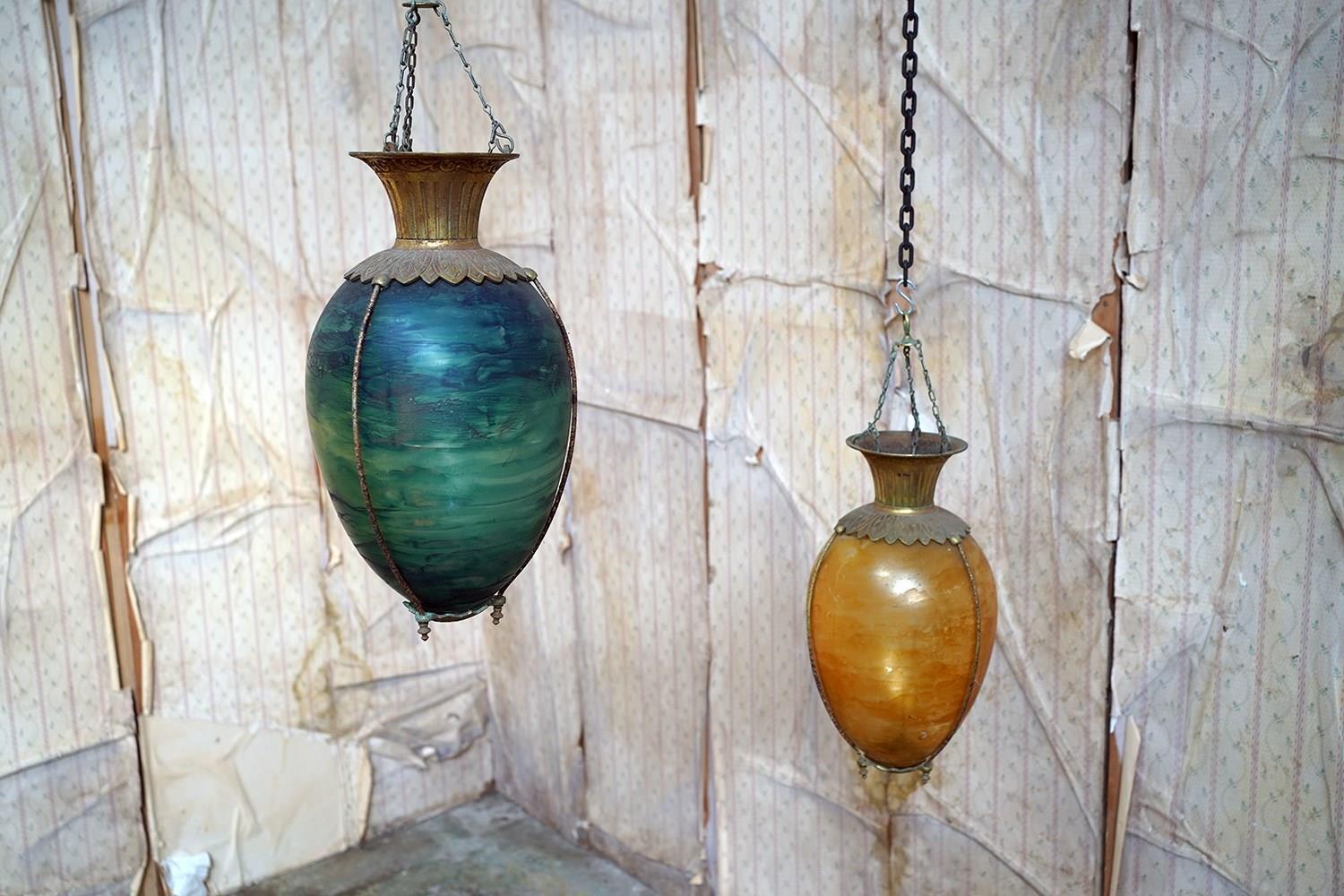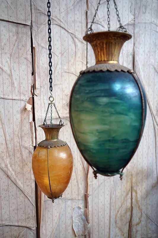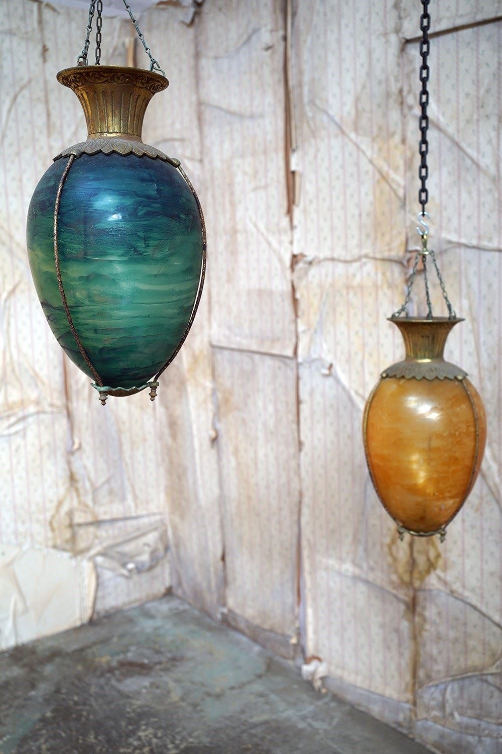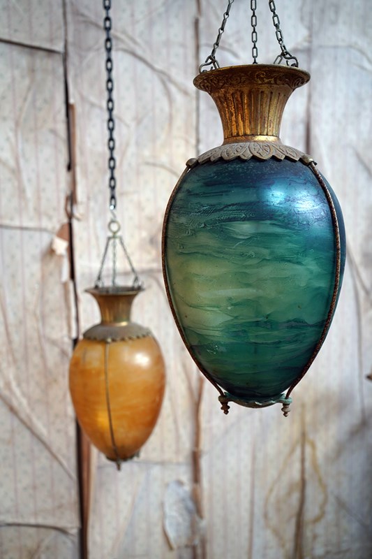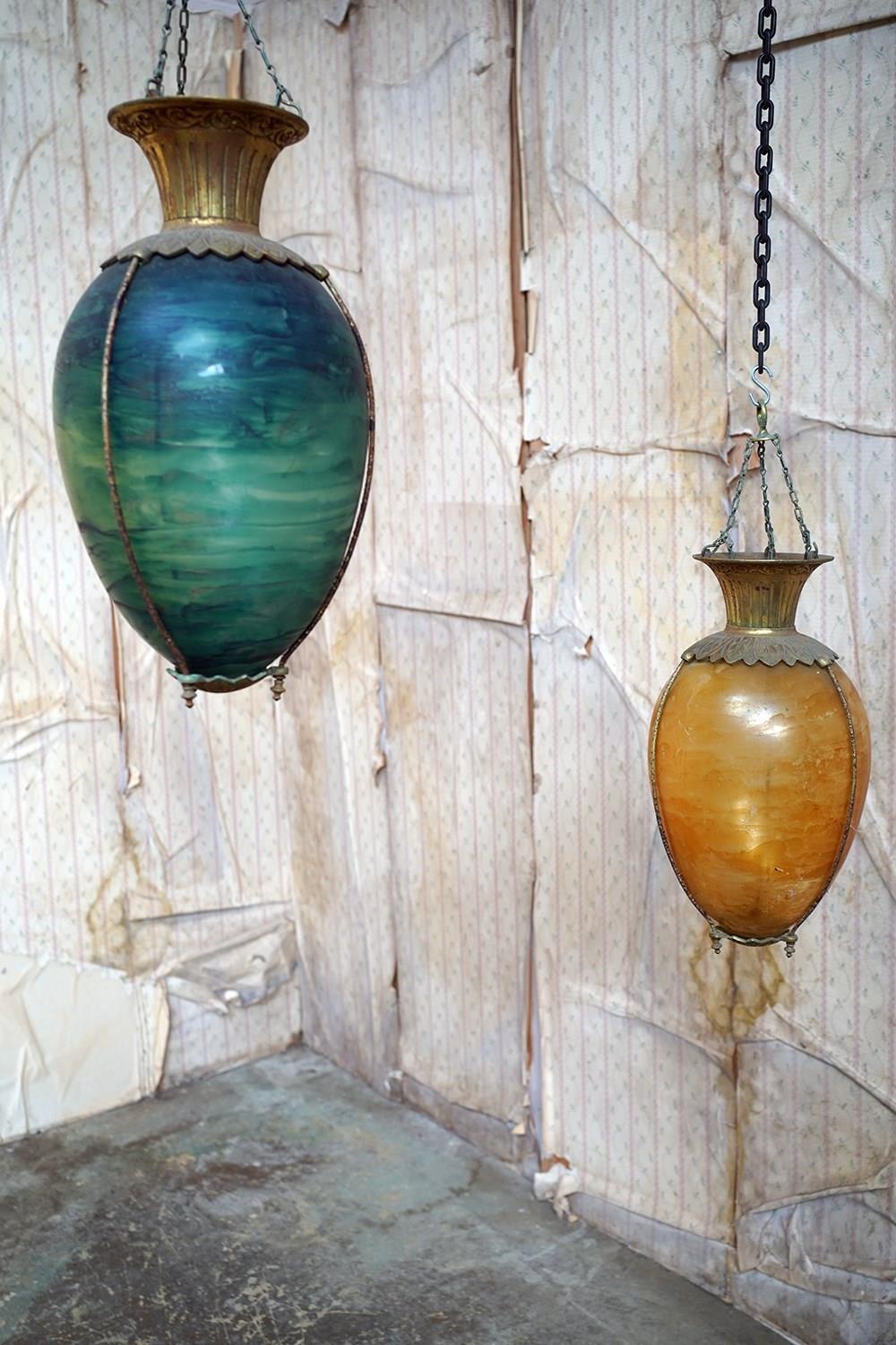 The rare and unusual pair of hanging apothecary display carboys each of generous ovoid form and formed from thick hand-blown glass with swirling painted surfaces, one in a warm amber tone and the other in a deep malachite green, each mounted within a decorative gilt metal suspension collar with scalloped foliate mount and encircling stabilising band, from which three chains rise to a suspension ring, allowing the bottles to hang freely, the mottled painted surfaces of the glass create a richly mineral appearance reminiscent of onyx or malachite, and when illuminated the glass takes on a soft glowing quality that gives the pieces considerable sculptural presence, the wholes after a patent of June 16th 1891.