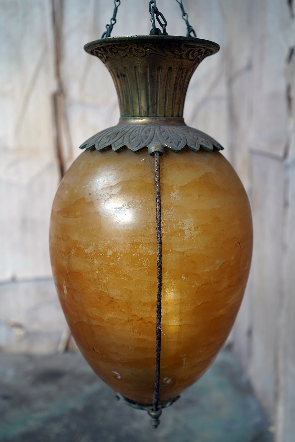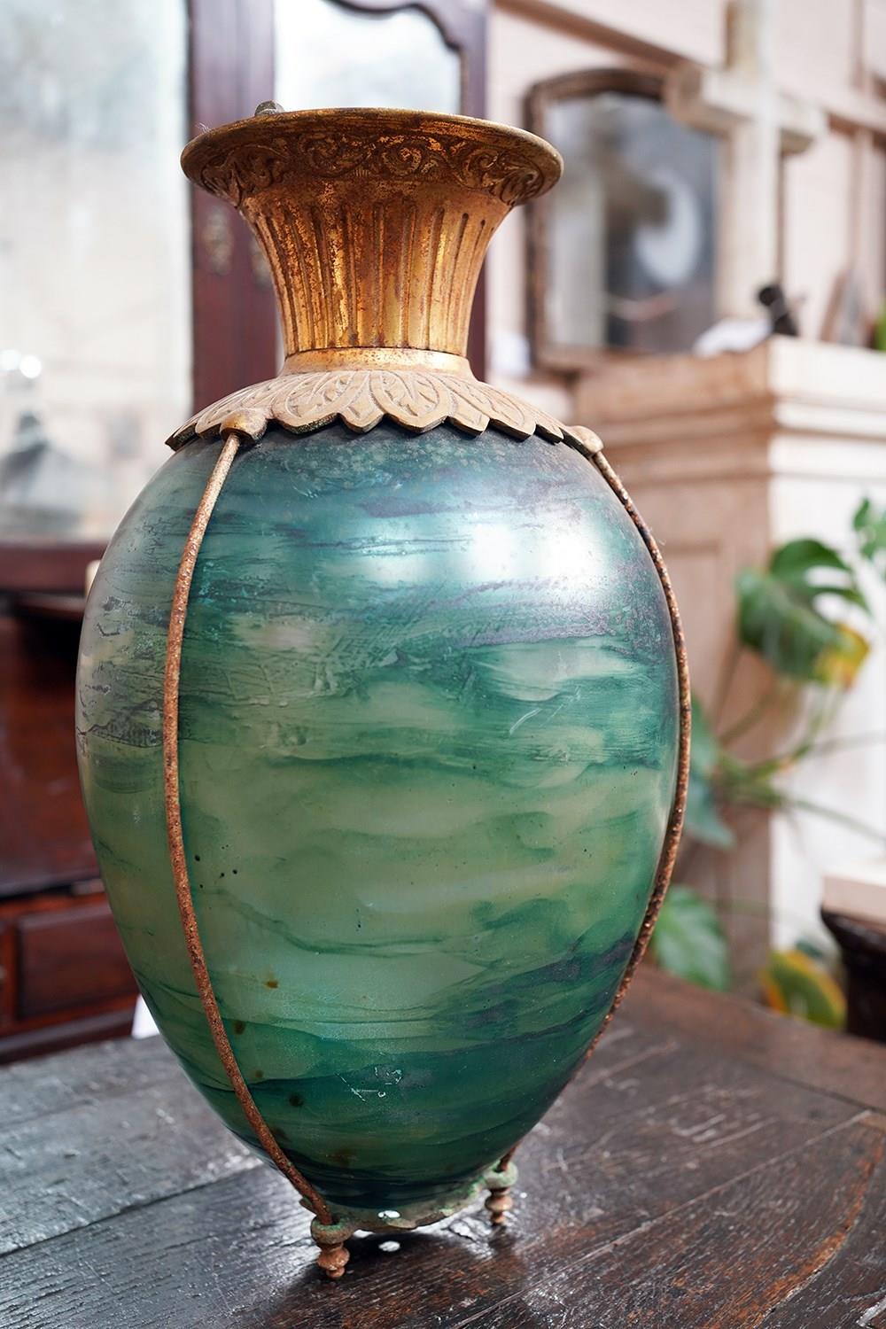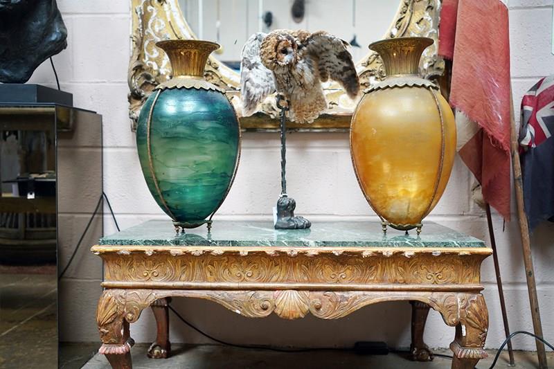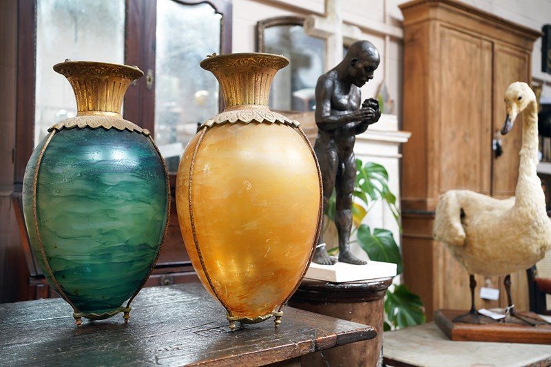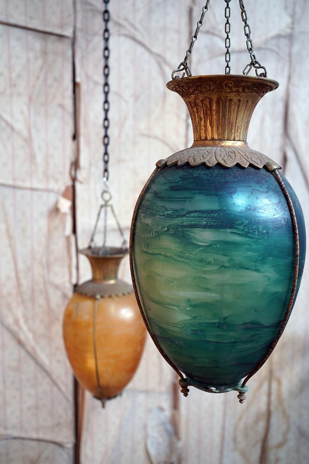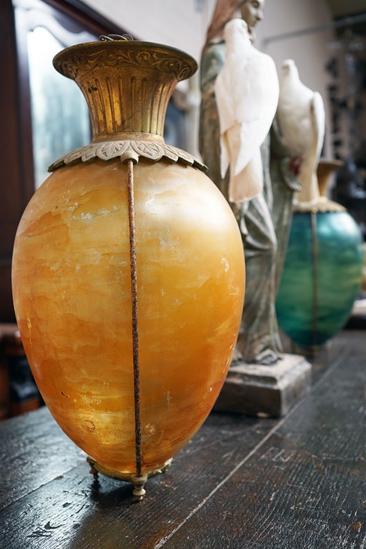The rare and unusual pair of hanging apothecary display carboys each of generous ovoid form and formed from thick hand-blown glass with swirling painted surfaces, one in a warm amber tone and the other in a deep malachite green, each mounted within a decorative gilt metal suspension collar with scalloped foliate mount and encircling stabilising band, from which three chains rise to a suspension ring, allowing the bottles to hang freely, the mottled painted surfaces of the glass create a richly mineral appearance reminiscent of onyx or malachite, and when illuminated the glass takes on a soft glowing quality that gives the pieces considerable sculptural presence, the wholes after a patent of June 16th 1891.