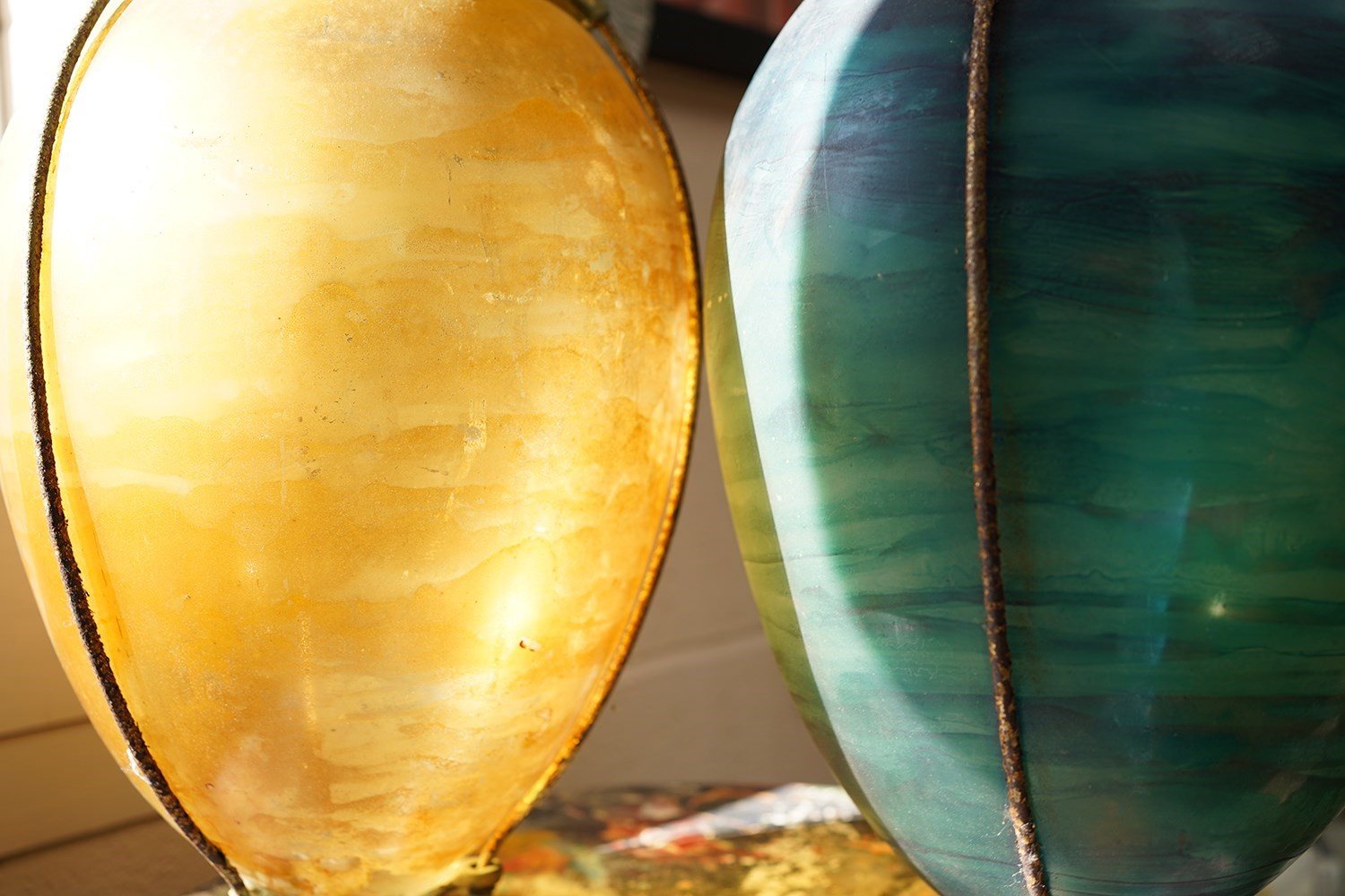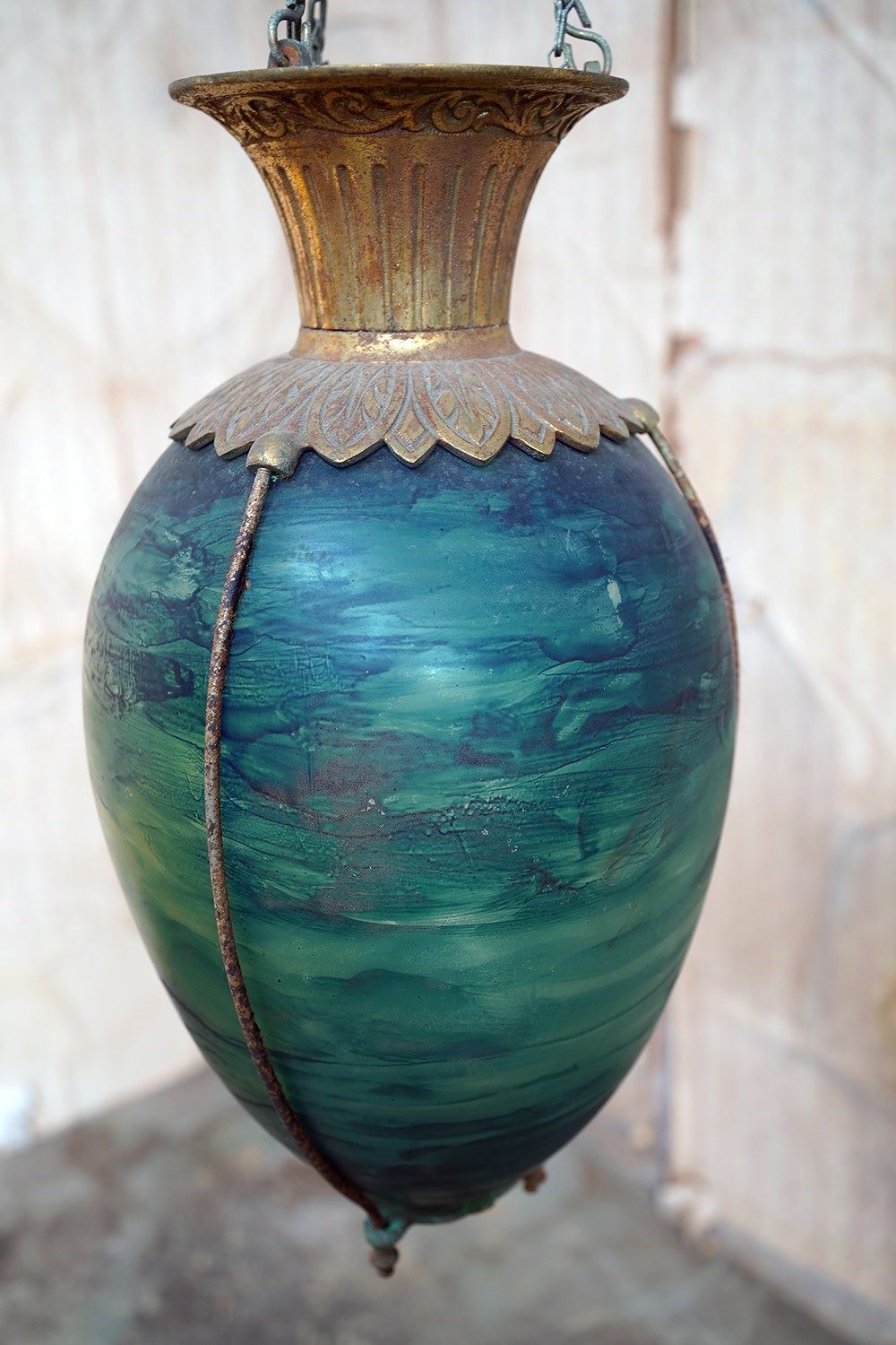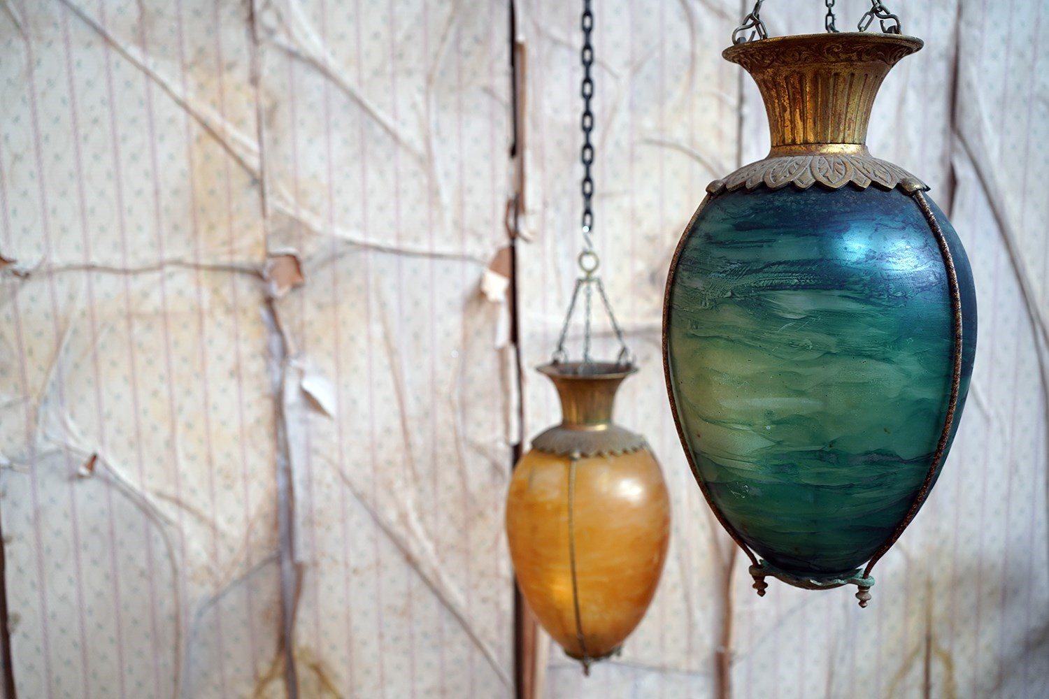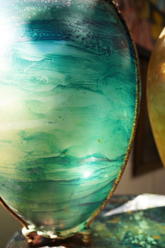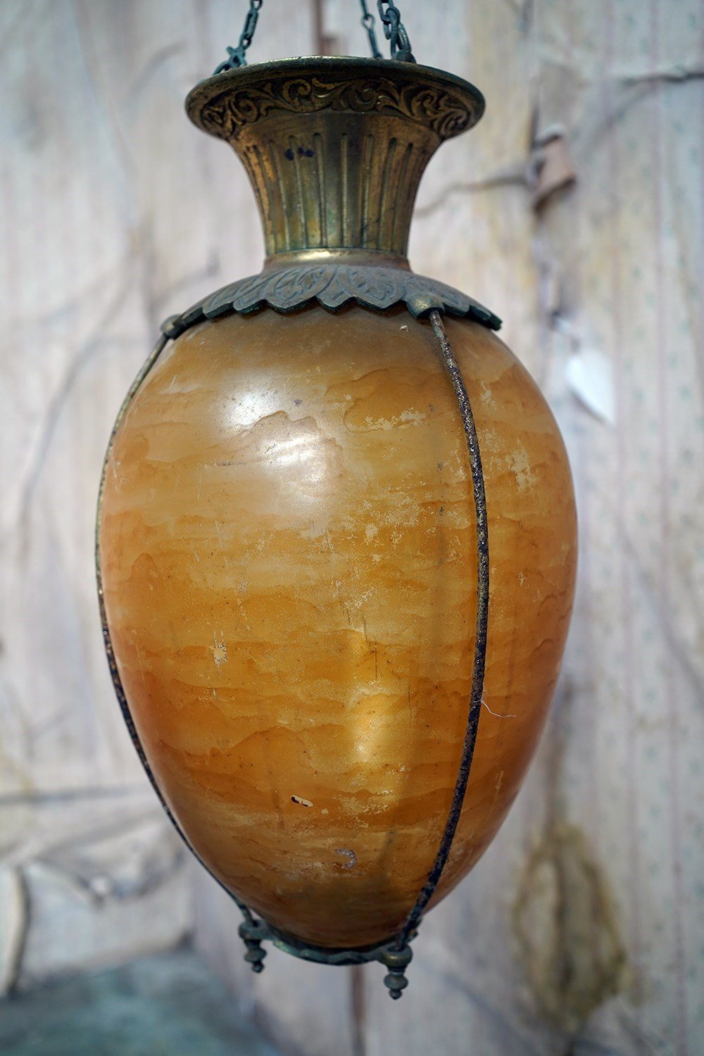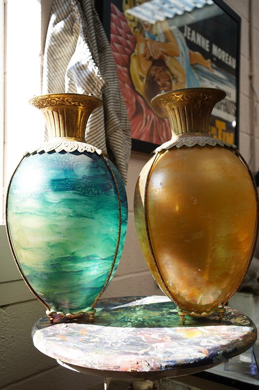 The rare and unusual pair of hanging apothecary display carboys each of generous ovoid form and formed from thick hand-blown glass with swirling painted surfaces, one in a warm amber tone and the other in a deep malachite green, each mounted within a decorative gilt metal suspension collar with scalloped foliate mount and encircling stabilising band, from which three chains rise to a suspension ring, allowing the bottles to hang freely, the mottled painted surfaces of the glass create a richly mineral appearance reminiscent of onyx or malachite, and when illuminated the glass takes on a soft glowing quality that gives the pieces considerable sculptural presence, the wholes after a patent of June 16th 1891.