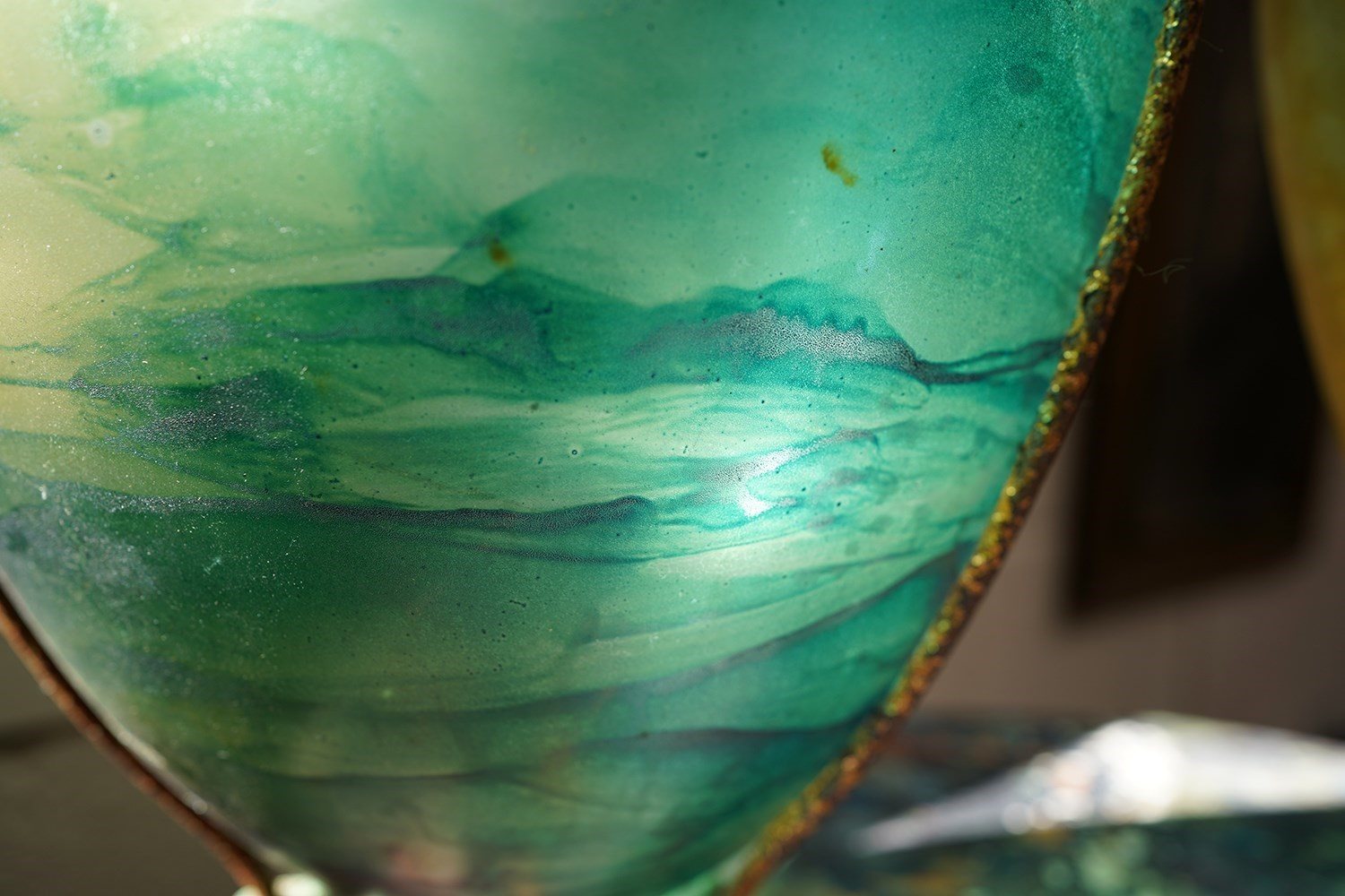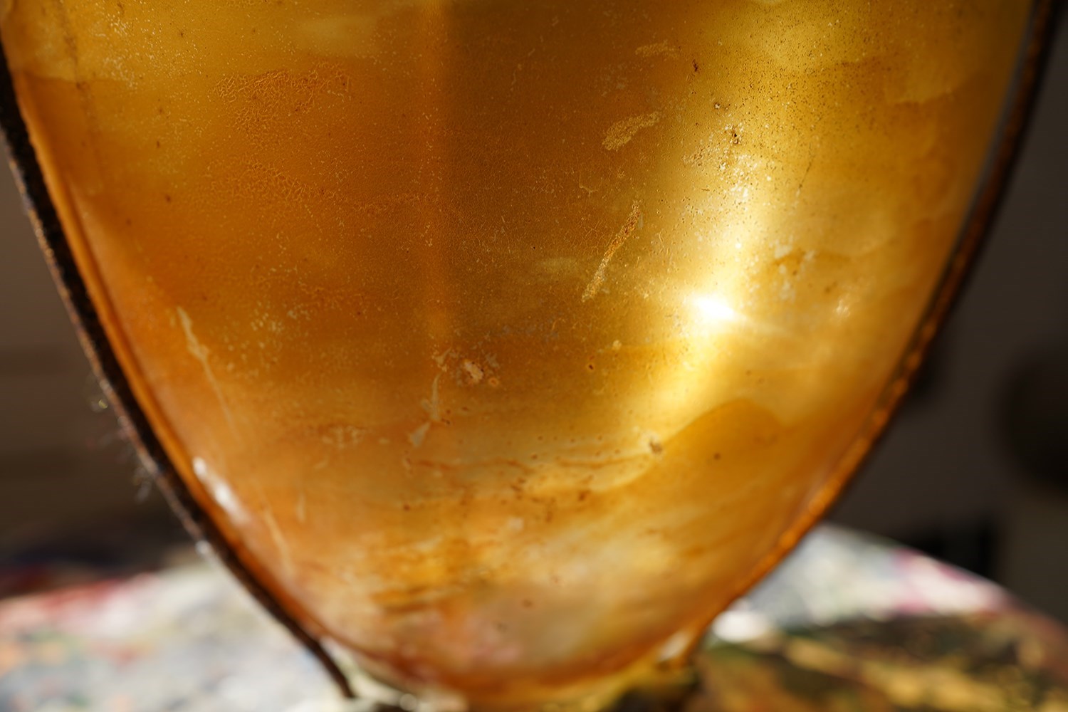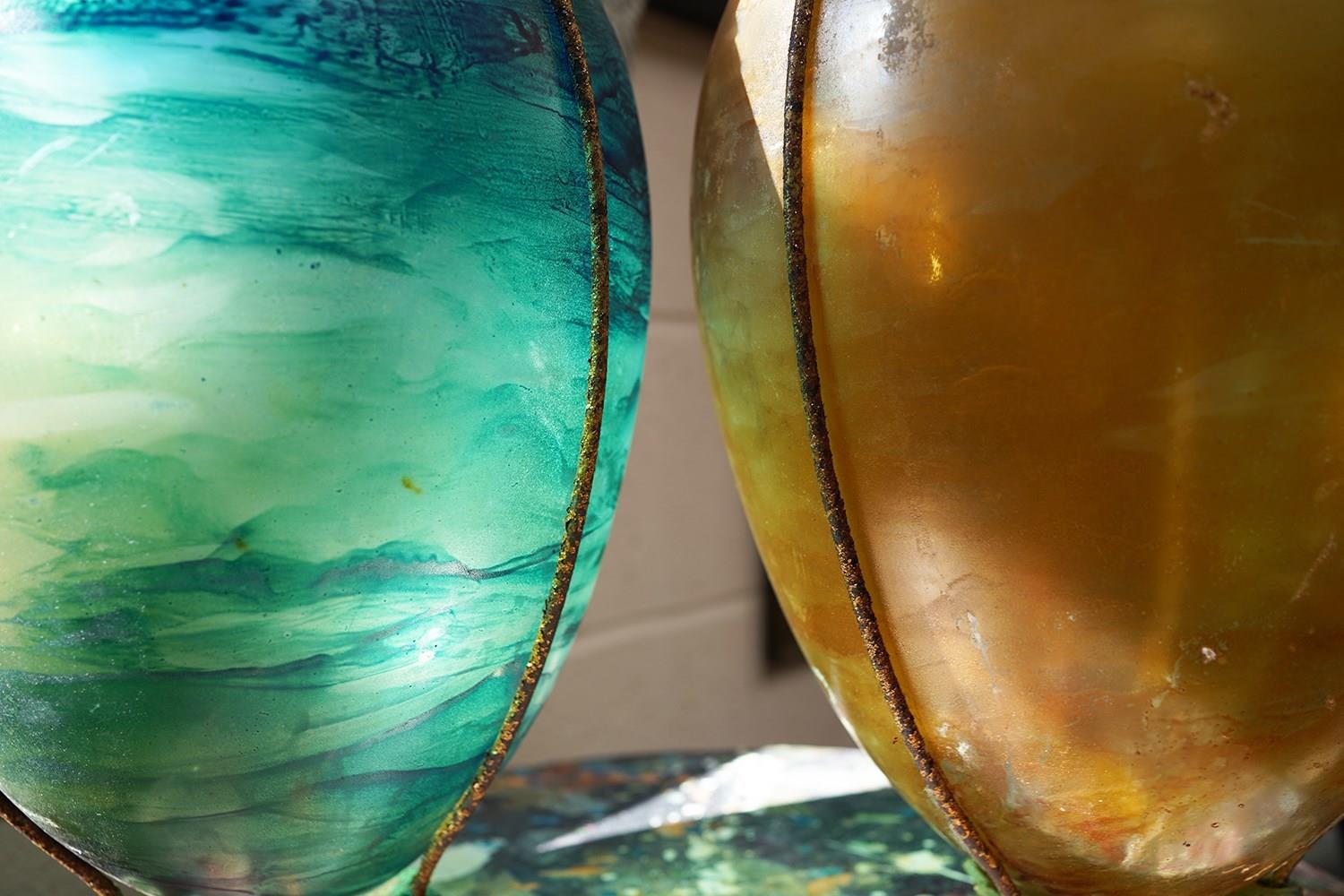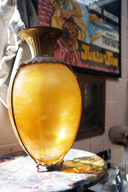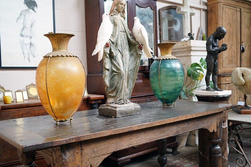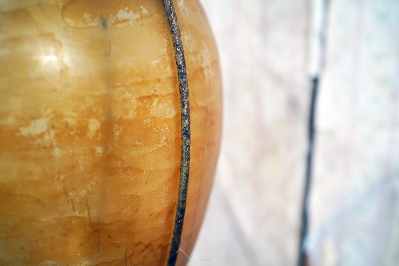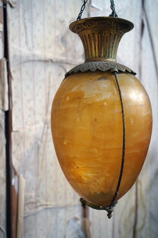 The rare and unusual pair of hanging apothecary display carboys each of generous ovoid form and formed from thick hand-blown glass with swirling painted surfaces, one in a warm amber tone and the other in a deep malachite green, each mounted within a decorative gilt metal suspension collar with scalloped foliate mount and encircling stabilising band, from which three chains rise to a suspension ring, allowing the bottles to hang freely, the mottled painted surfaces of the glass create a richly mineral appearance reminiscent of onyx or malachite, and when illuminated the glass takes on a soft glowing quality that gives the pieces considerable sculptural presence, the wholes after a patent of June 16th 1891.