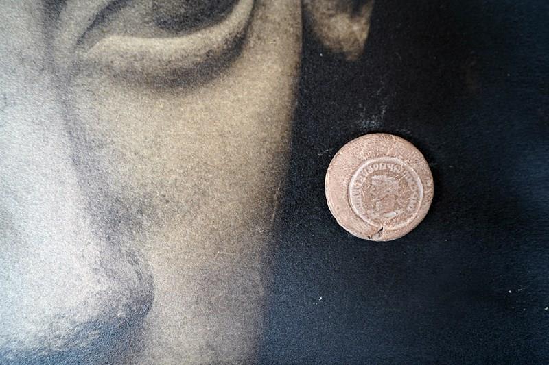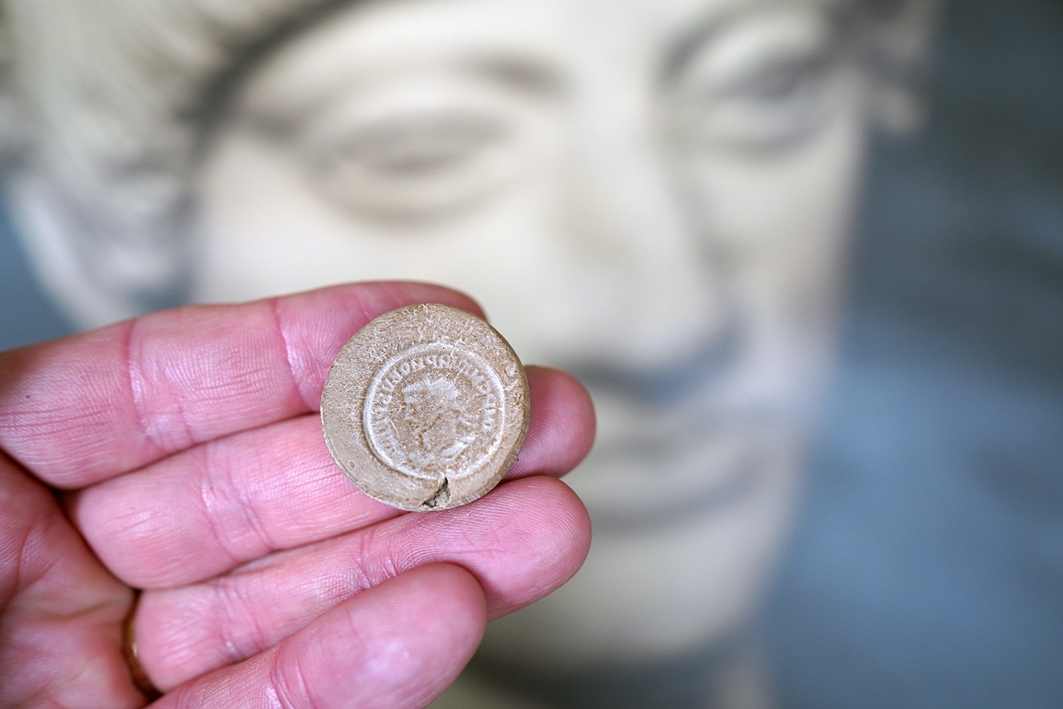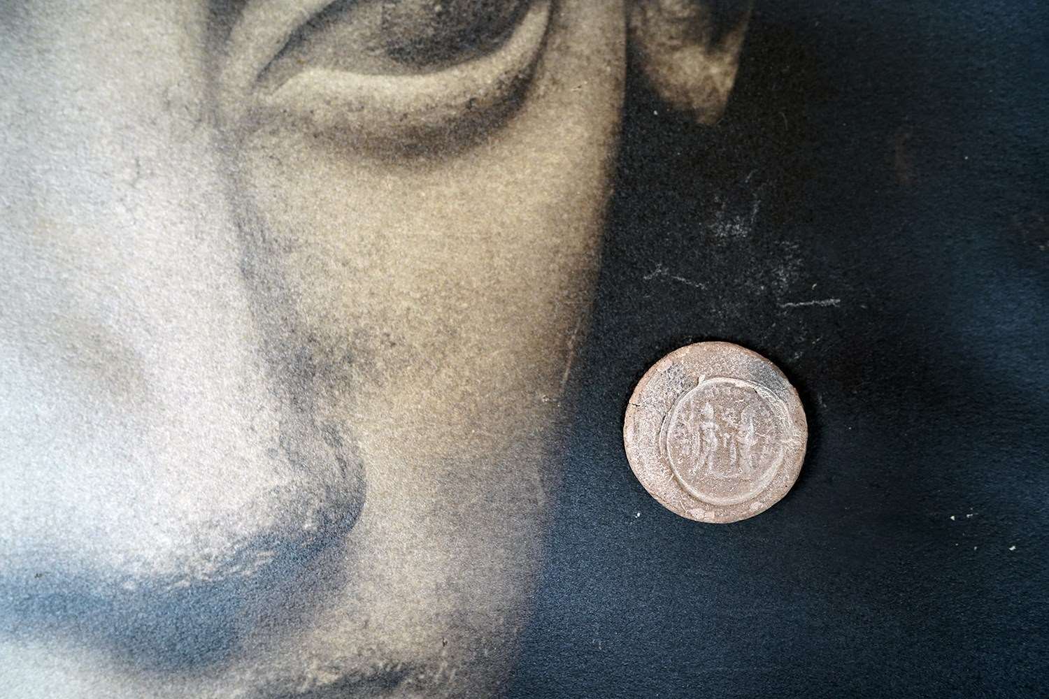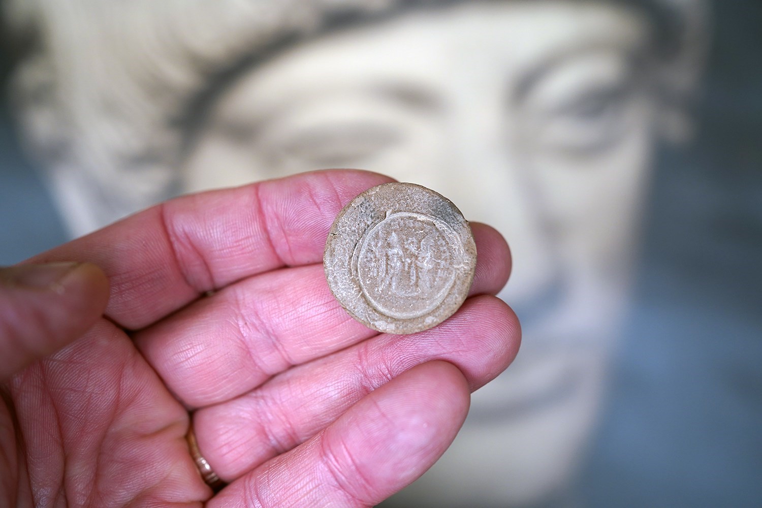 The fascinating terracotta forger’s casting mould, Incuse of IMP C M AVR PROBVS P F AVG, radiate, draped and cuirassed bust to right and reverse Incuse of RESTITV[...], female figure draped standing to right, presenting a wreath raised in the right hand to Probus and wearing cloak over cuirass, standing facing before her, the head turned to the left whilst holding globe and sceptre, the whole surviving from 3rd century AD.