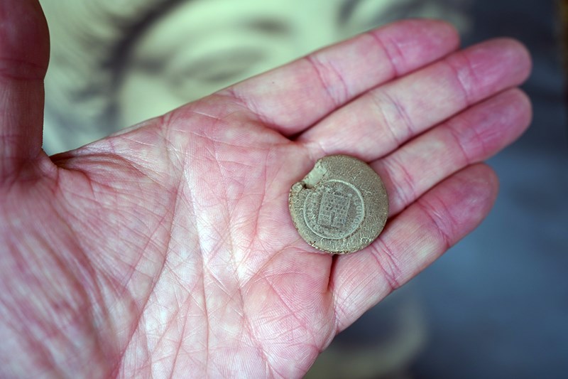 The fascinating terracotta forger’s casting mould, showing incuse of [CONSTANTI]-NVS MAX AVG, laureate, draped and cuirassed bust to right and reverse Incus of PROVIDEN-[TIAE AVGG?], being a camp gate with no doors and two turrets and a star above, the whole surviving from 4th century AD.