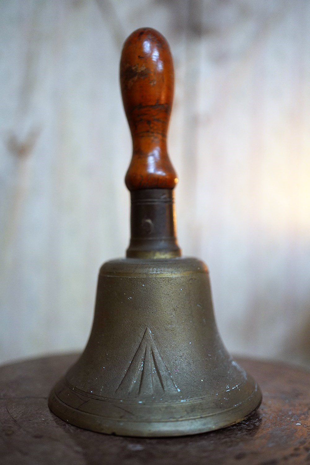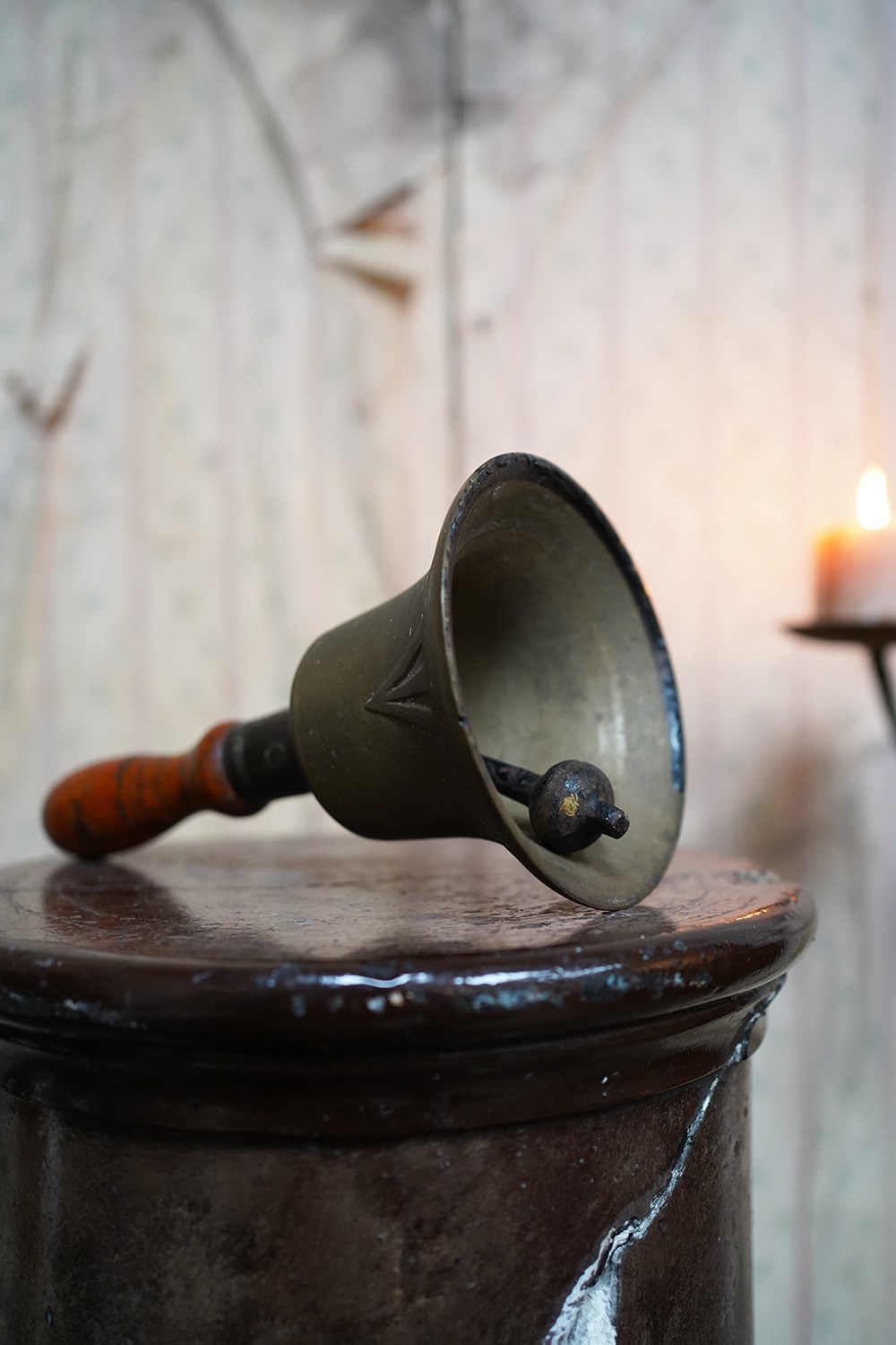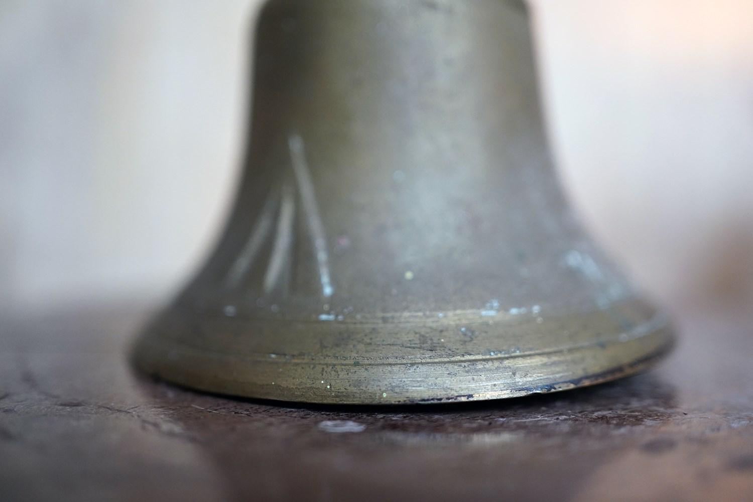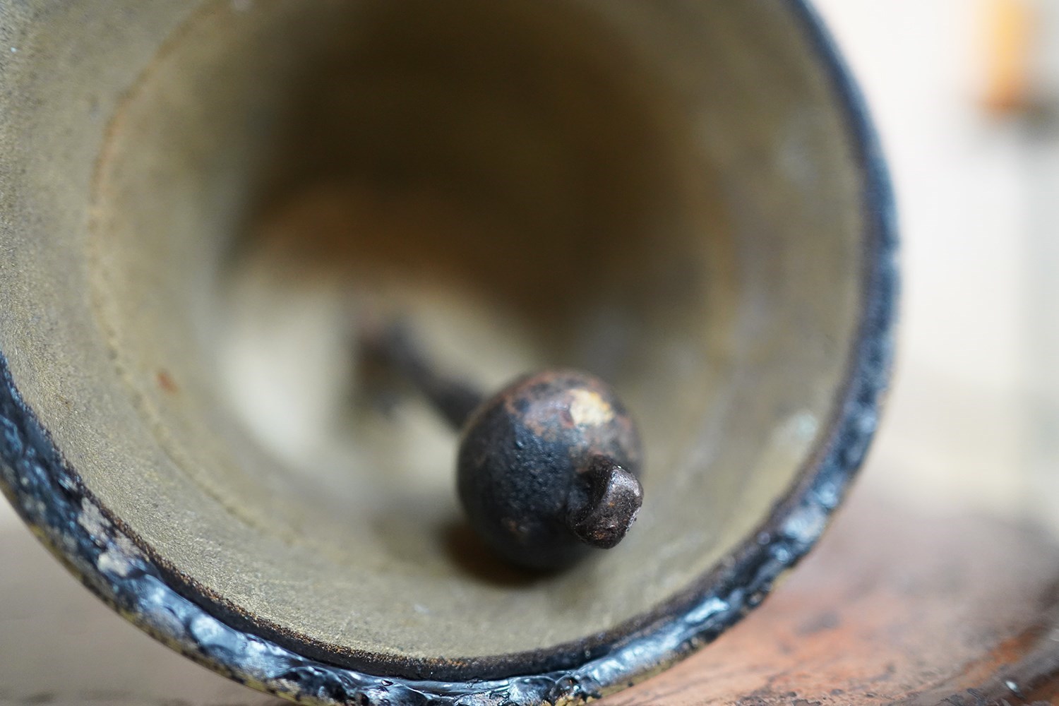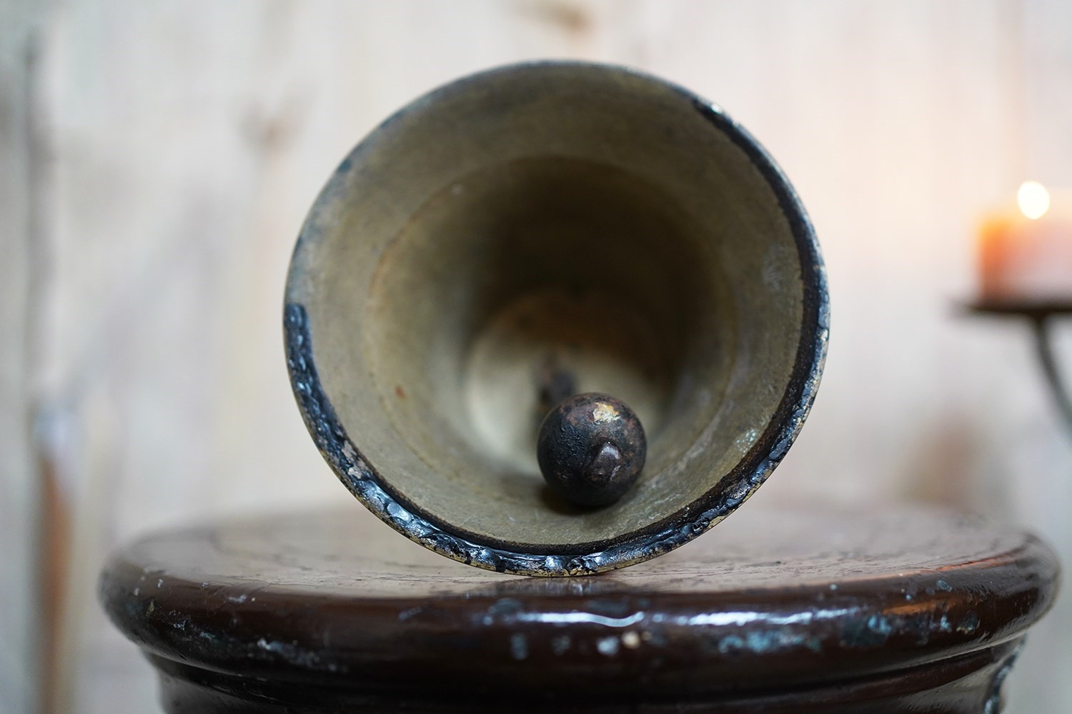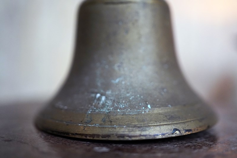 The condition of the bell is good and operative (see video), with its honest utilitarian casting, deep tone and uncleaned surface with a beautifully mellow handle and verdigris to the bronze.