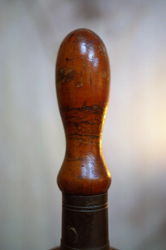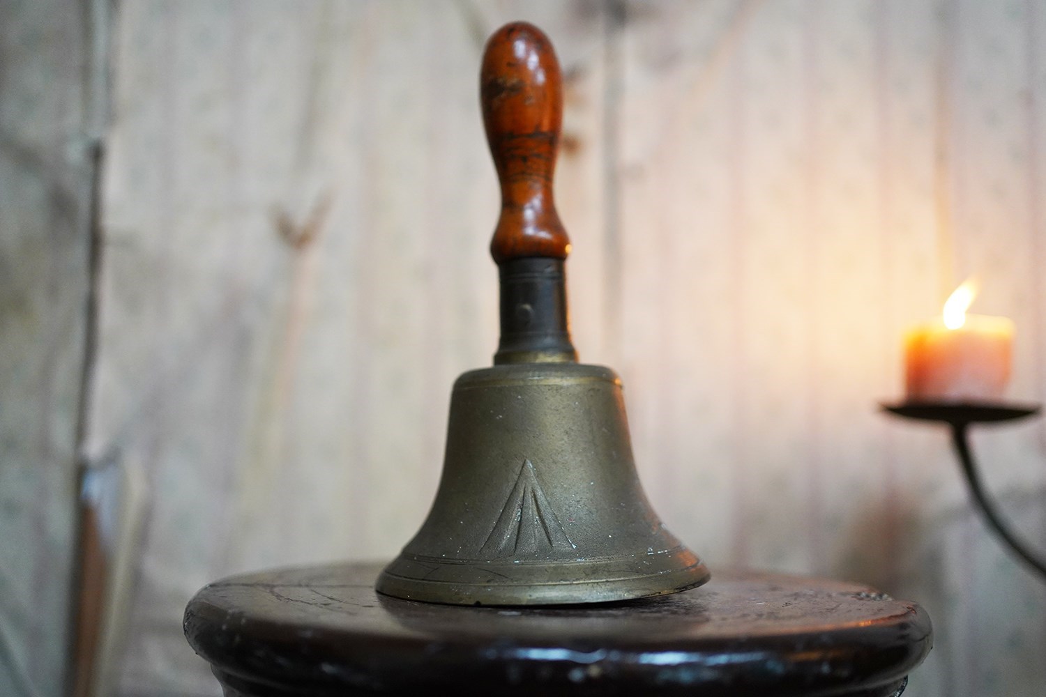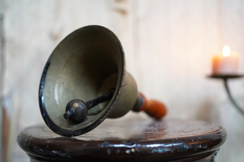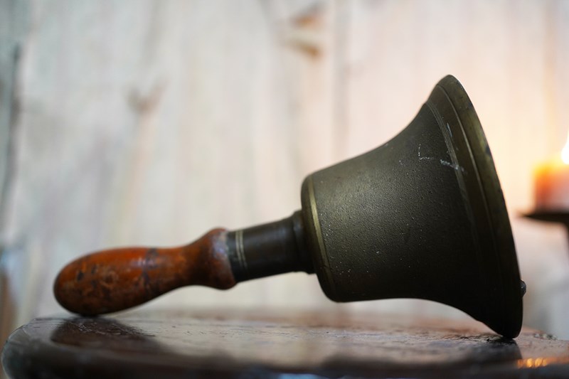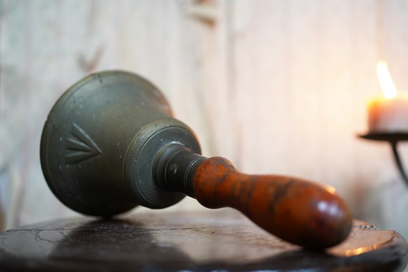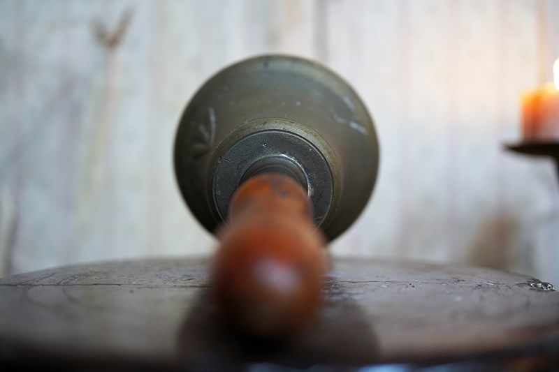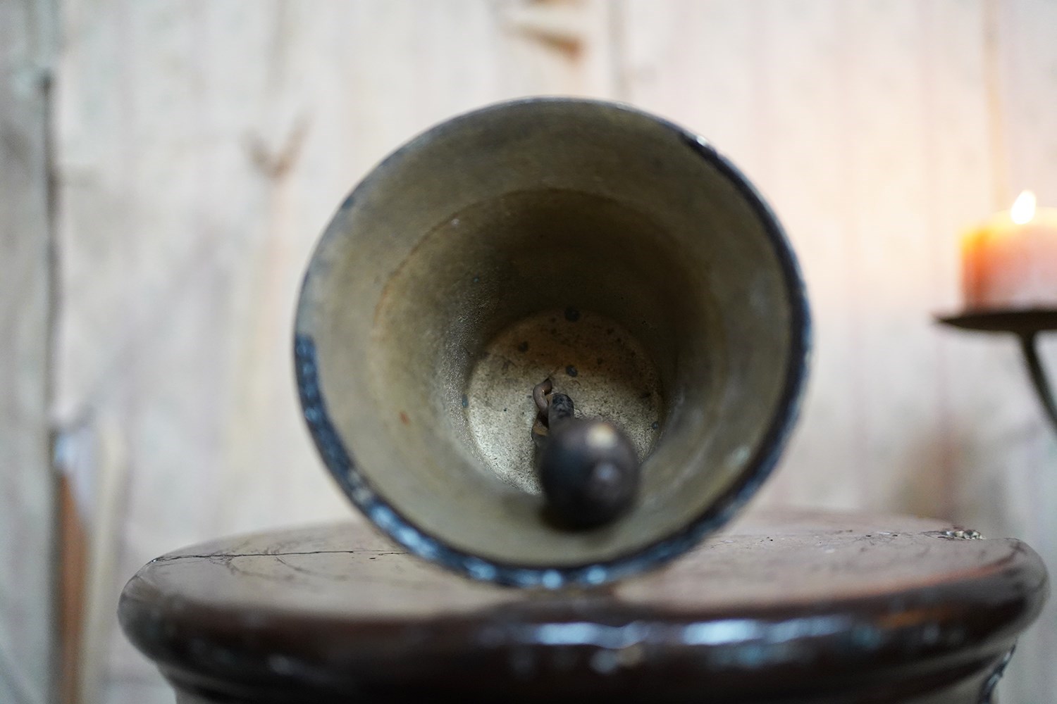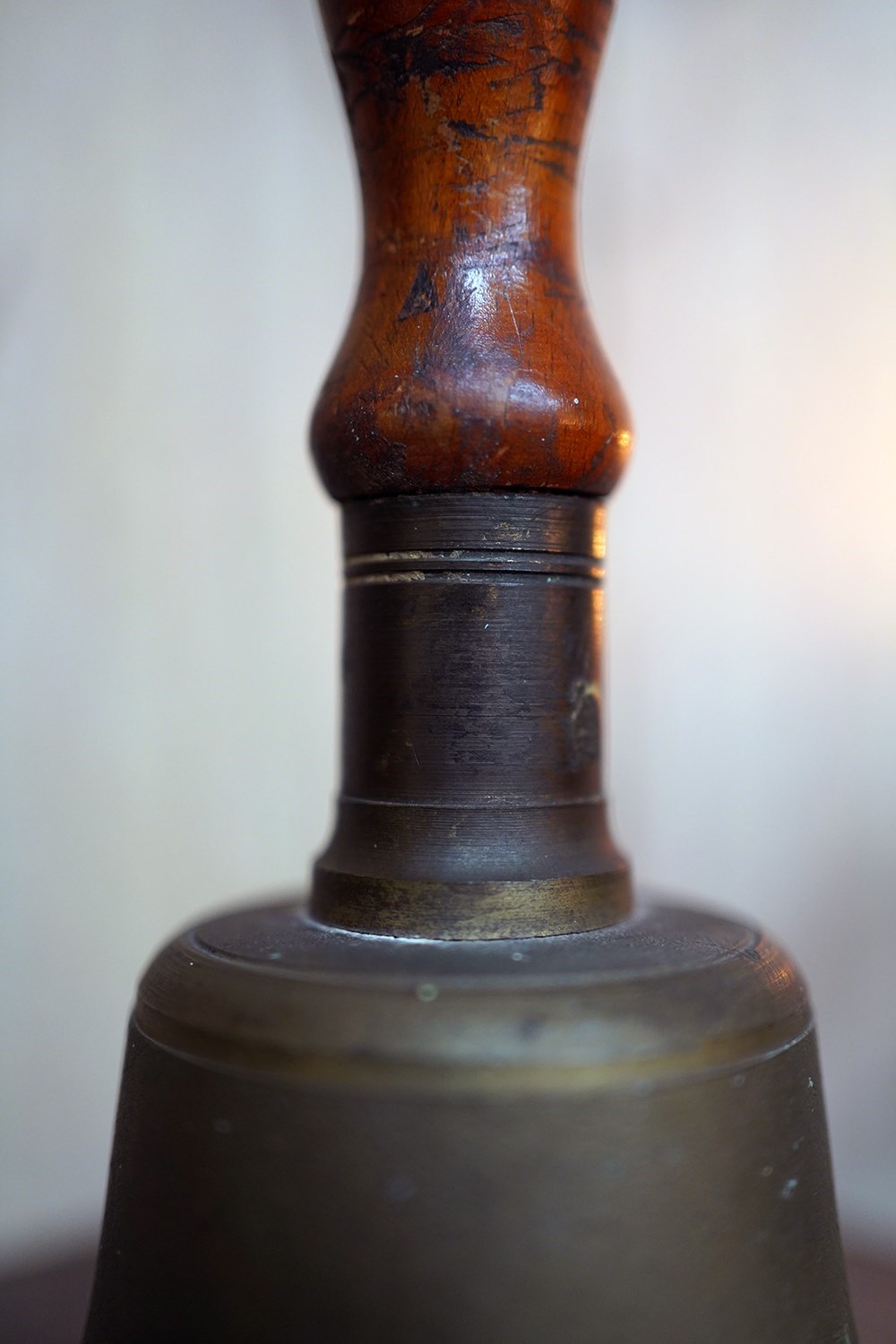 The condition of the bell is good and operative (see video), with its honest utilitarian casting, deep tone and uncleaned surface with a beautifully mellow handle and verdigris to the bronze.