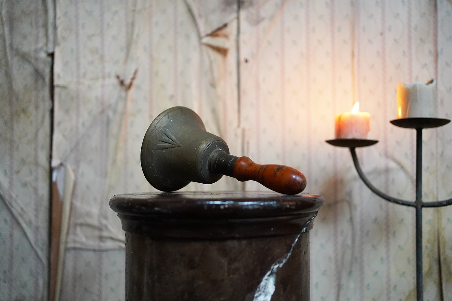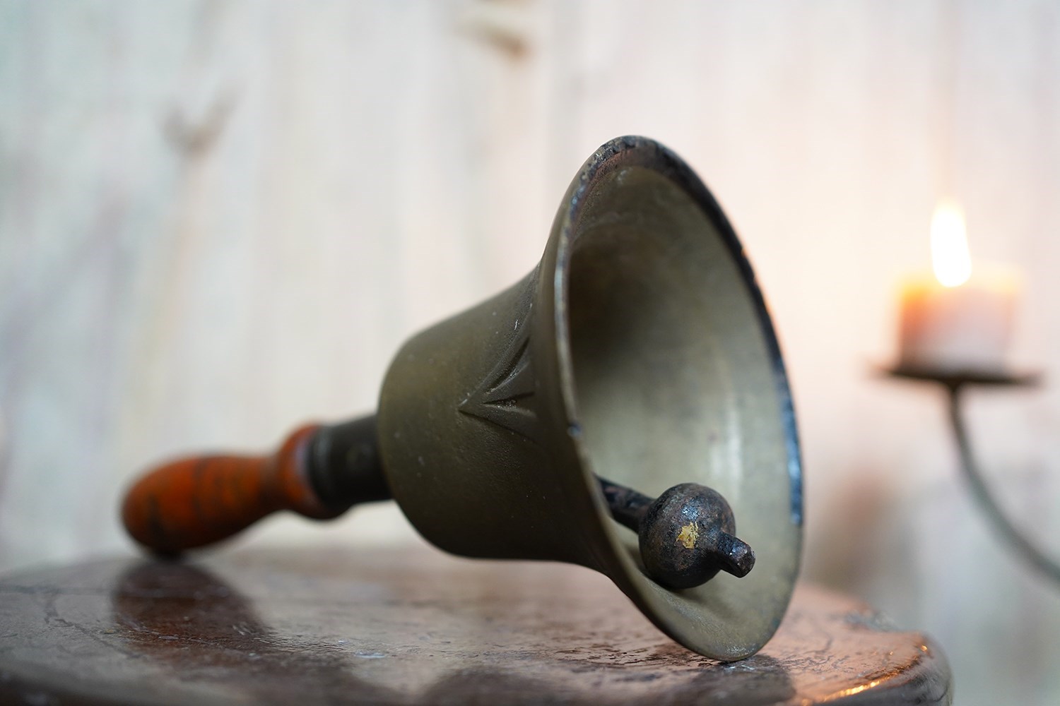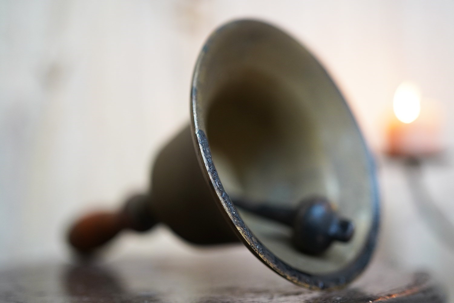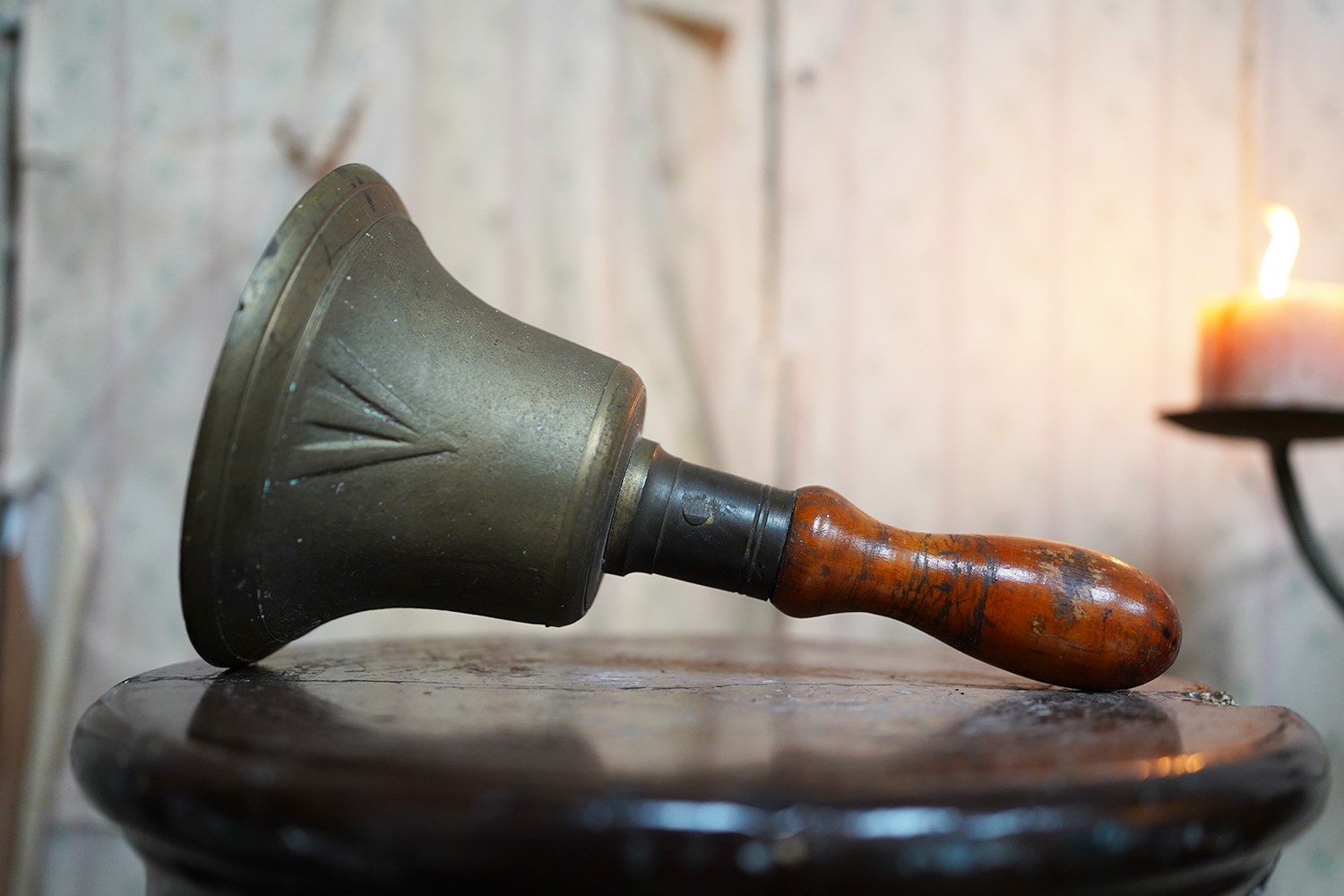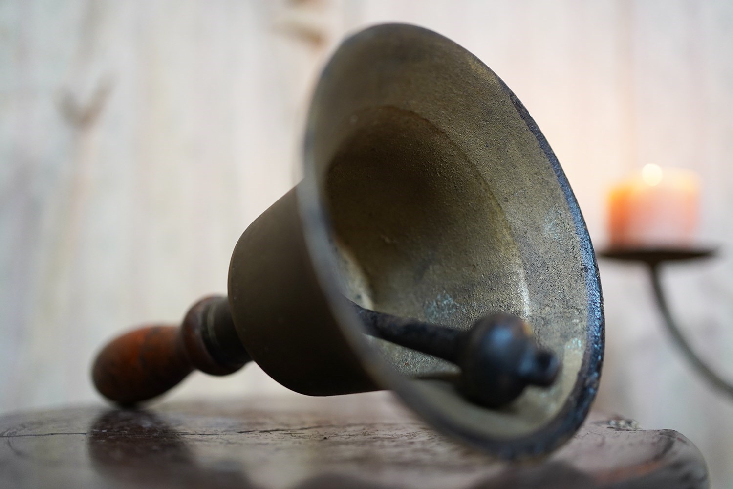 The condition of the bell is good and operative (see video), with its honest utilitarian casting, deep tone and uncleaned surface with a beautifully mellow handle and verdigris to the bronze.