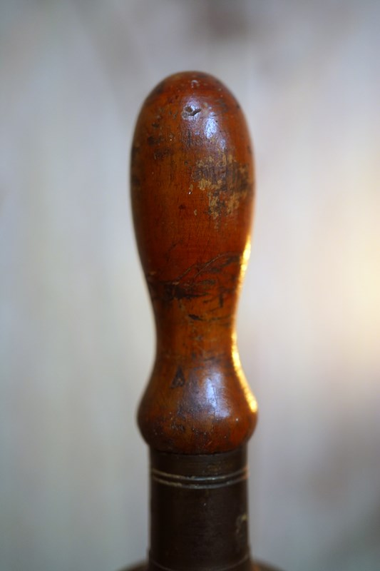 The well-preserved nineteenth century bronze alarm bell having a flared body crisply struck to the front with the Broad Arrow ordnance mark denoting government property, the whole retaining a pleasing, time-worn patina and having its original turned wooden handle with good colour and handling wear.