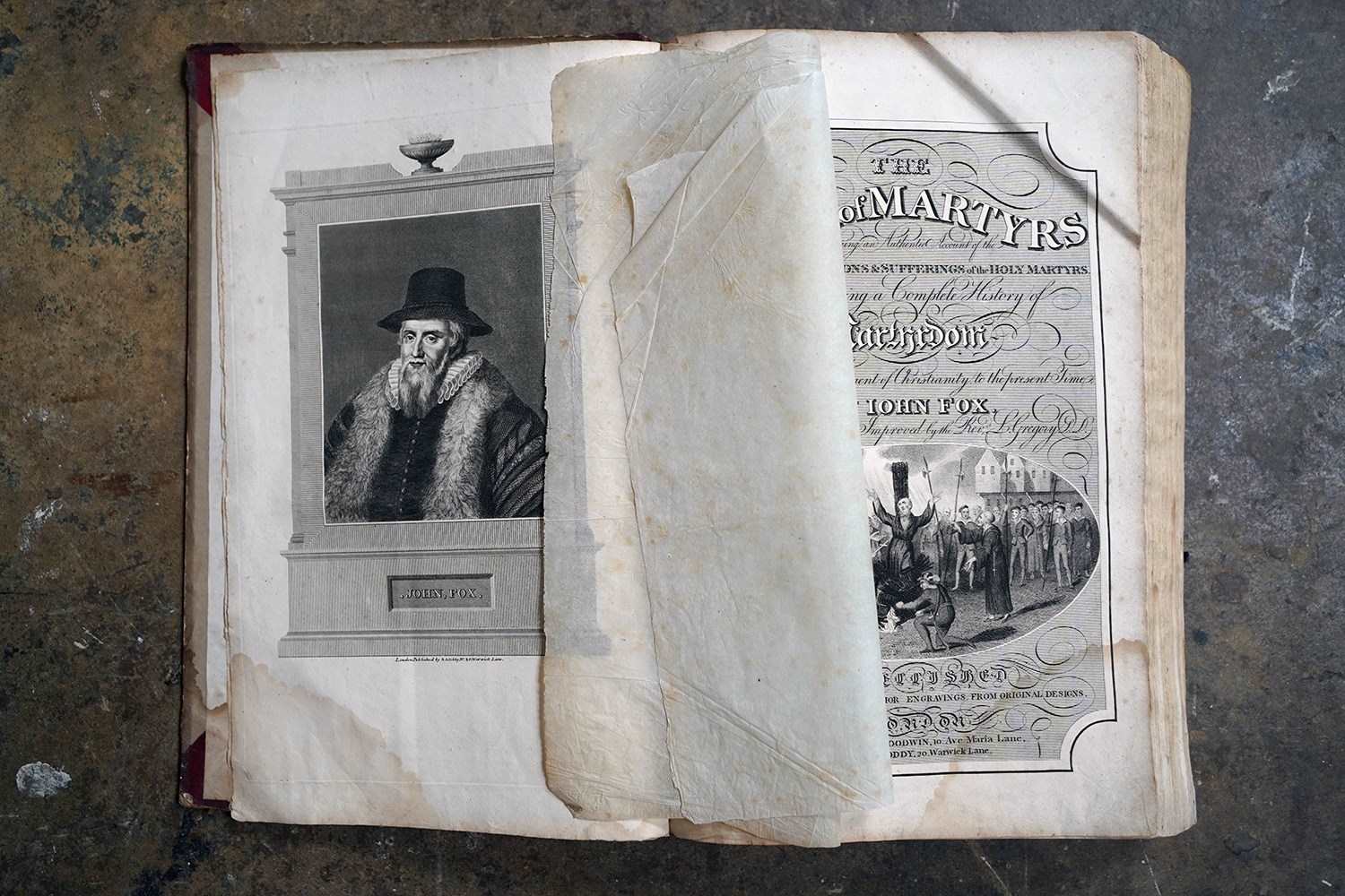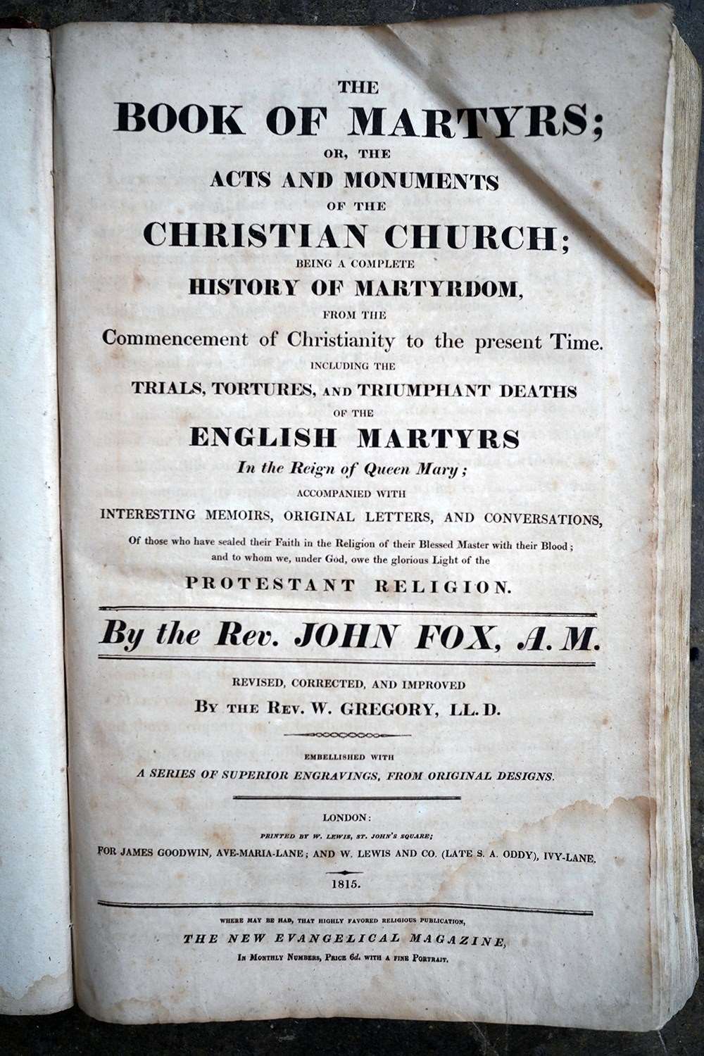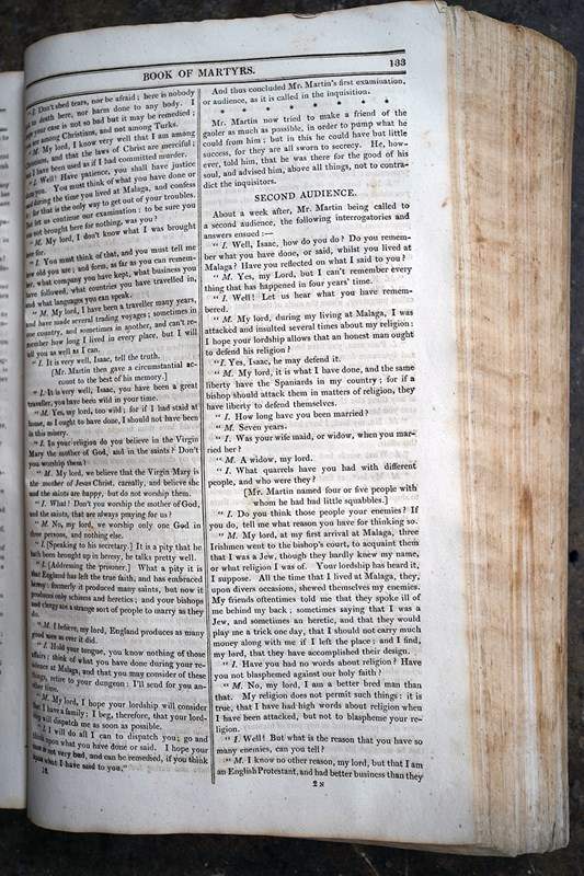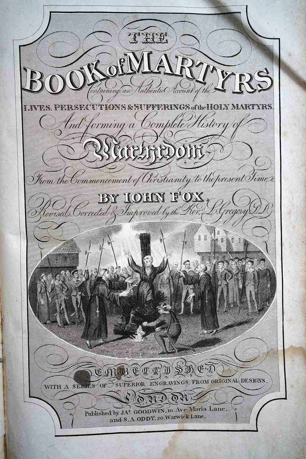The books official title is’ The Book of Martyrs: Containing an Authentic Account of the Lives, Persecutions & Sufferings of the Holy Martyrs. And forming a Complete History of Martyrdom. From the Commencement of Christianity to the present Time. By John Fox. Revised, Corrected & Improved by the Revd. W. Gregory.