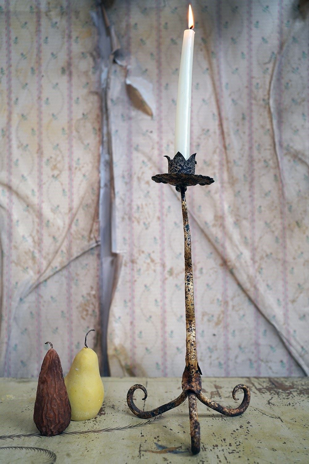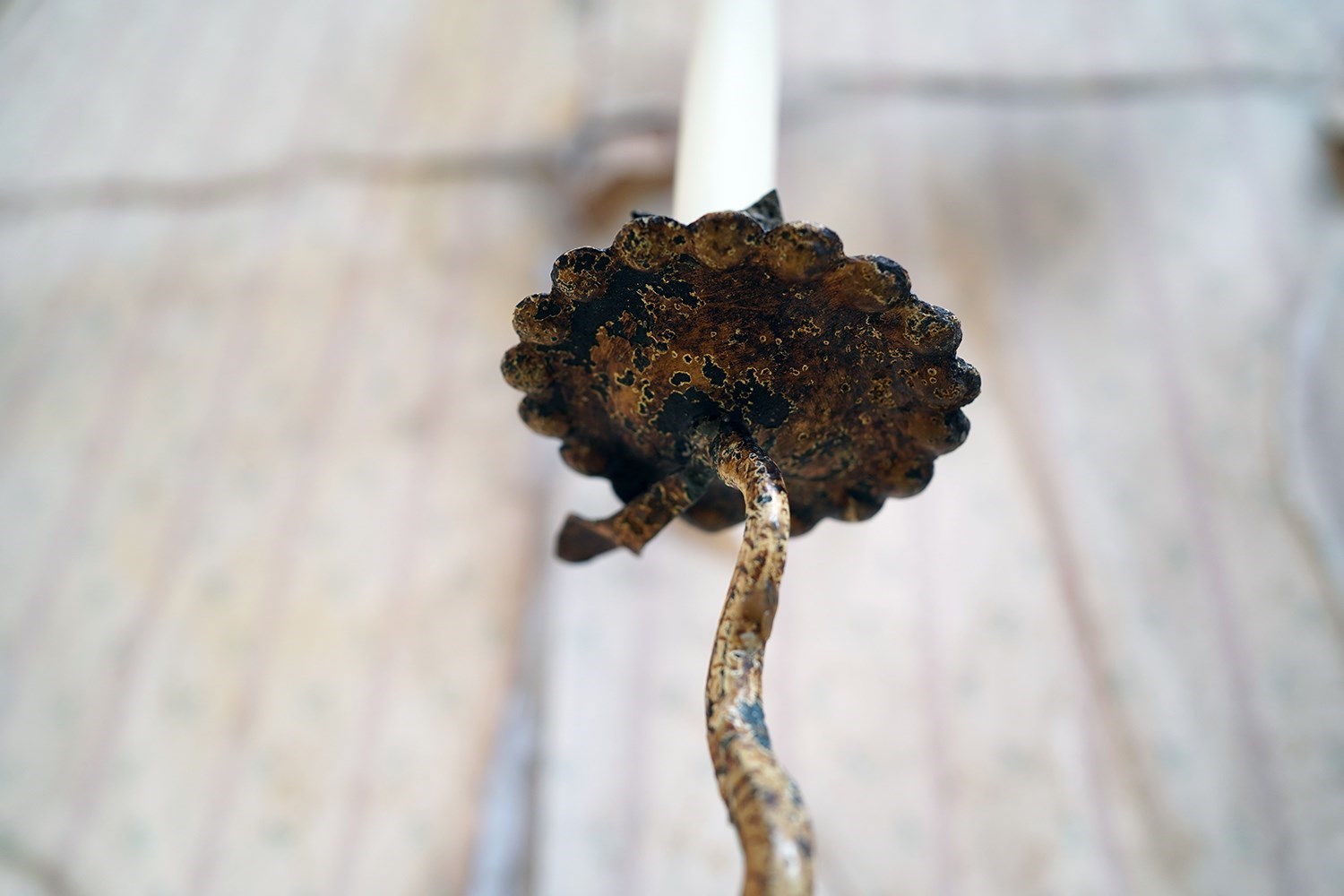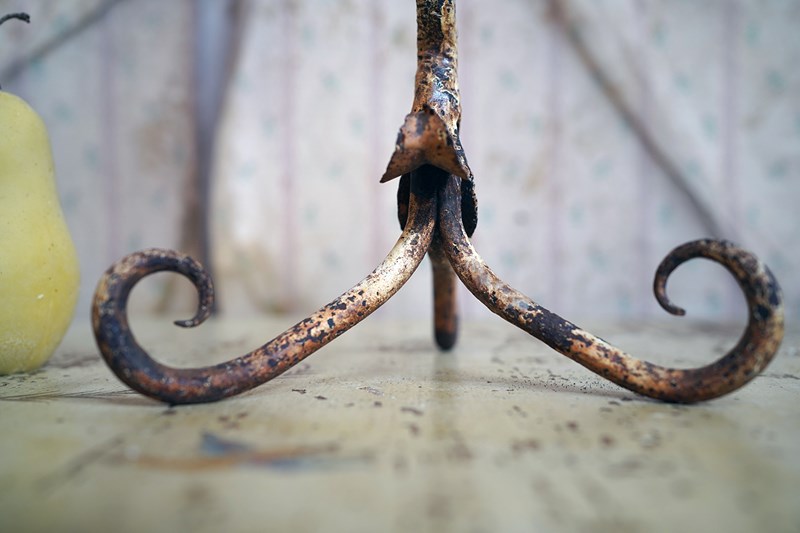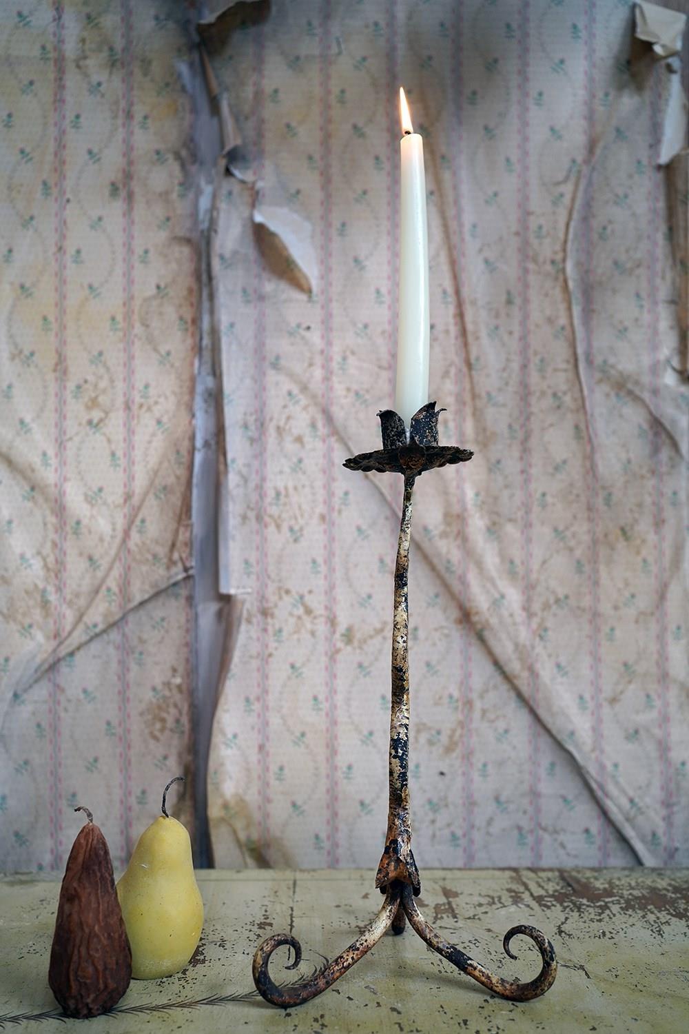 This type of rural blacksmith work sits firmly within the vernacular iron tradition; practical yet expressive. The twisting stem gives the impression of a living plant rising from the ground, while the simple flower-head sconce speaks to the enduring marriage of utility and symbolism in folk metalwork. No two are ever quite the same; each carries the hand of its maker and this is a unique one-off creation as such.