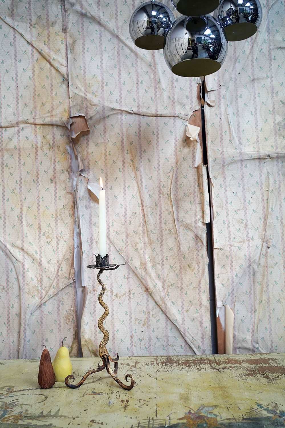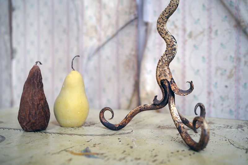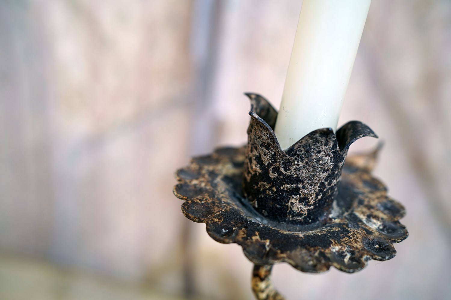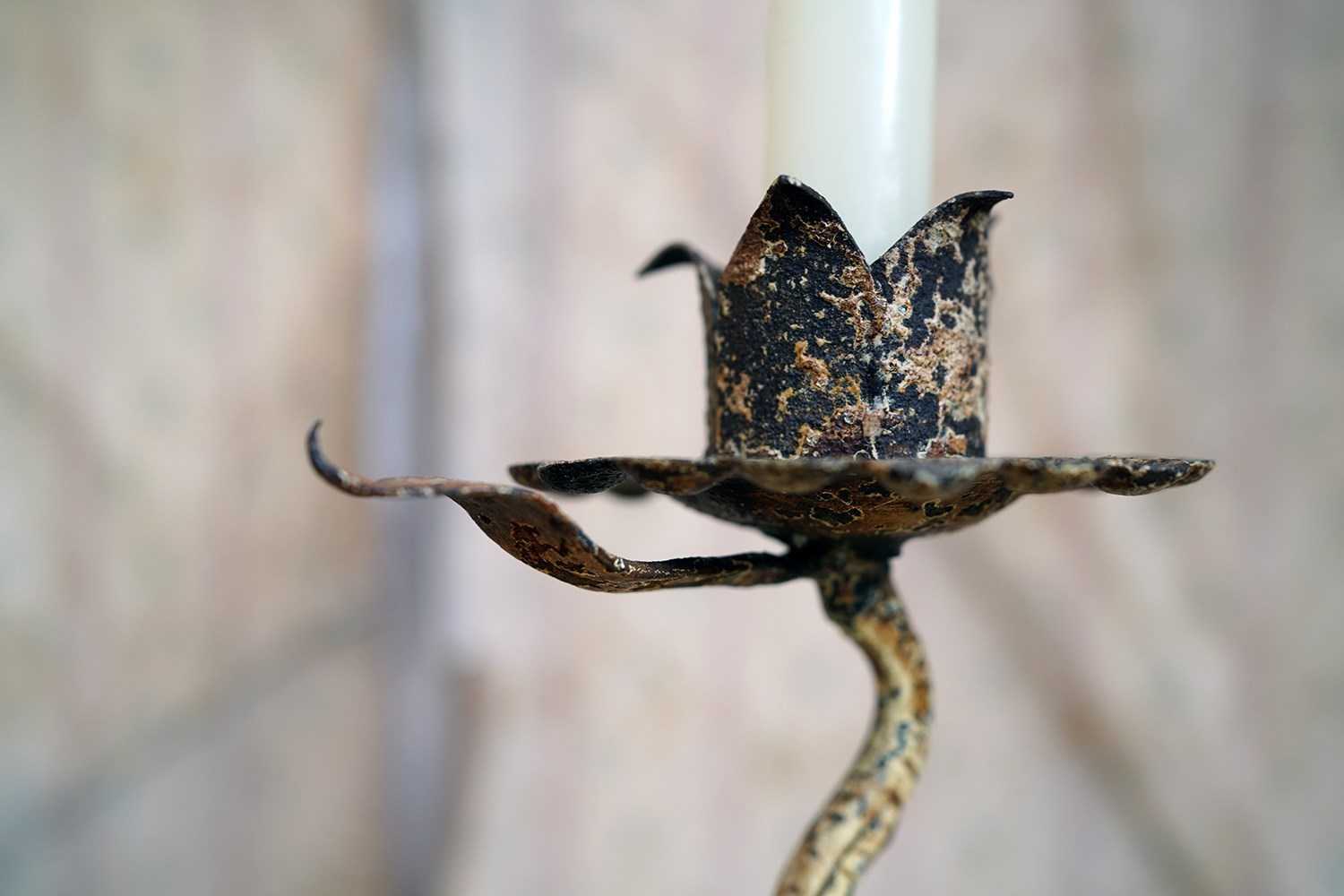 This type of rural blacksmith work sits firmly within the vernacular iron tradition; practical yet expressive. The twisting stem gives the impression of a living plant rising from the ground, while the simple flower-head sconce speaks to the enduring marriage of utility and symbolism in folk metalwork. No two are ever quite the same; each carries the hand of its maker and this is a unique one-off creation as such.