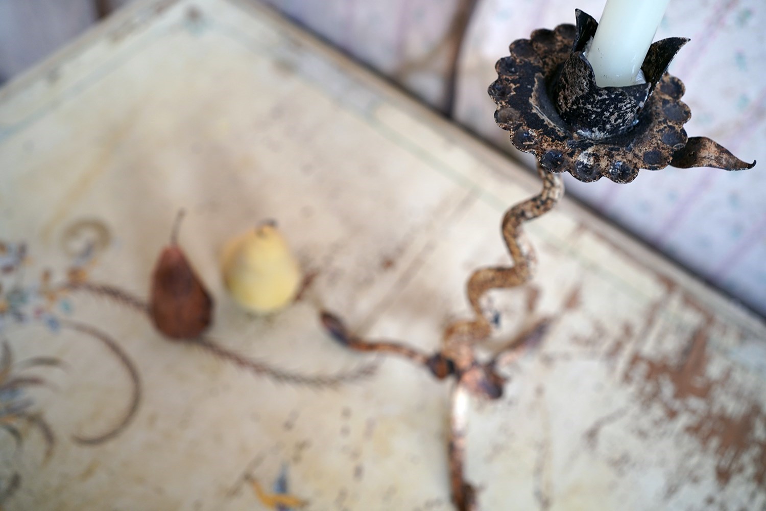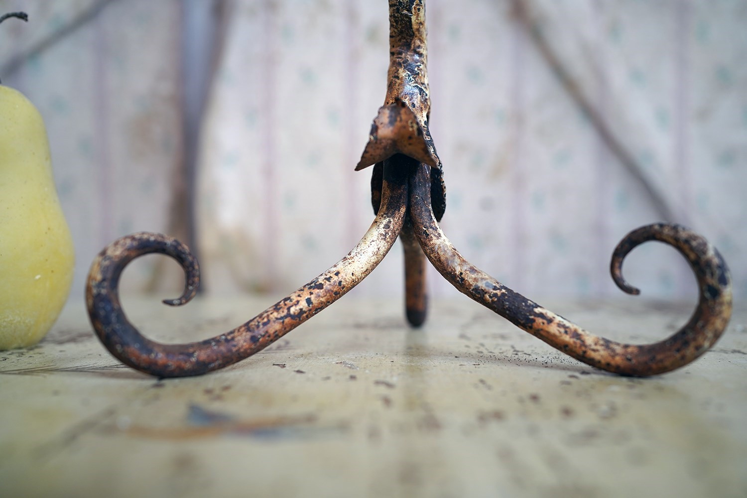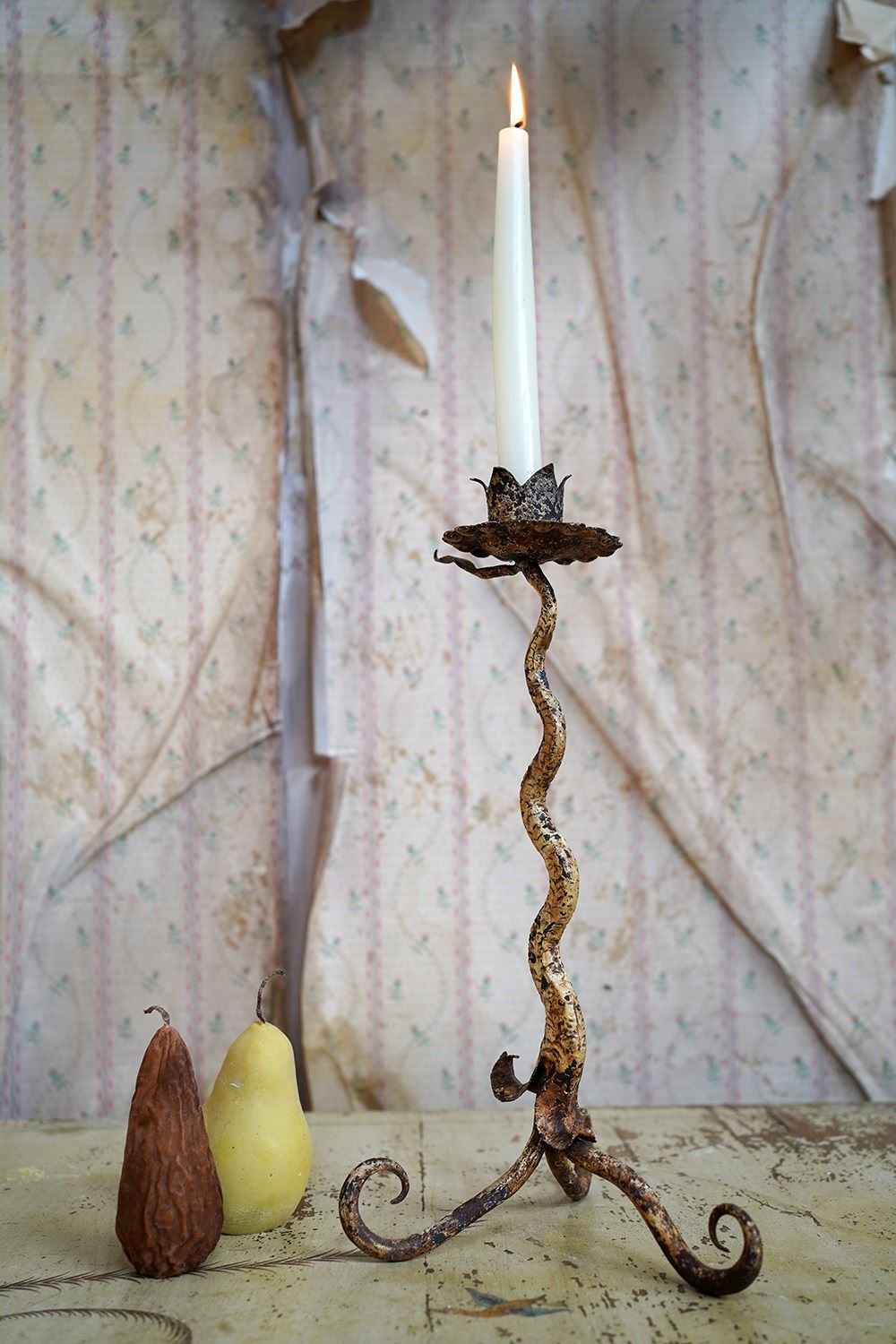The characterful late Victorian blacksmith-made wrought iron candlestick, the sconce formed as a stylised flower head with petal-like rim, rising from a serpentine twisted stem adorned with simple forged foliage and terminating in a scrolling tripod base the whole later painted in a pale yellow, with traces of an earlier surface visible beneath, and the overall form retaining a strong hand-forged presence and surviving from the last quarter of the nineteenth century.