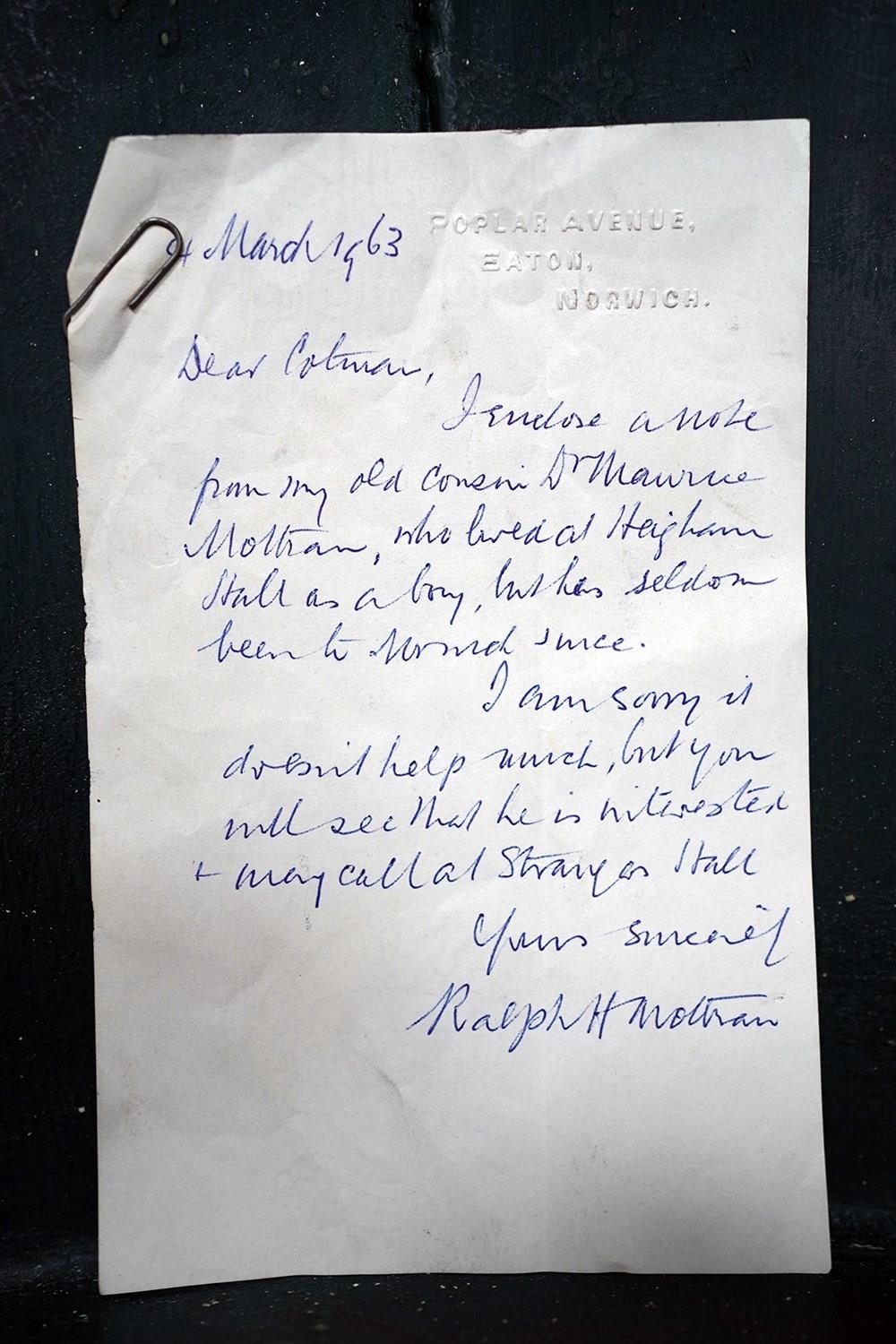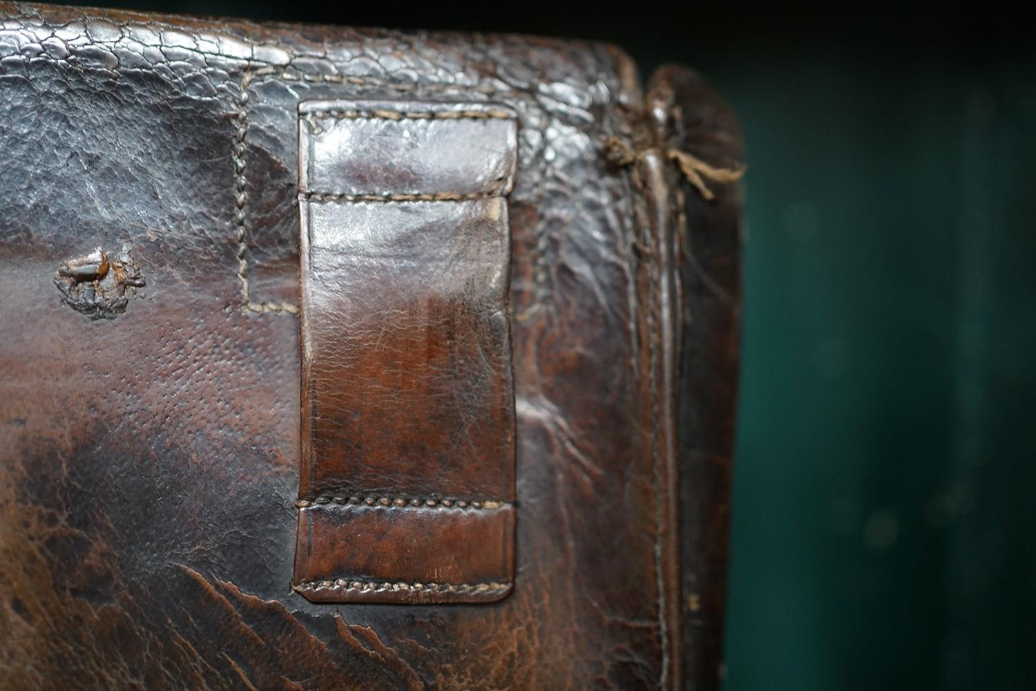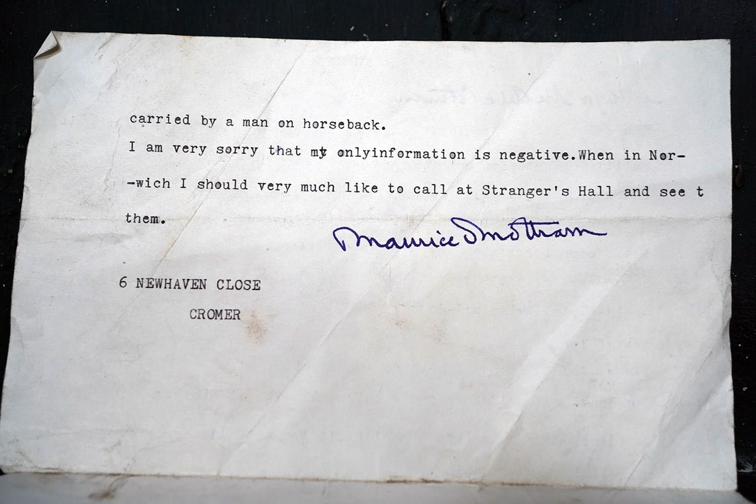 The cases construction what with the straps to the reverse points to it possibly being used on horseback as mentioned in the letters. Moreover, the accompanying ephemera consists of a photocopy of the site of the hall, a letter from a certain Maurice Smotham who’s grandfather lived at the hall and wanted to acquire the bag, and a further letter discussing the sale of the bag by visiting ‘Strangers Hall’.