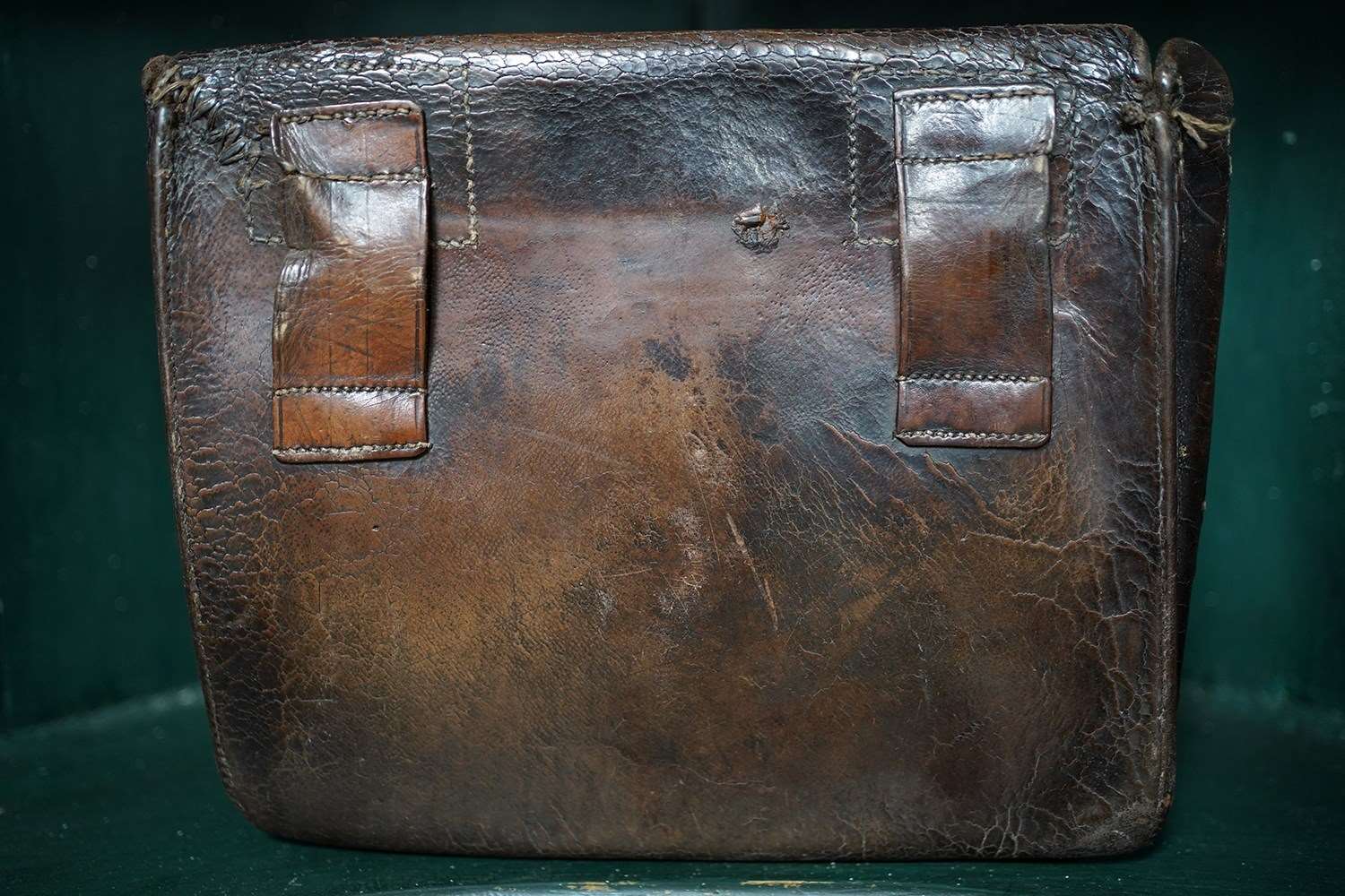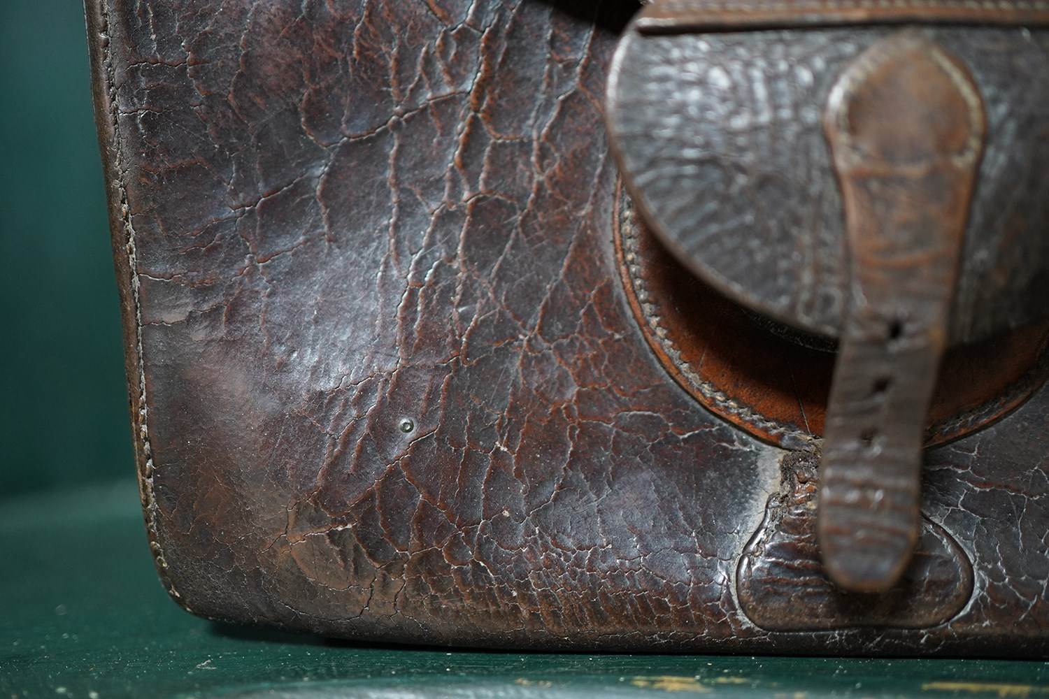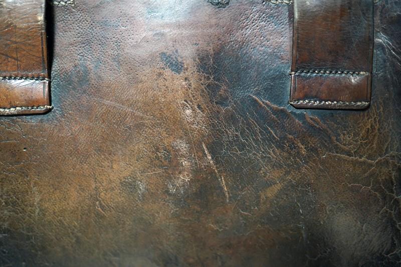 The bag is beautifully tactile and has not been meddled with whatsoever. The leather strap that would enter the buckle is fairly worn but remains serviceable. Part of the buckle itself is missing. The condition is commensurate with age, showing signs of use and wear that enhance its authenticity and charm.