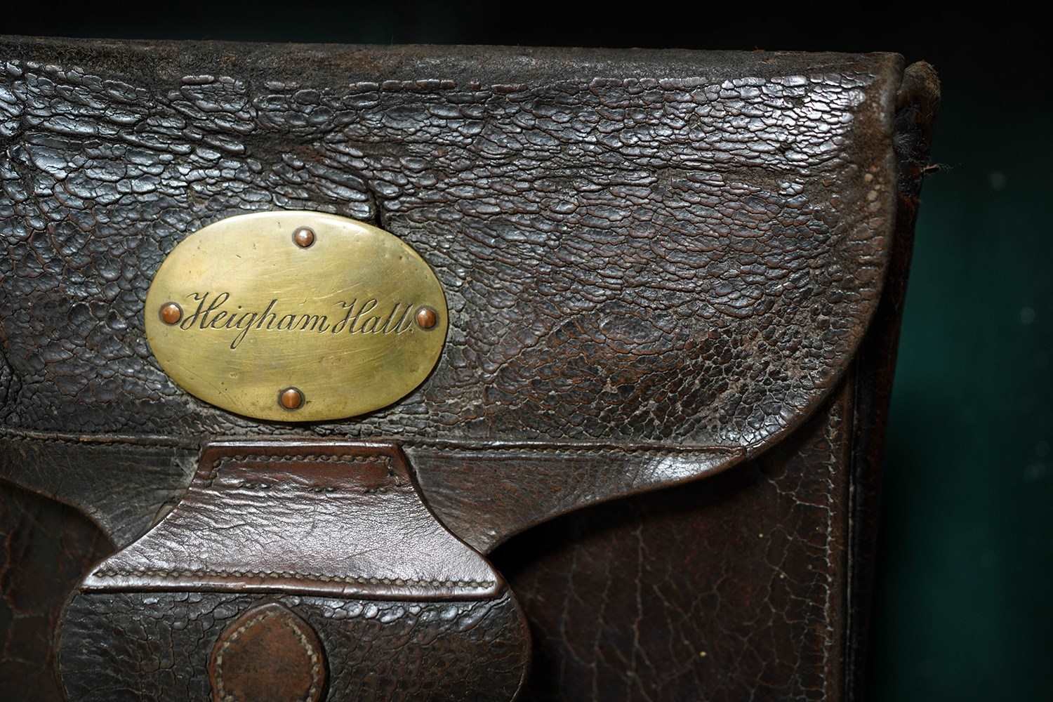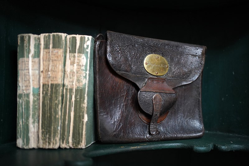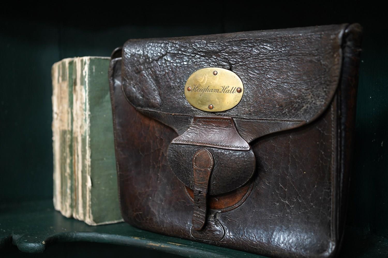 The unique Victorian satchel or dispatch case in wonderfully supple quality leather hide, with leather strap, lock and belt slip to the reverse, adorned with an oval brass cartouche plaque being hand engraved “Heigham Hall”, referring to the private lunatic asylum in Norwich, England, the whole containing associated letters and surviving from the third quarter of the nineteenth century.