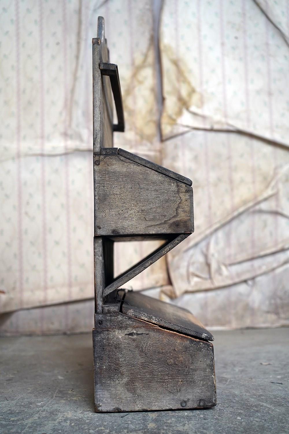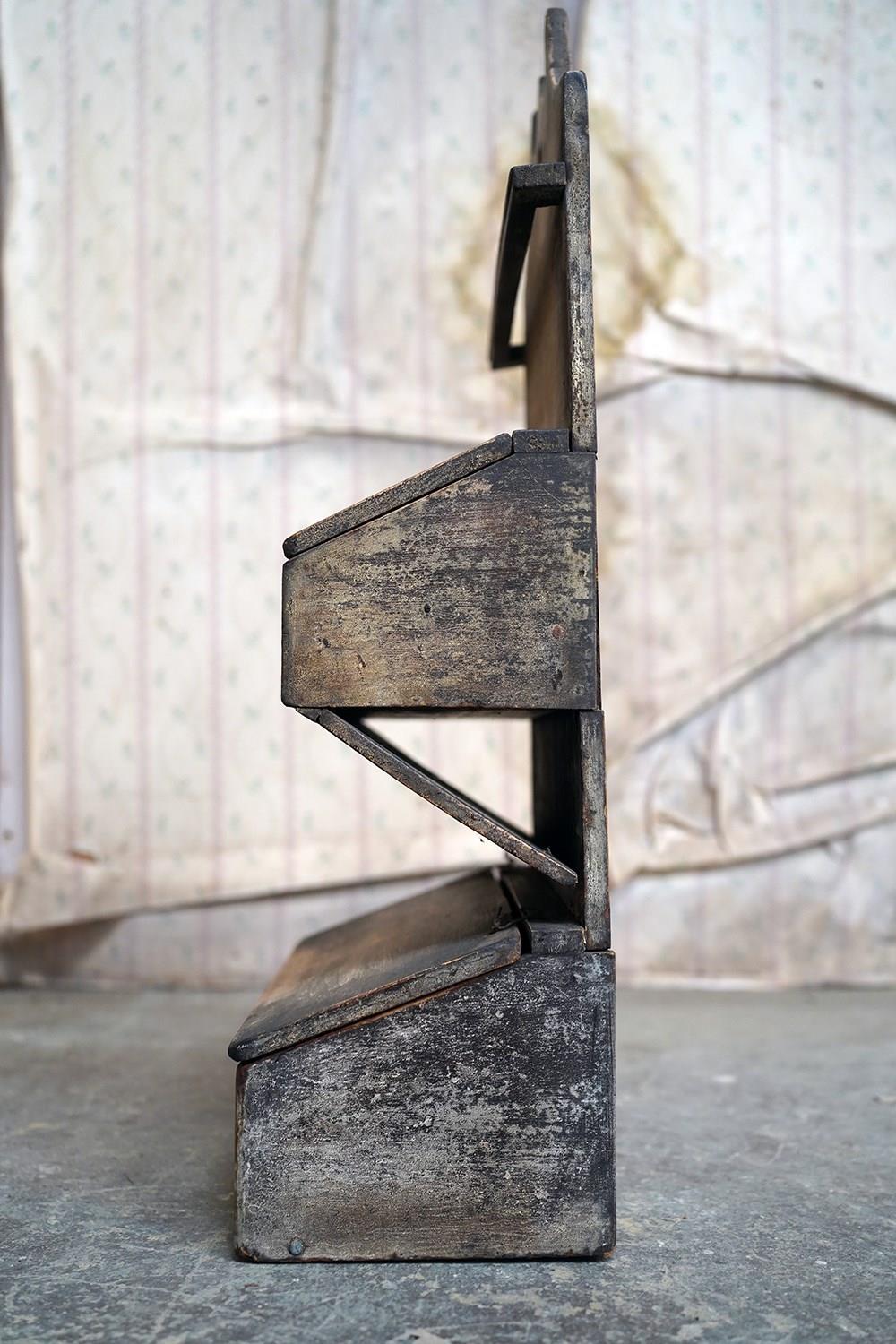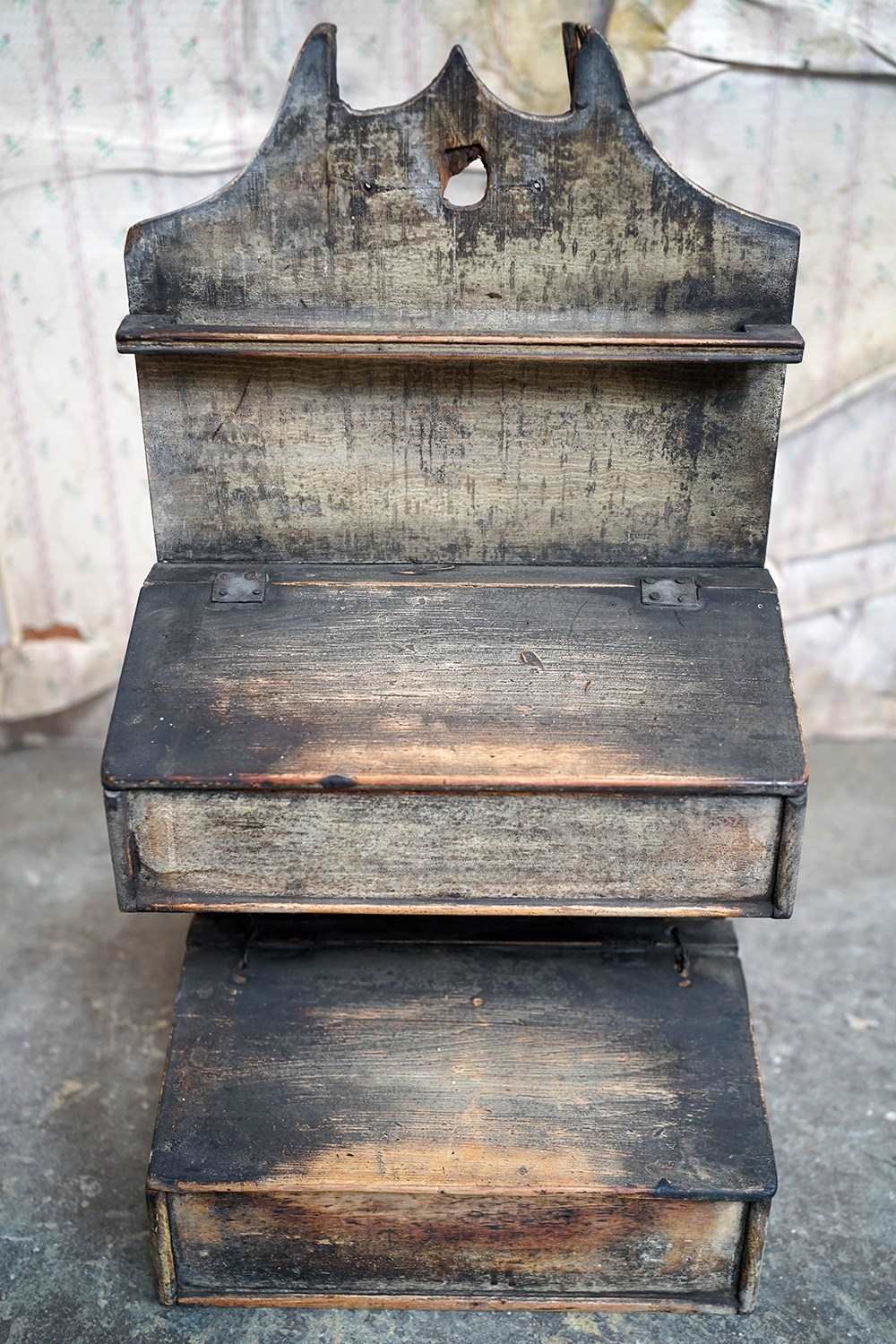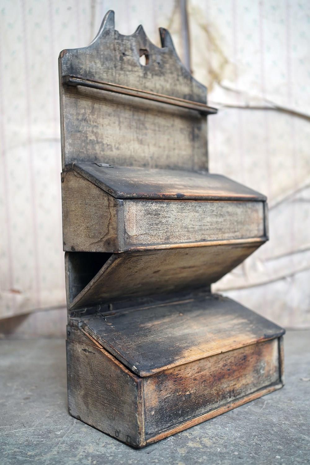 The painted pine carcass with three pronged cresting showing the wonderful original textured surface of original Georgian period pea green paint now worn and burnished to charcoal in many areas, worn thoroughly and consistently with age, having an attractive and unusual concertina shaped design, incorporating a spoon rack over a double cutlery box to hinged lids with leather and wire mounts, the whole surviving from the zeniths of eighteenth century England.