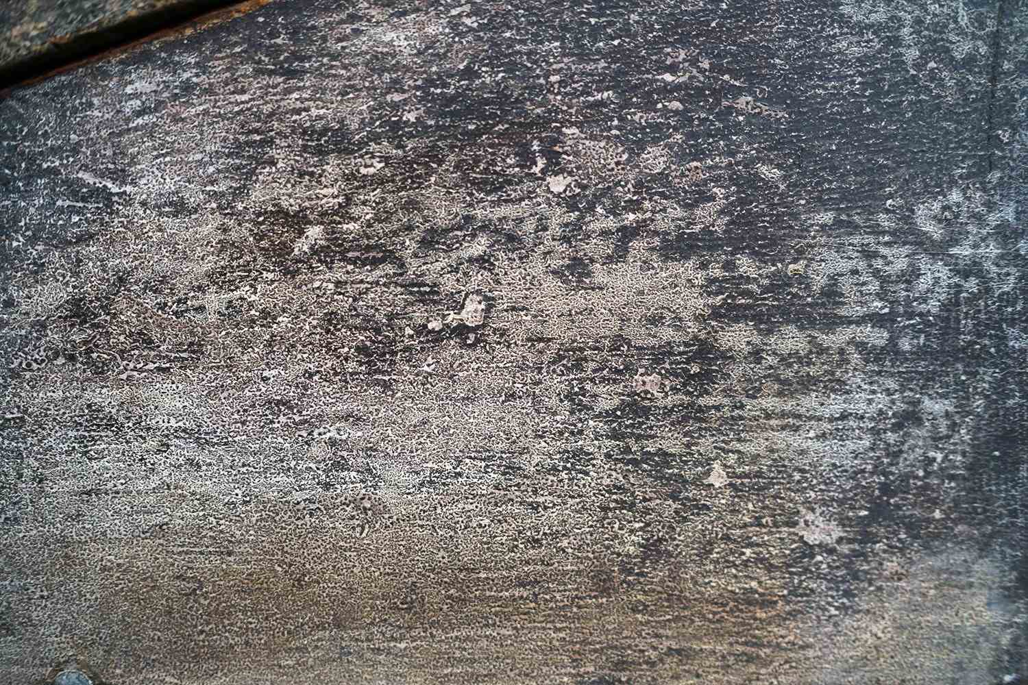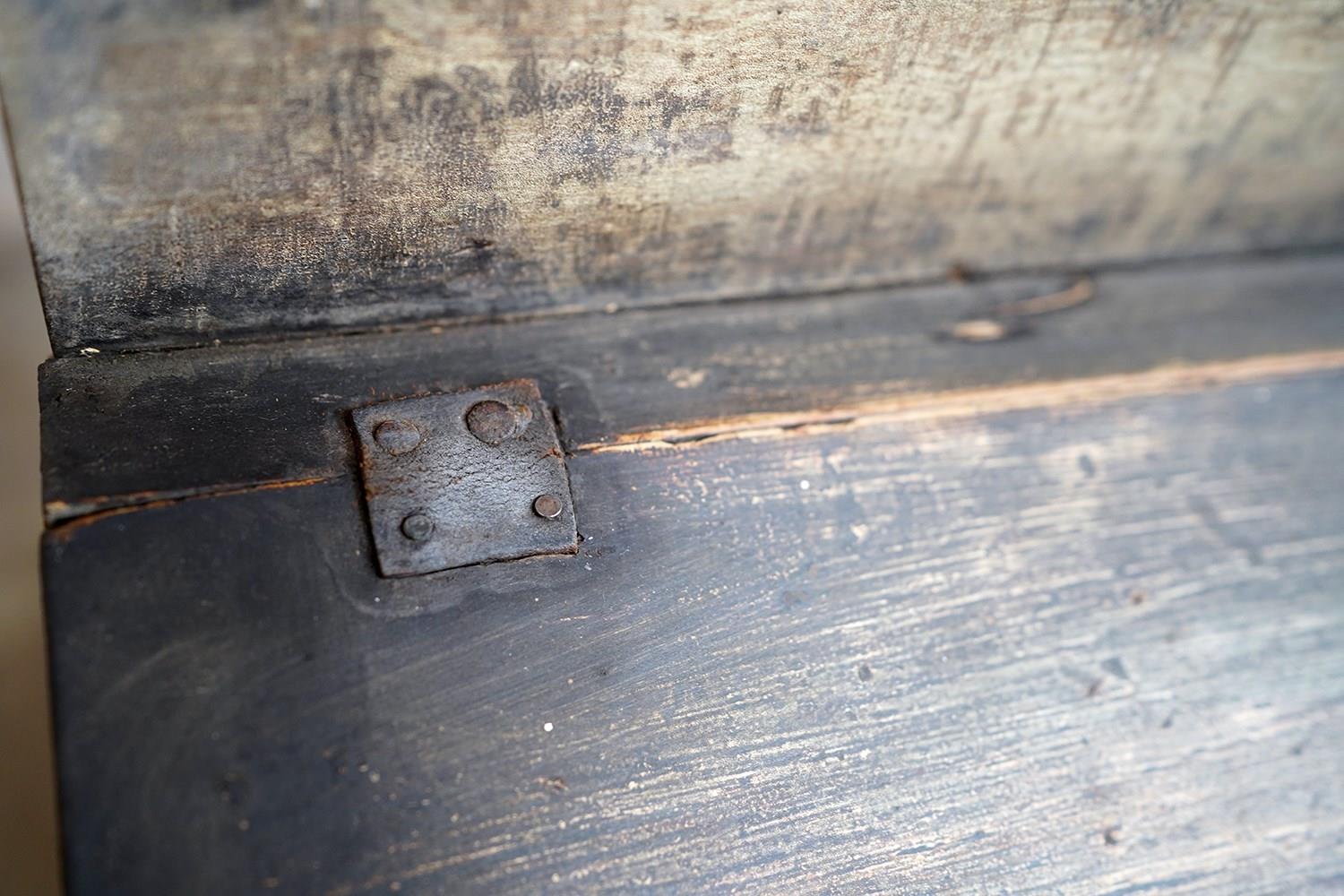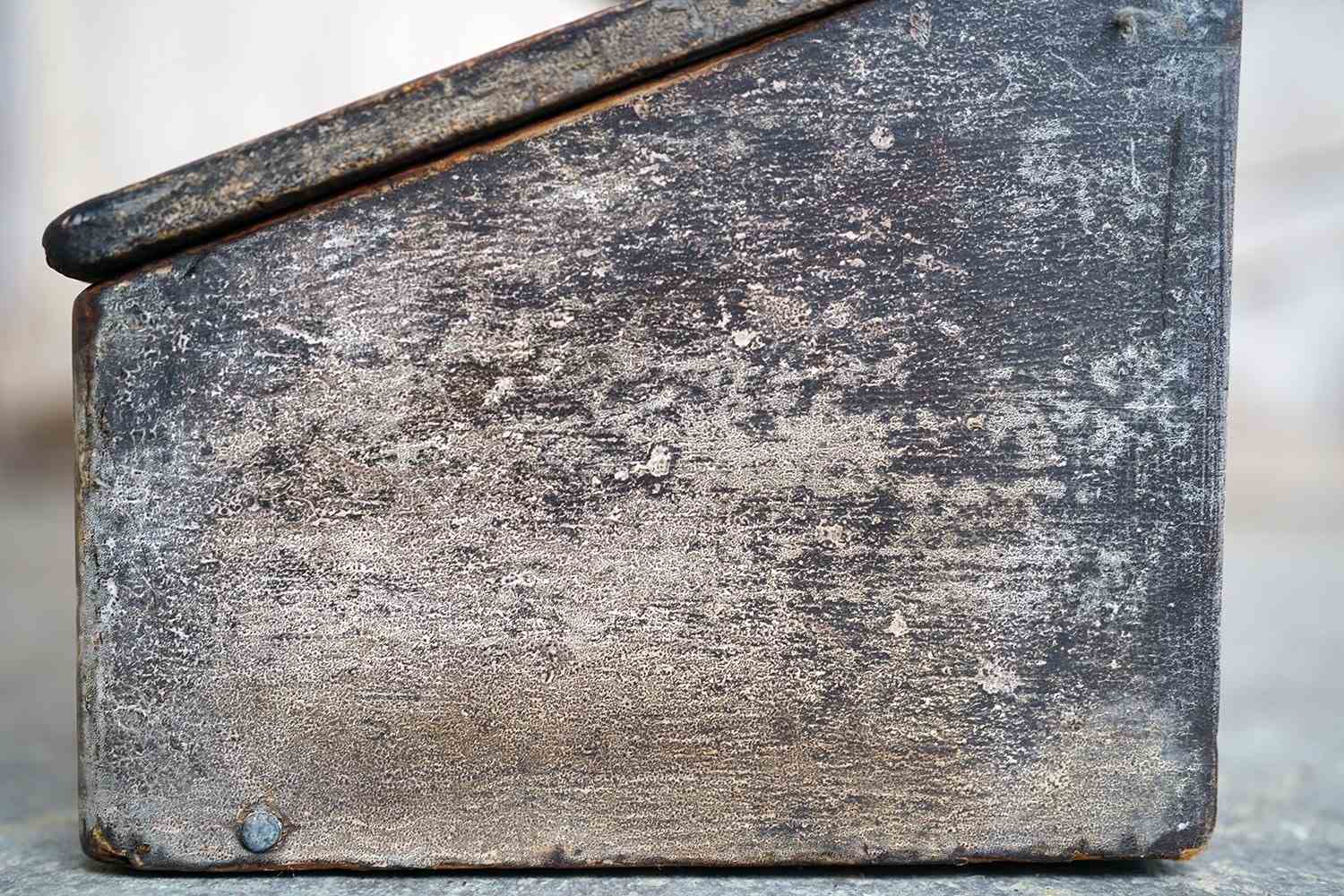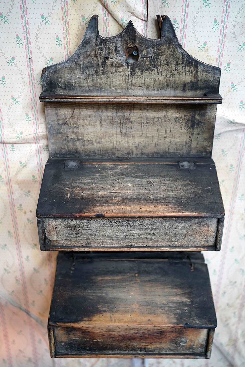 The painted pine carcass with three pronged cresting showing the wonderful original textured surface of original Georgian period pea green paint now worn and burnished to charcoal in many areas, worn thoroughly and consistently with age, having an attractive and unusual concertina shaped design, incorporating a spoon rack over a double cutlery box to hinged lids with leather and wire mounts, the whole surviving from the zeniths of eighteenth century England.