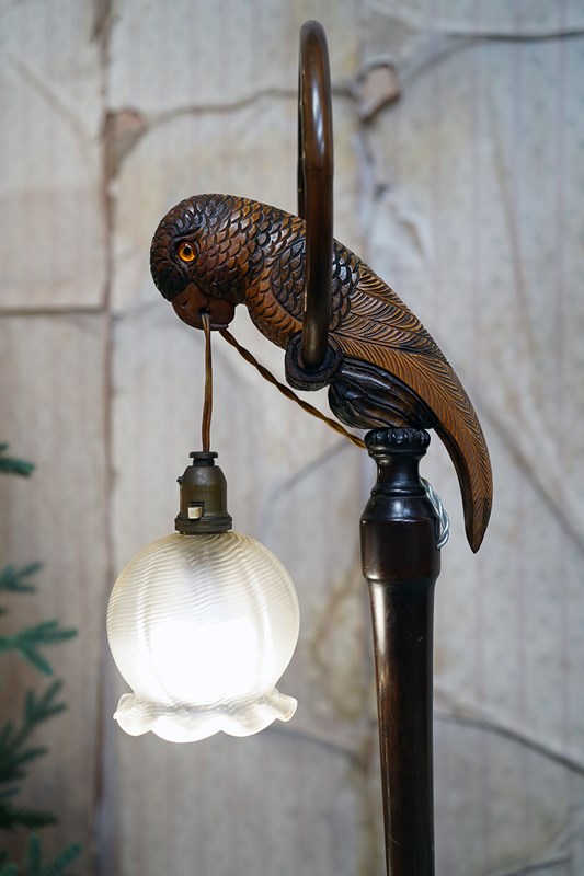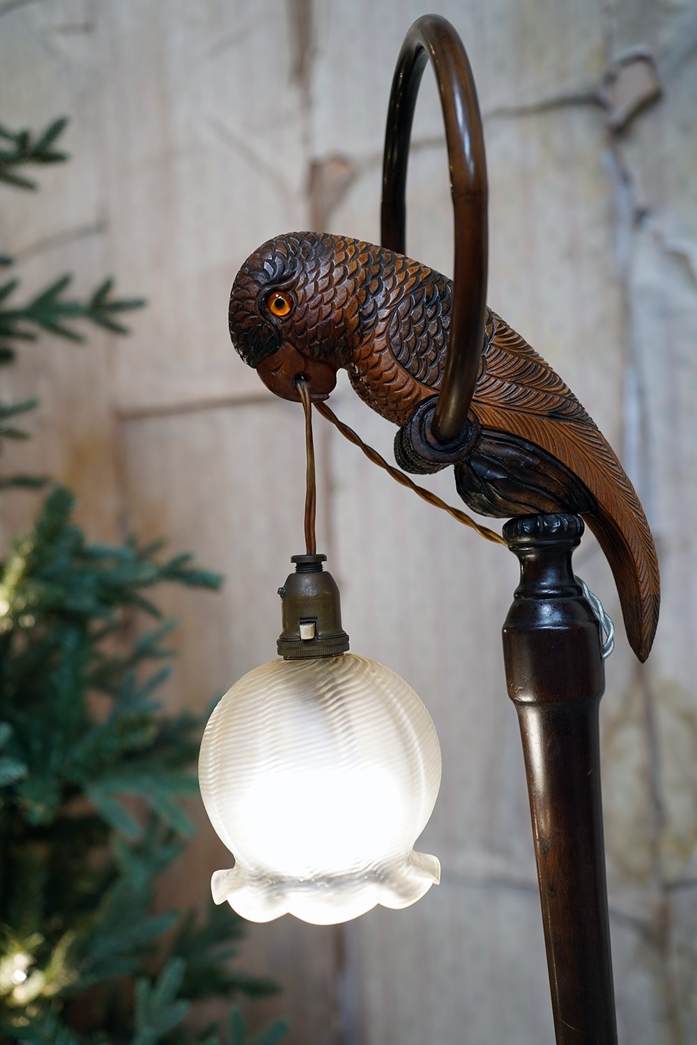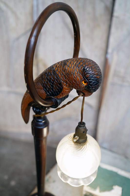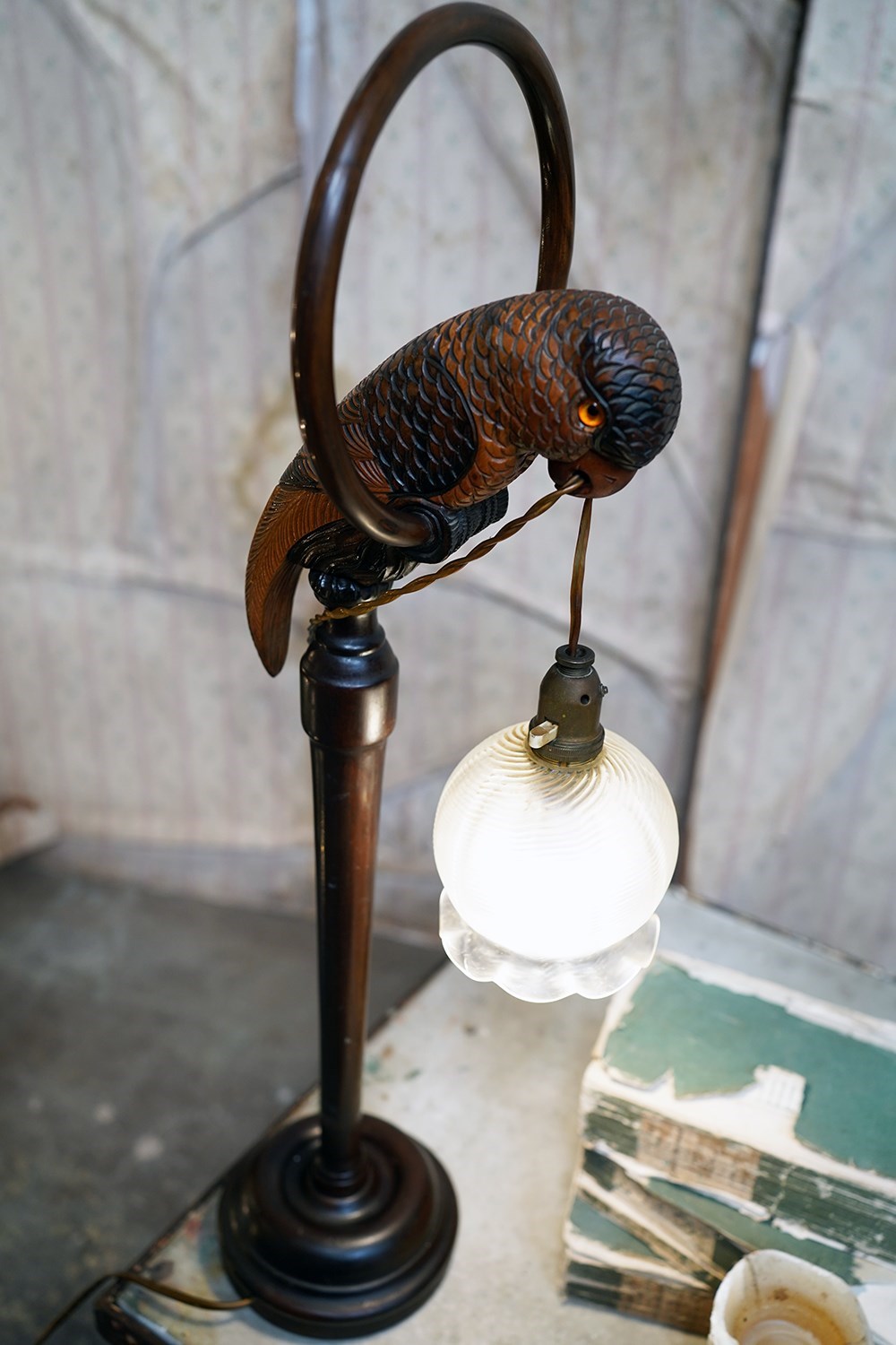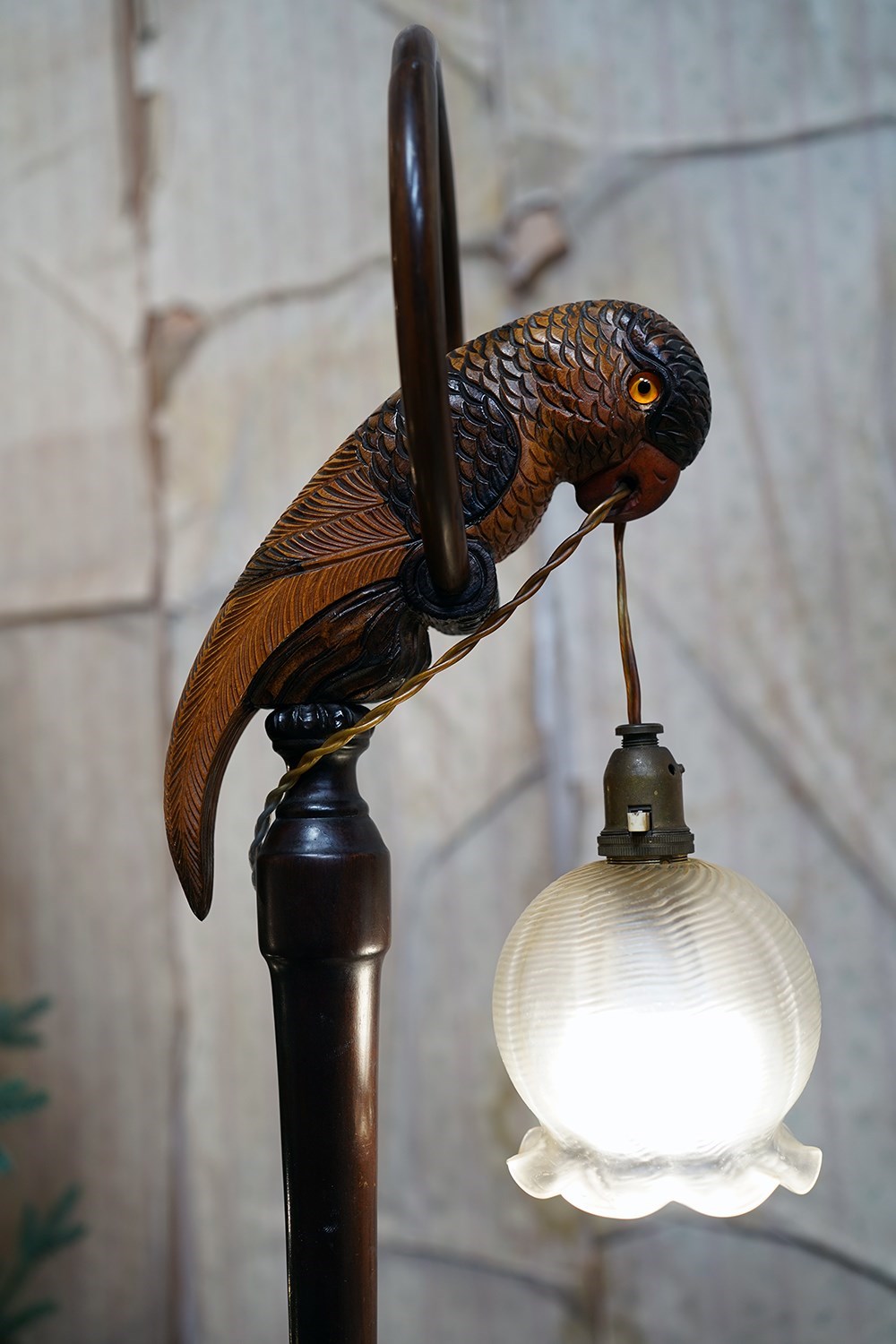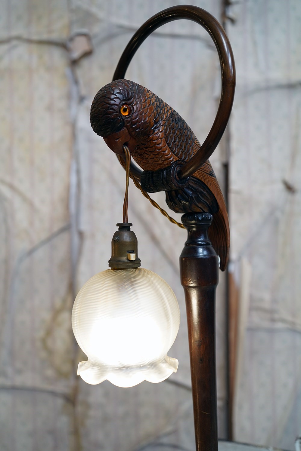 The unusual, and probably unique table lamp, having a naturalistically modelled parrot beautifully hand-carved with overlapping feathers and original polychrome decoration, perched upon a turned wooden hooped pedestal whilst grasping the flex in its beak, surviving with its original scalloped frosted glass shade, the whole surviving from the first quarter of the twentieth century and likely Germany.