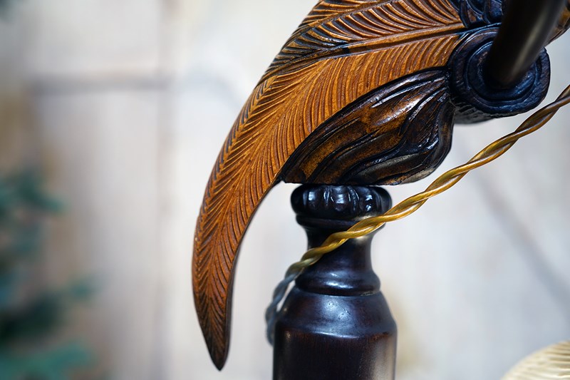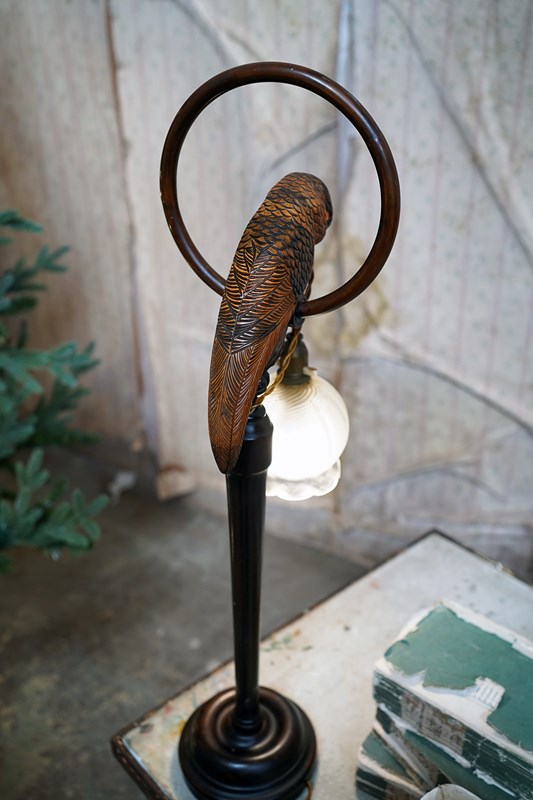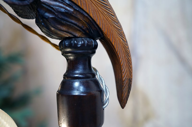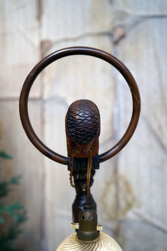 Examples of carved-bird lamps of this scale and sculptural quality scarcely appear, and this model does not correspond to any commercial catalogue lighting of the period, suggesting it may have been a one-off workshop or artisan piece, possibly Black Forest-influenced or made for a specific interior or theatrical setting. The turned column and weighted base, both in dark-stained hardwood, further root the piece in the 1910–1930 period and these dates there was also a strong German and Swiss export market for carved animal lamps, often sold through Paris, London and New York retailers