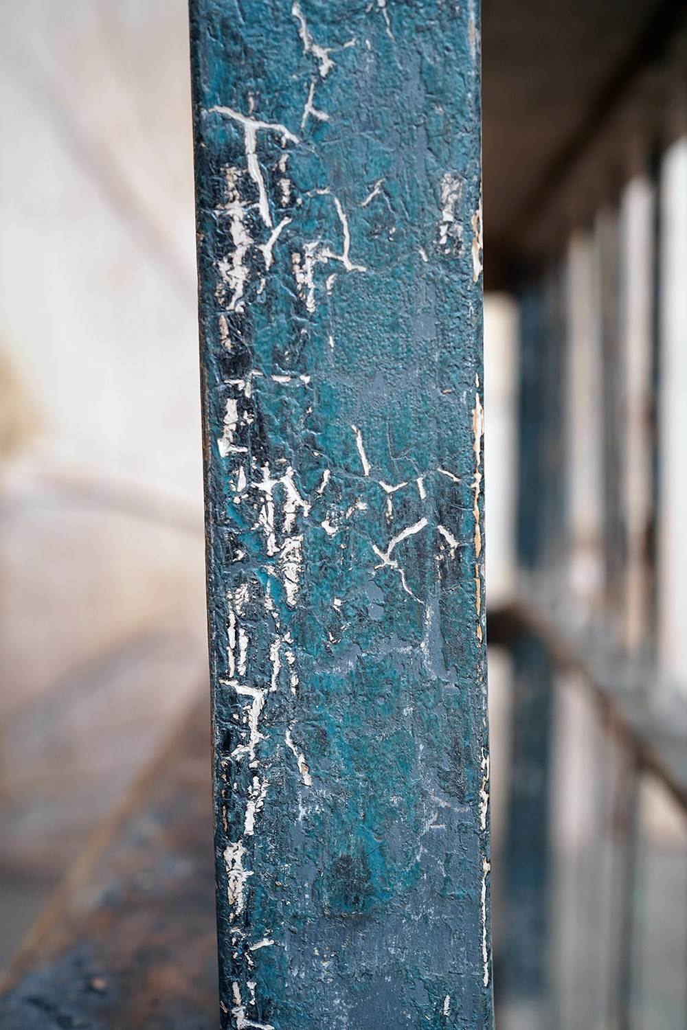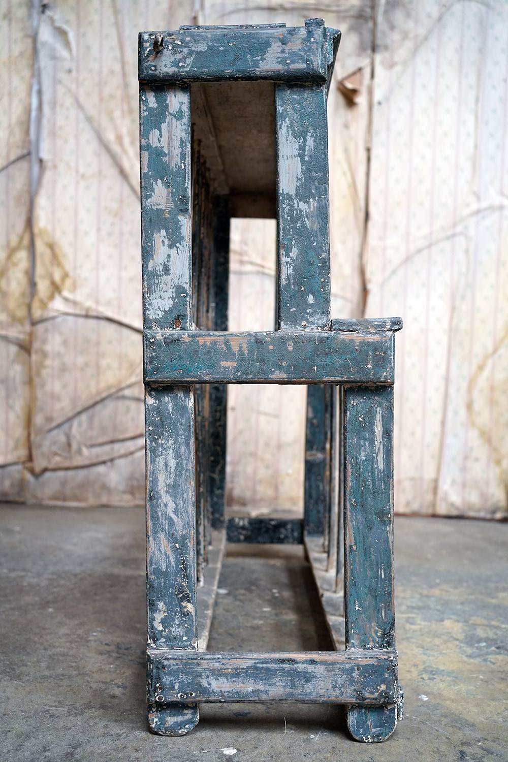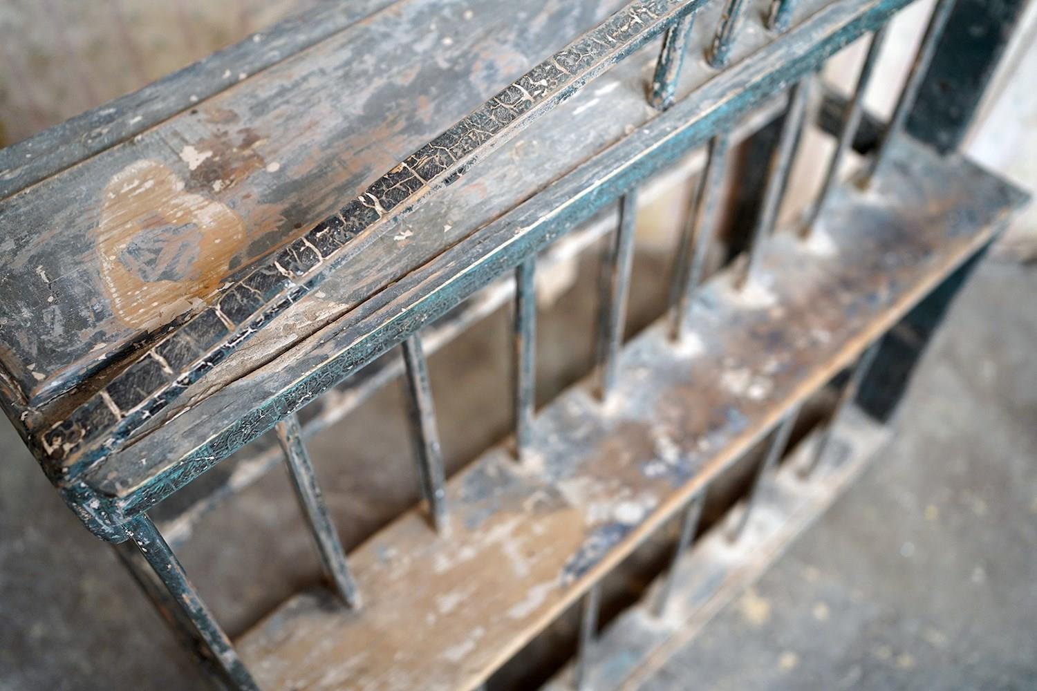 The beautifully textured hanging plate rack of good size displaying the stunning original layers of time-worn paint in slate and turquoise greens, of naïve construction, and having fifteen compartments in total, nine smaller over and six larger under, with a bentwood cornice to sledge feet and likely surviving from the second quarter of nineteenth century Ireland.