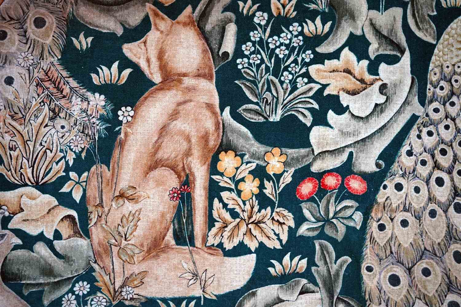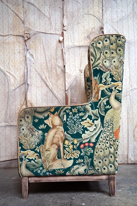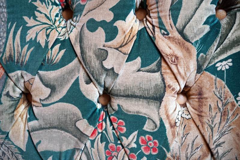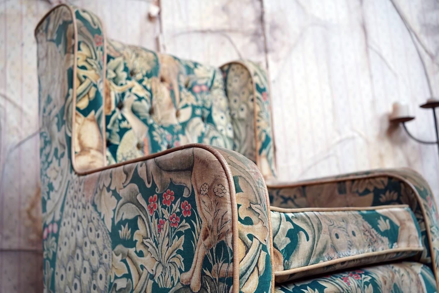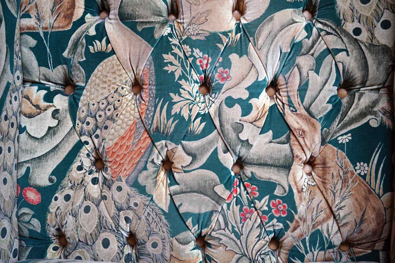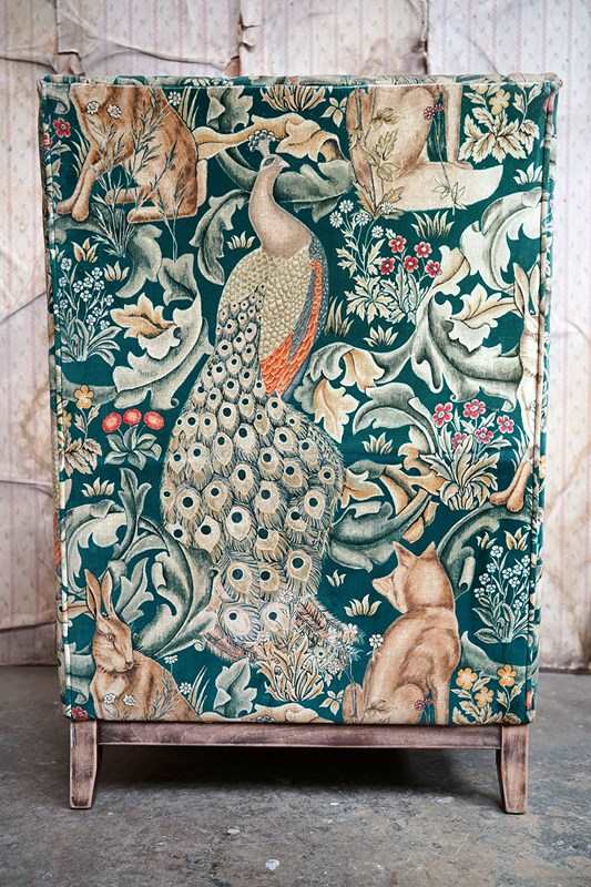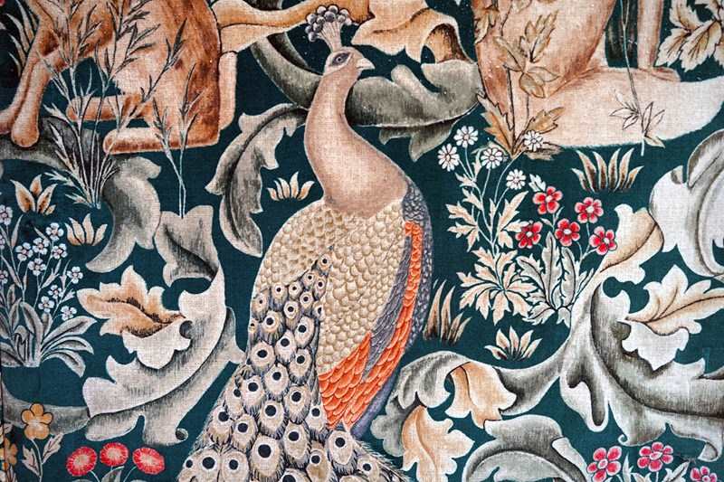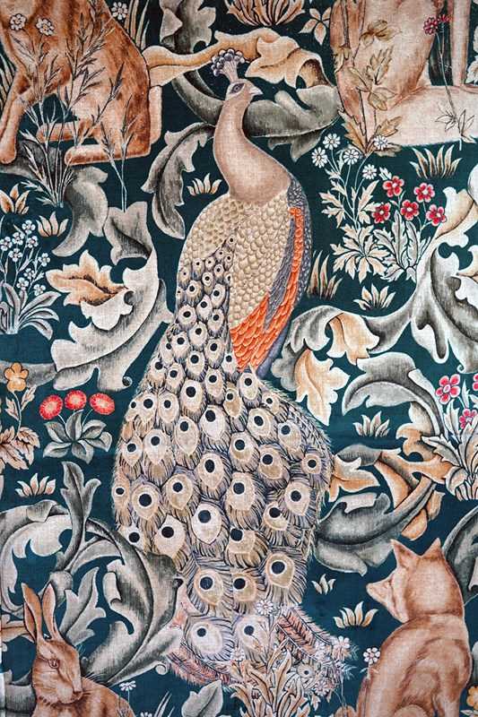 William Morris' use of birds and animals in his early tapestries is a forebear to his later carpet patterns. Morris placed great value on work and the joy of craftsmanship. His belief in the natural beauty of materials led him to learn and revive traditional skills such as natural dyeing, hand block printing and tapestry weaving. The fabric marries well with the rather more sexy and curvaceous Art Deco period here.