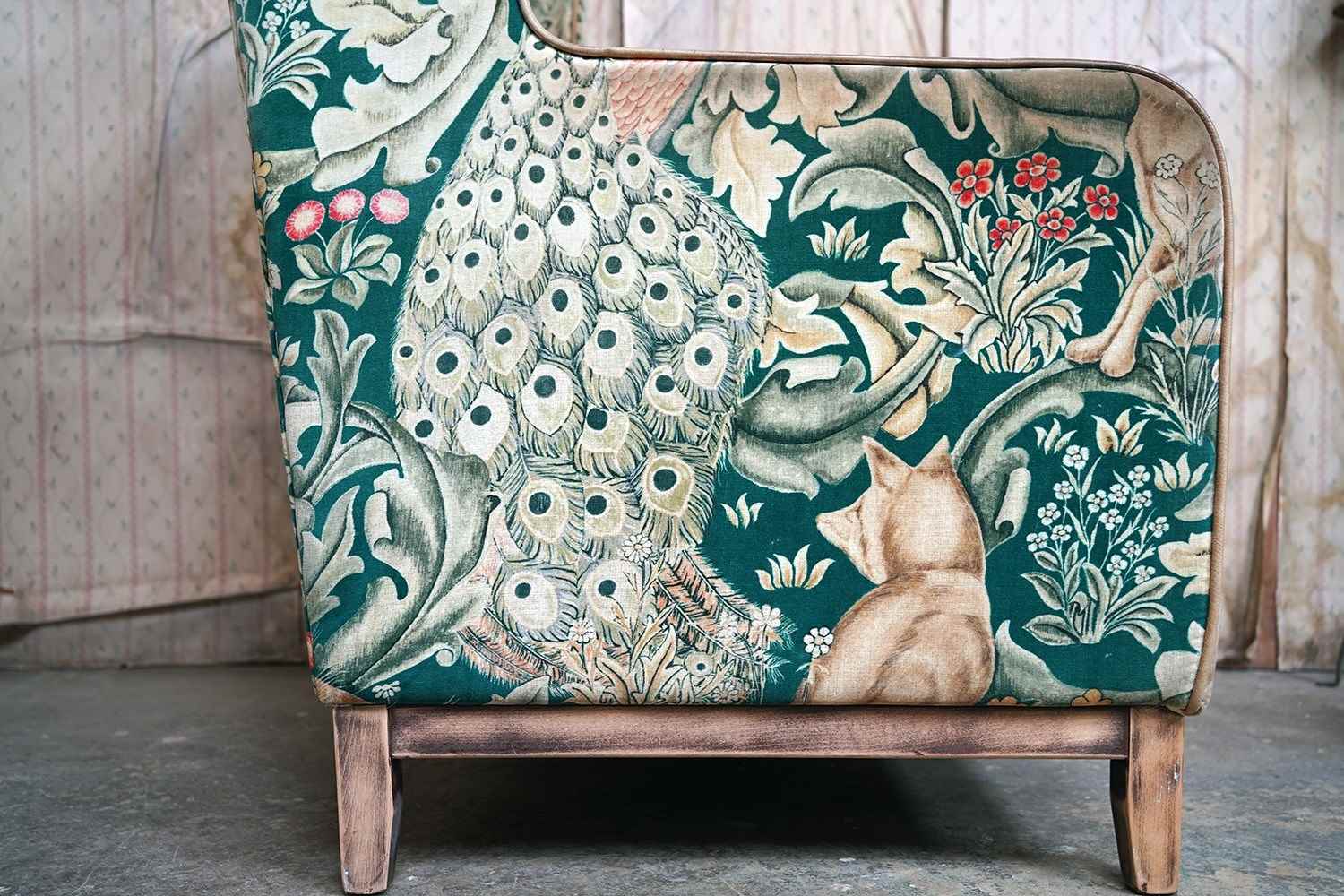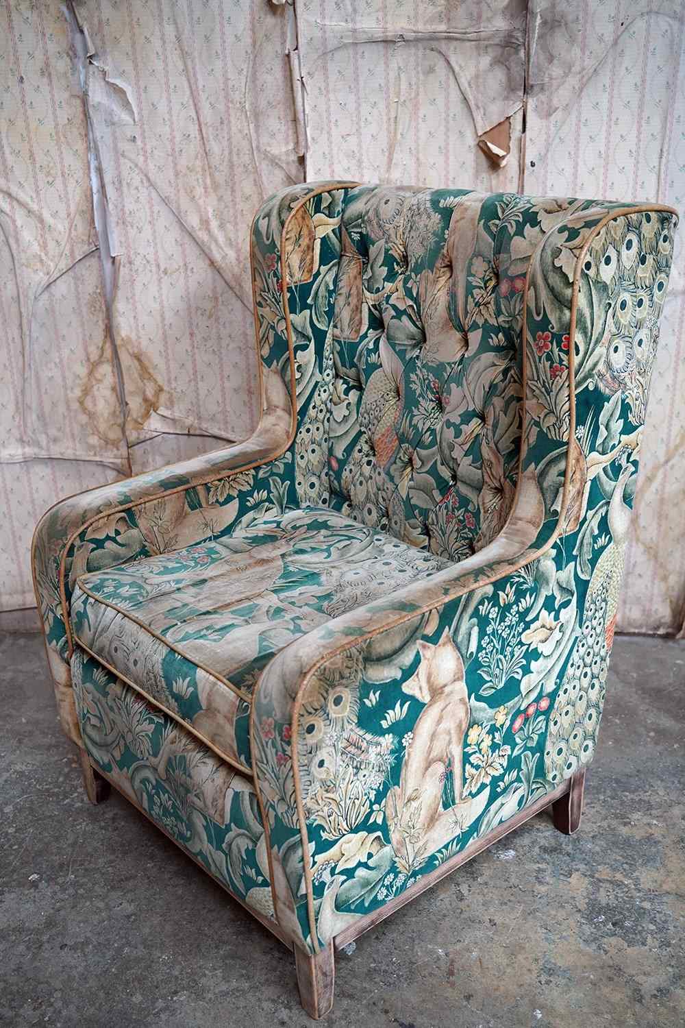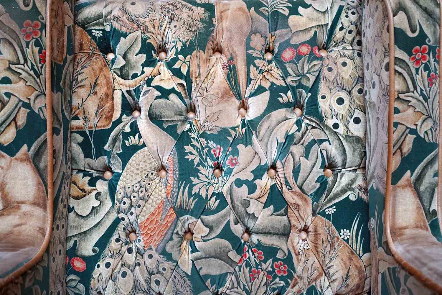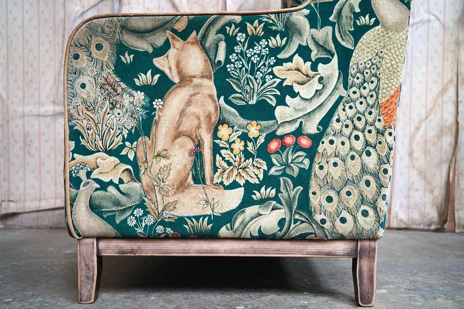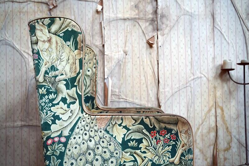 William Morris' use of birds and animals in his early tapestries is a forebear to his later carpet patterns. Morris placed great value on work and the joy of craftsmanship. His belief in the natural beauty of materials led him to learn and revive traditional skills such as natural dyeing, hand block printing and tapestry weaving. The fabric marries well with the rather more sexy and curvaceous Art Deco period here.