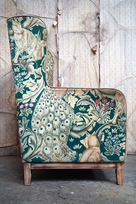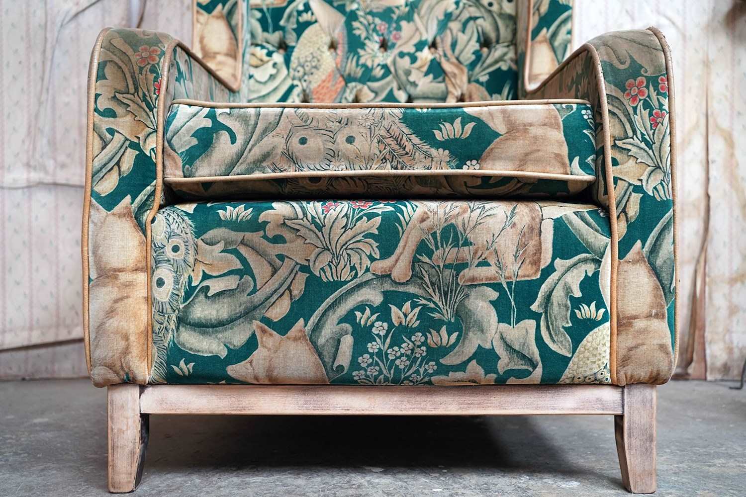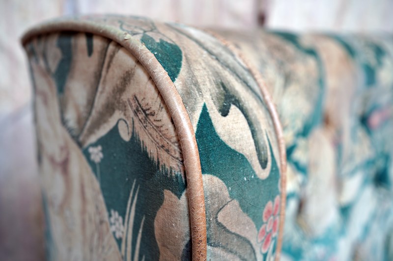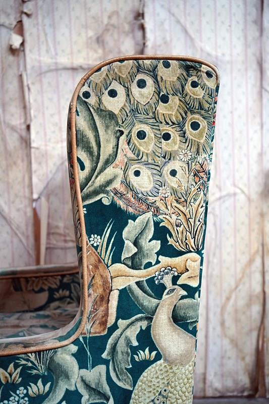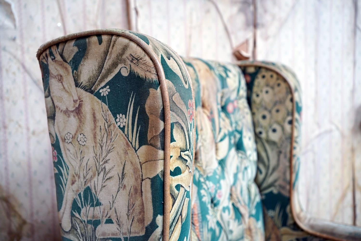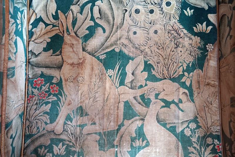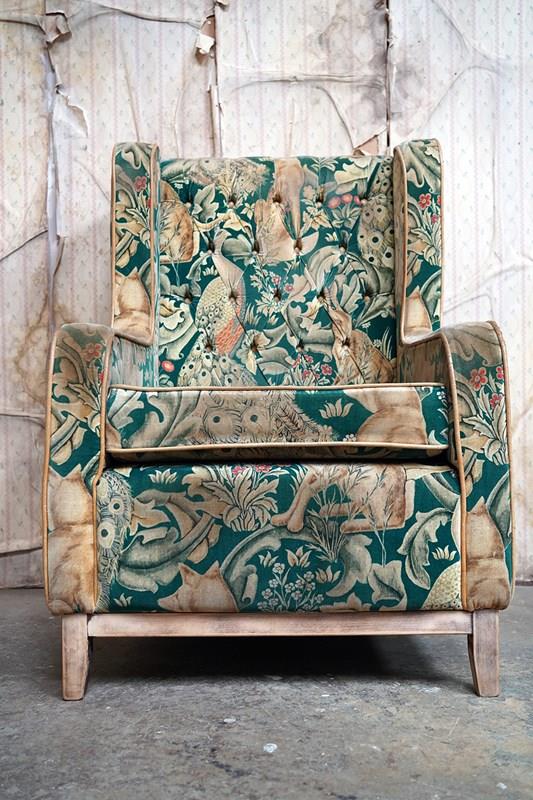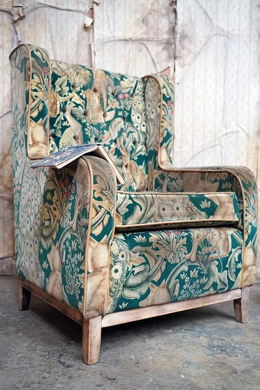 William Morris' use of birds and animals in his early tapestries is a forebear to his later carpet patterns. Morris placed great value on work and the joy of craftsmanship. His belief in the natural beauty of materials led him to learn and revive traditional skills such as natural dyeing, hand block printing and tapestry weaving. The fabric marries well with the rather more sexy and curvaceous Art Deco period here.