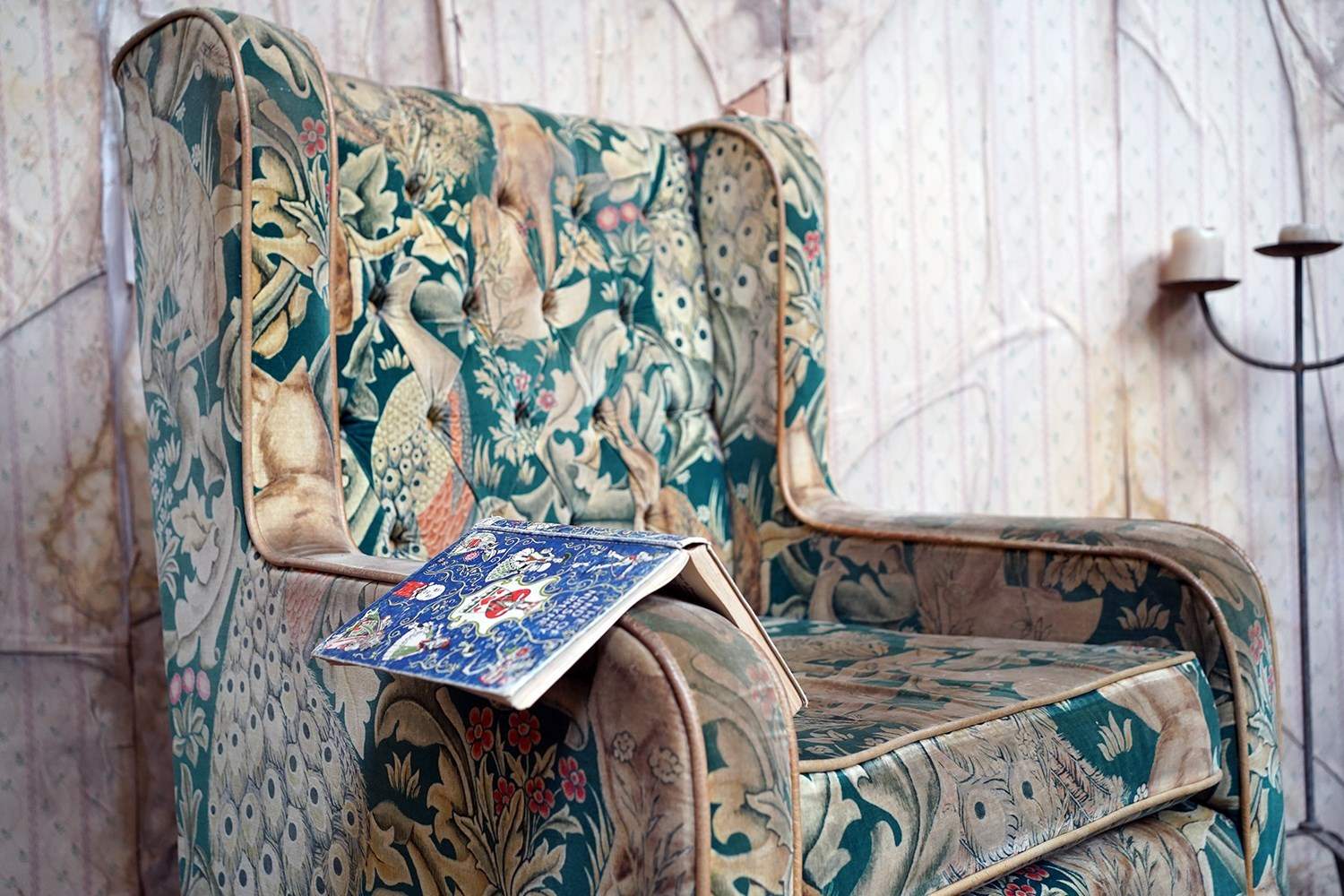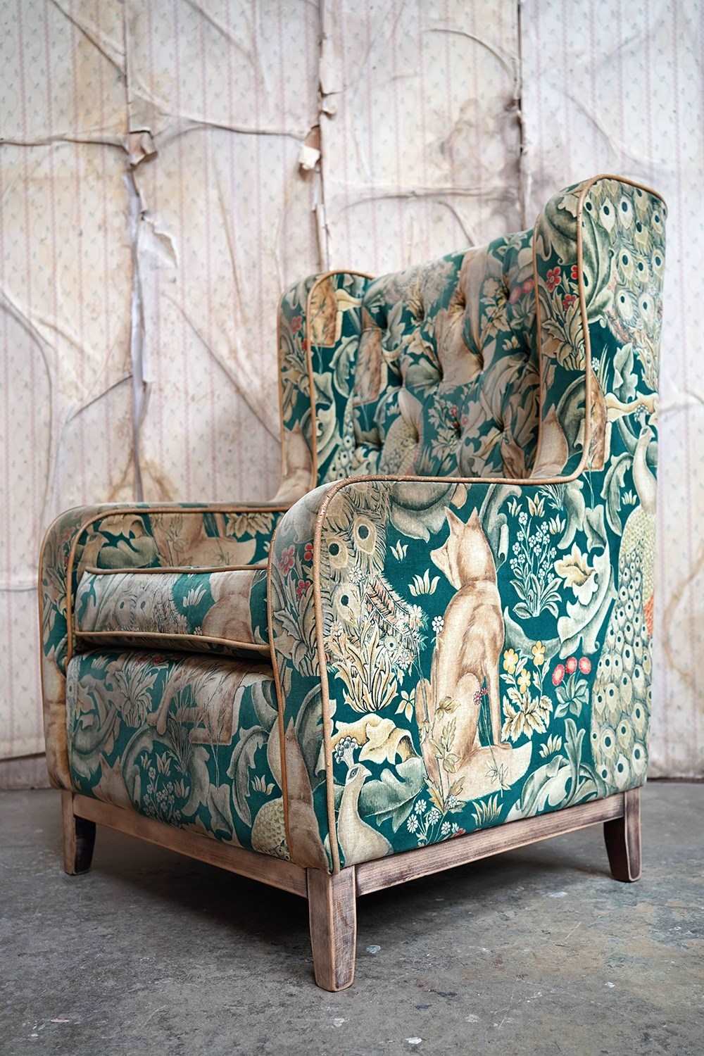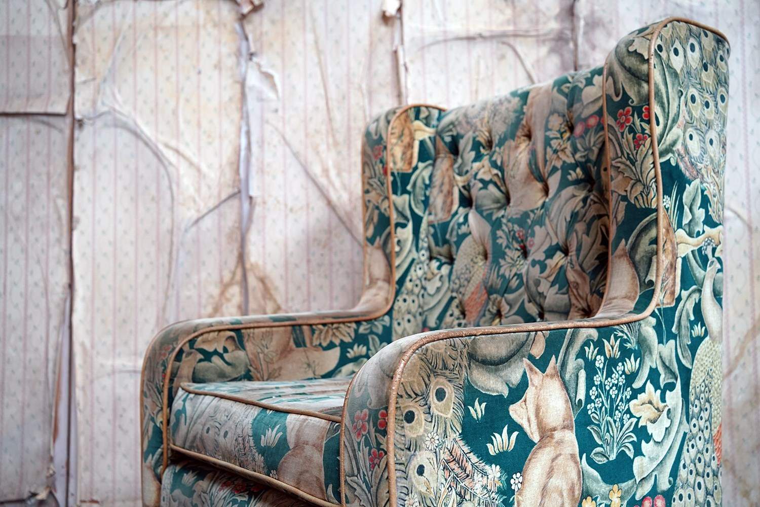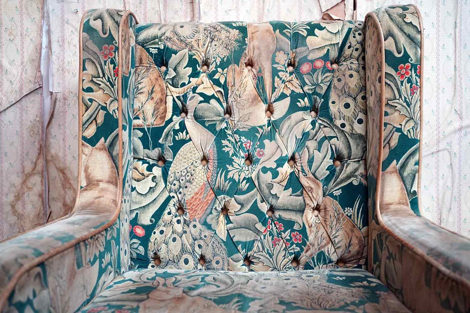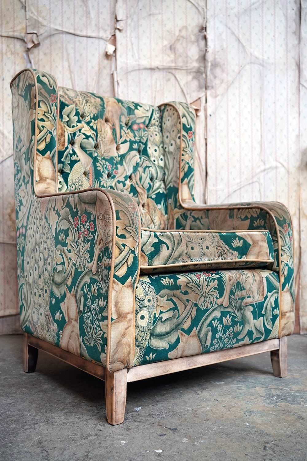 William Morris' use of birds and animals in his early tapestries is a forebear to his later carpet patterns. Morris placed great value on work and the joy of craftsmanship. His belief in the natural beauty of materials led him to learn and revive traditional skills such as natural dyeing, hand block printing and tapestry weaving. The fabric marries well with the rather more sexy and curvaceous Art Deco period here.