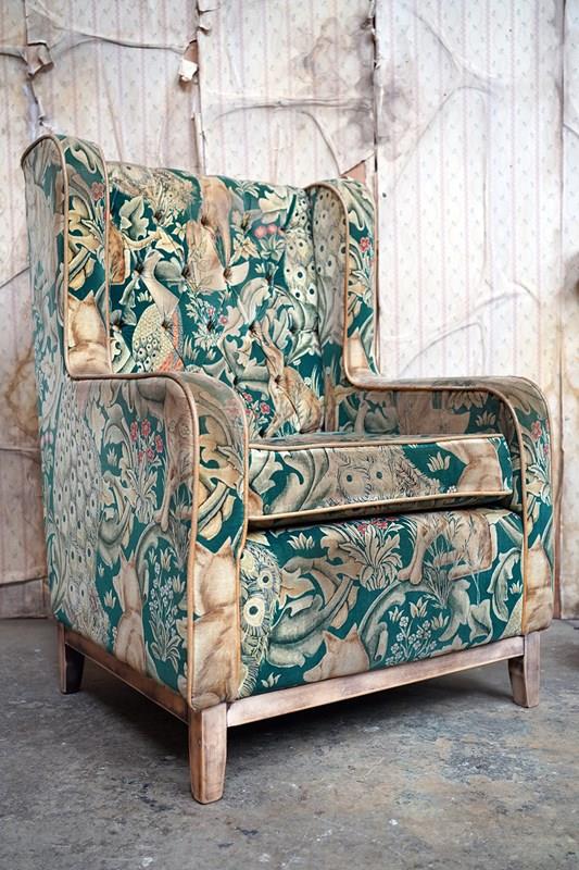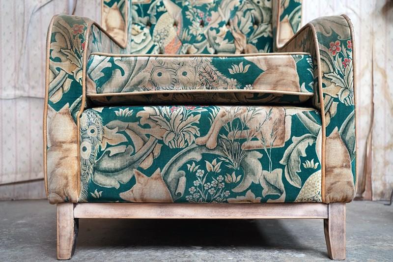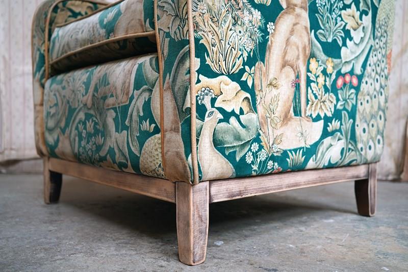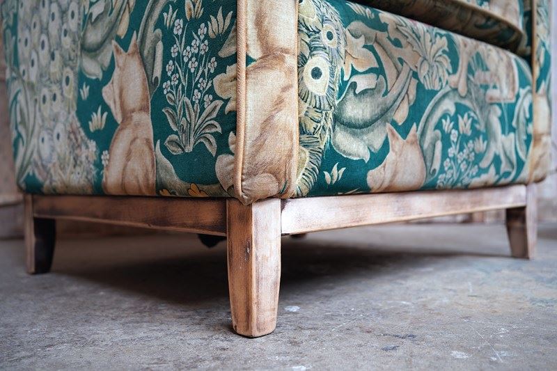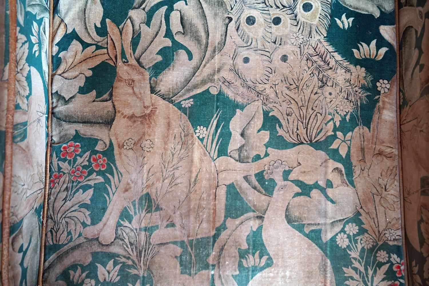 The very comfortable sanded beech frame of modular type form having undulating shaped arms, winged back and square tapering legs, the whole upholstered in a William Morris Forest velvet fabric with a forest green ground, depicting scrolling acanthus leaves, peacocks, hares and foxes amongst bunches of wild flowers inspired by the Forest Tapestry to tan leather piping, the whole surviving from the second quarter of the twentieth century.