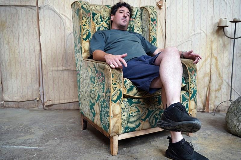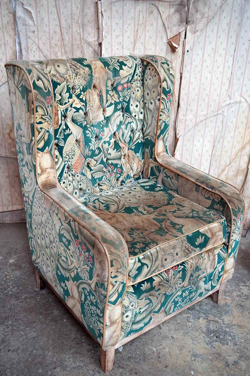 The chair remains in good overall condition, with the upholstery being nicely worn in the expected areas, the fade being to the seat and arms as photographed but not too far gone. It proves very comfortable. The upholstery is priced at £145 per meter.