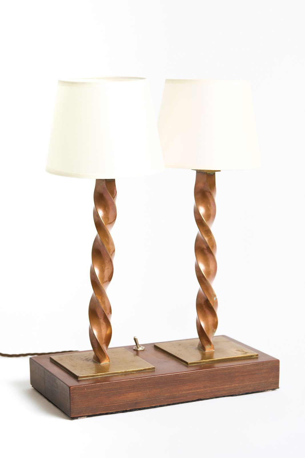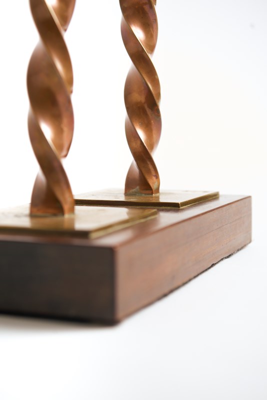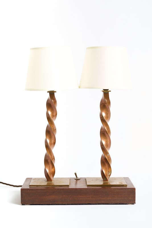 An Arts & Crafts table lamp, with two twisted copper stems, resting on a lignum vitae base.