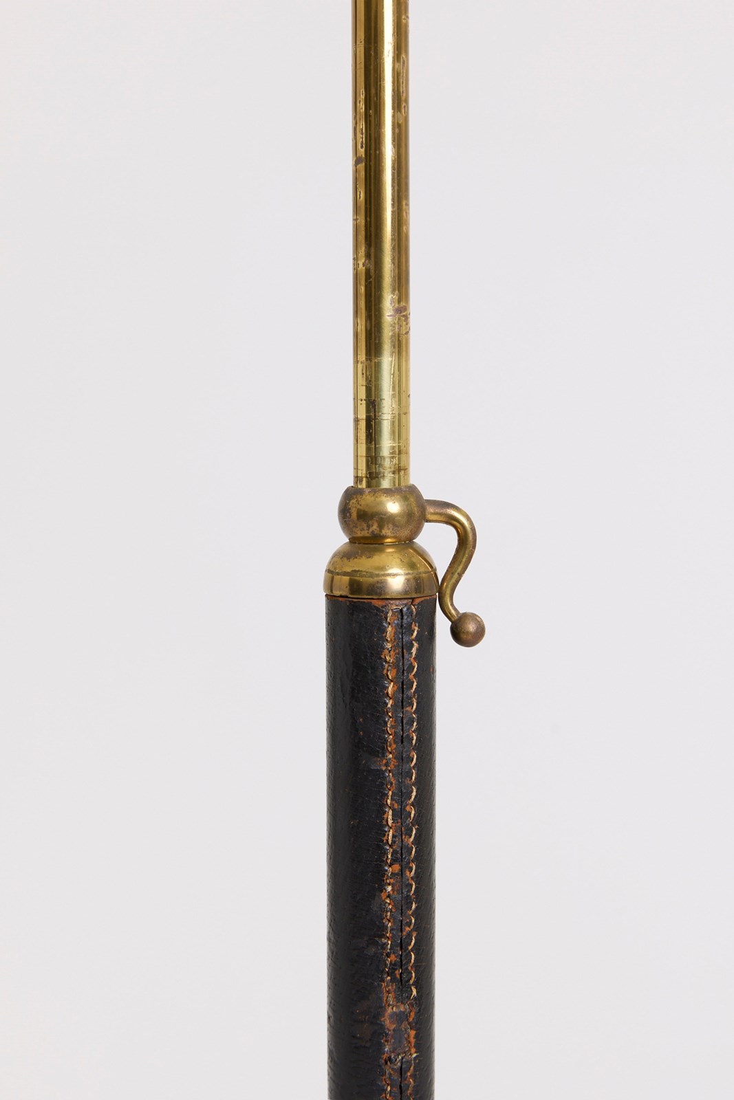 A brass and saddle stitched black leather floor lamp