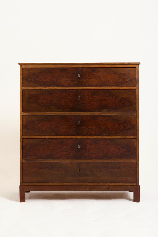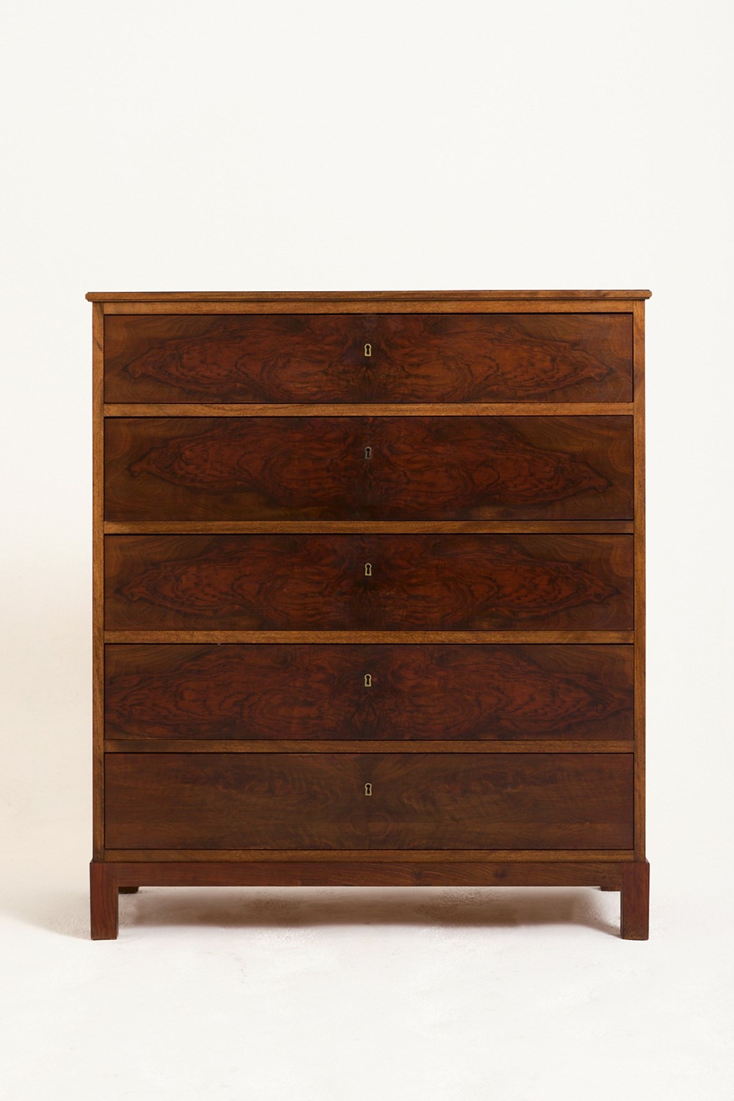 A rosewood chest of drawers, the second top drawer revealing a fitted secretaire and a dressing mirror.