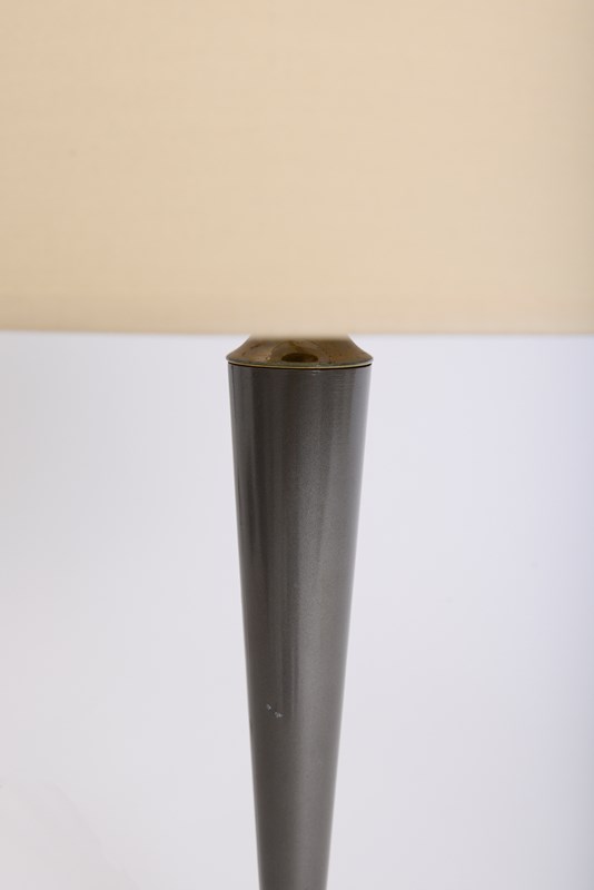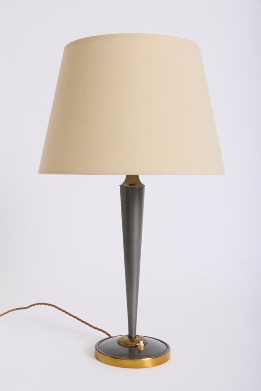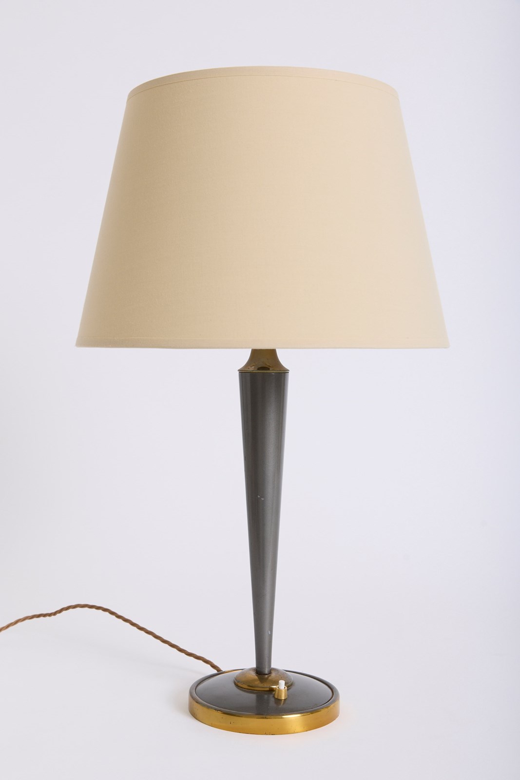 A brass and gunmetal table lamp France, mid 20th Century With the shade: 59.5 cm high by 35.5 cm diameter Lamp base only: 42 cm high by 15 cm diameter