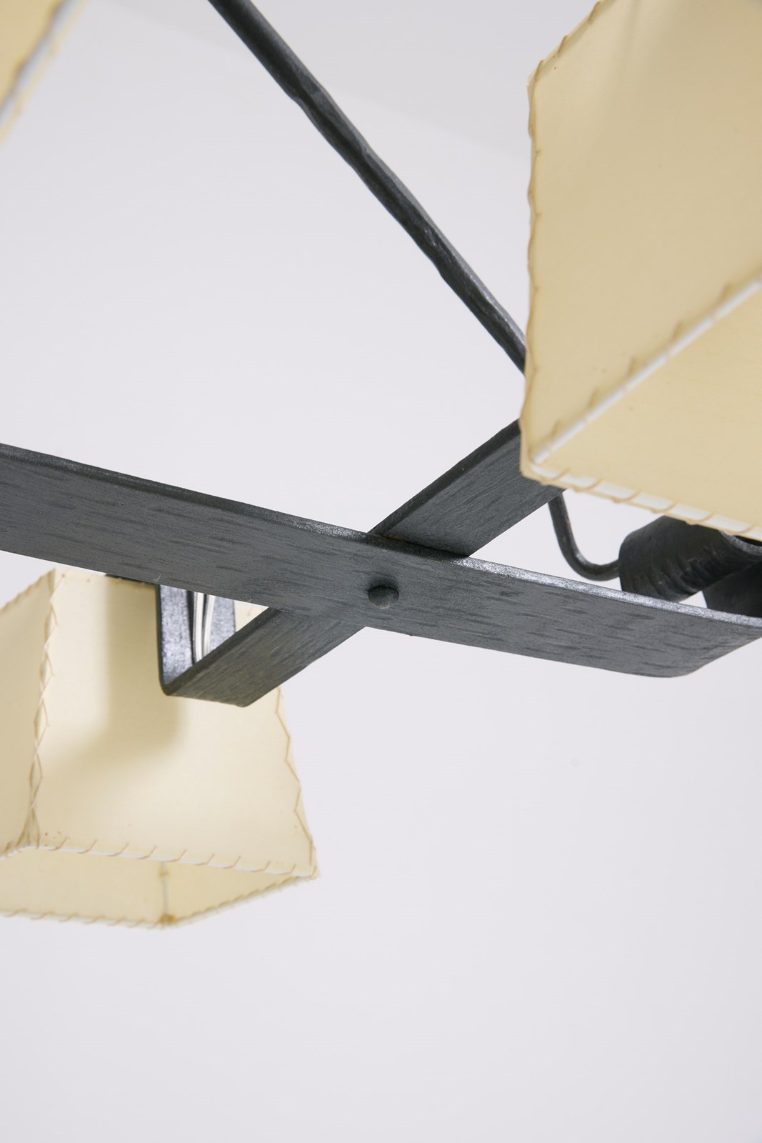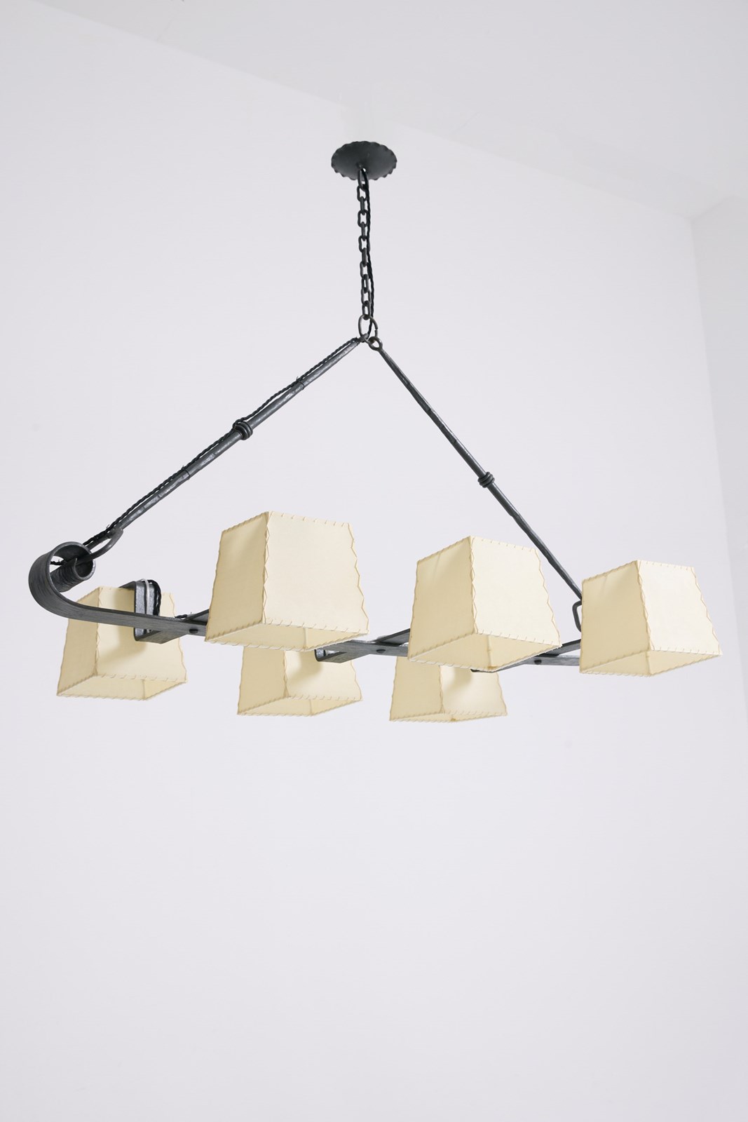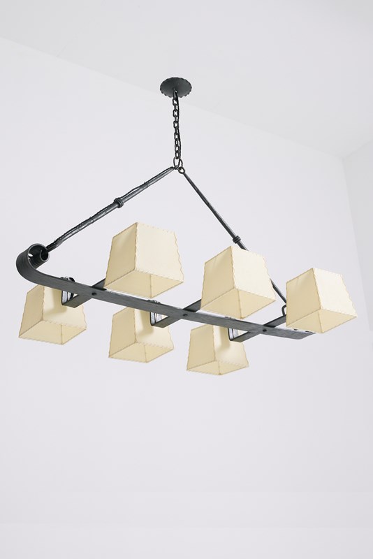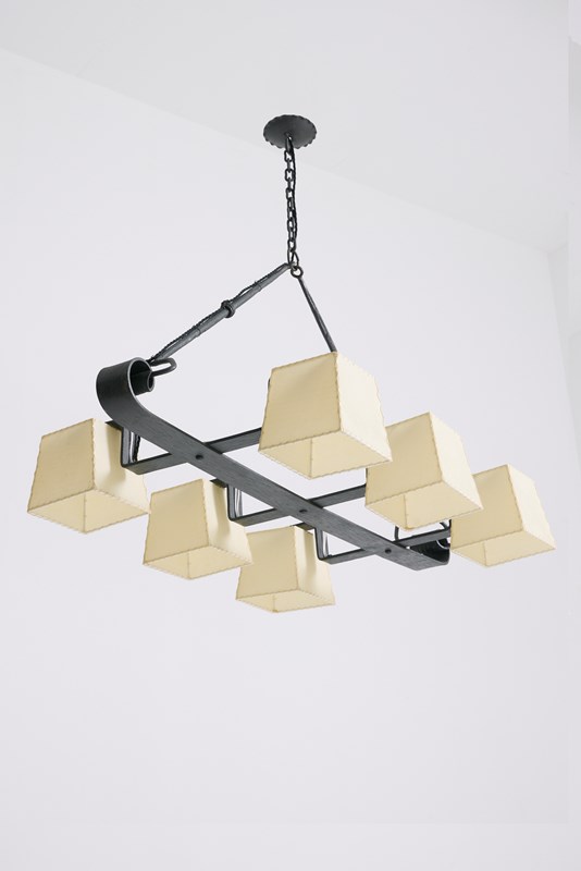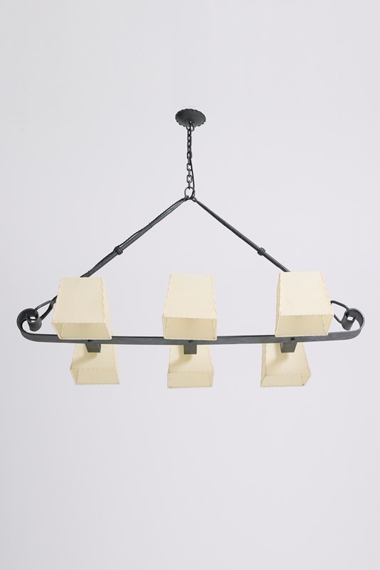 A six-light forged iron and parchment shades ceiling light