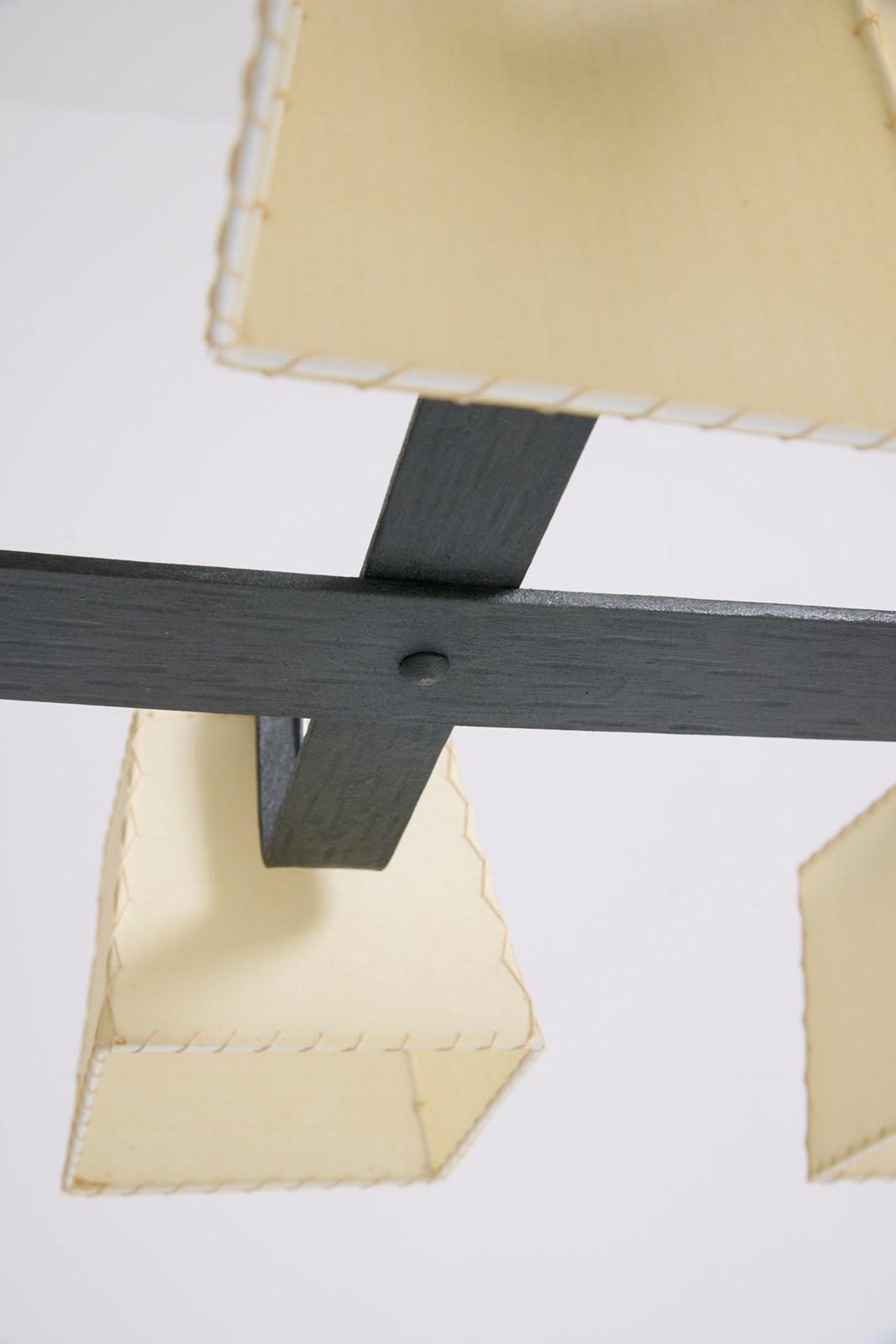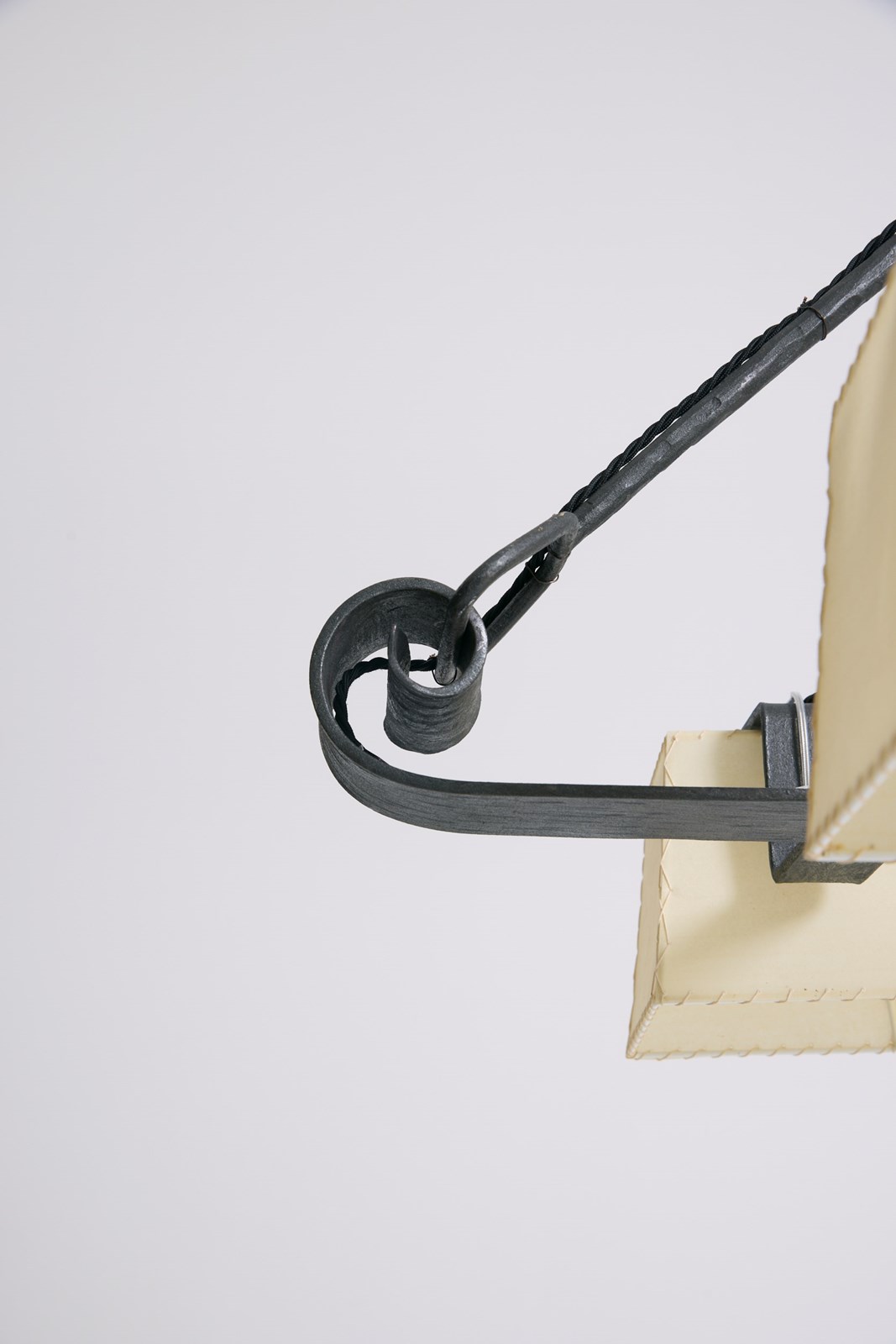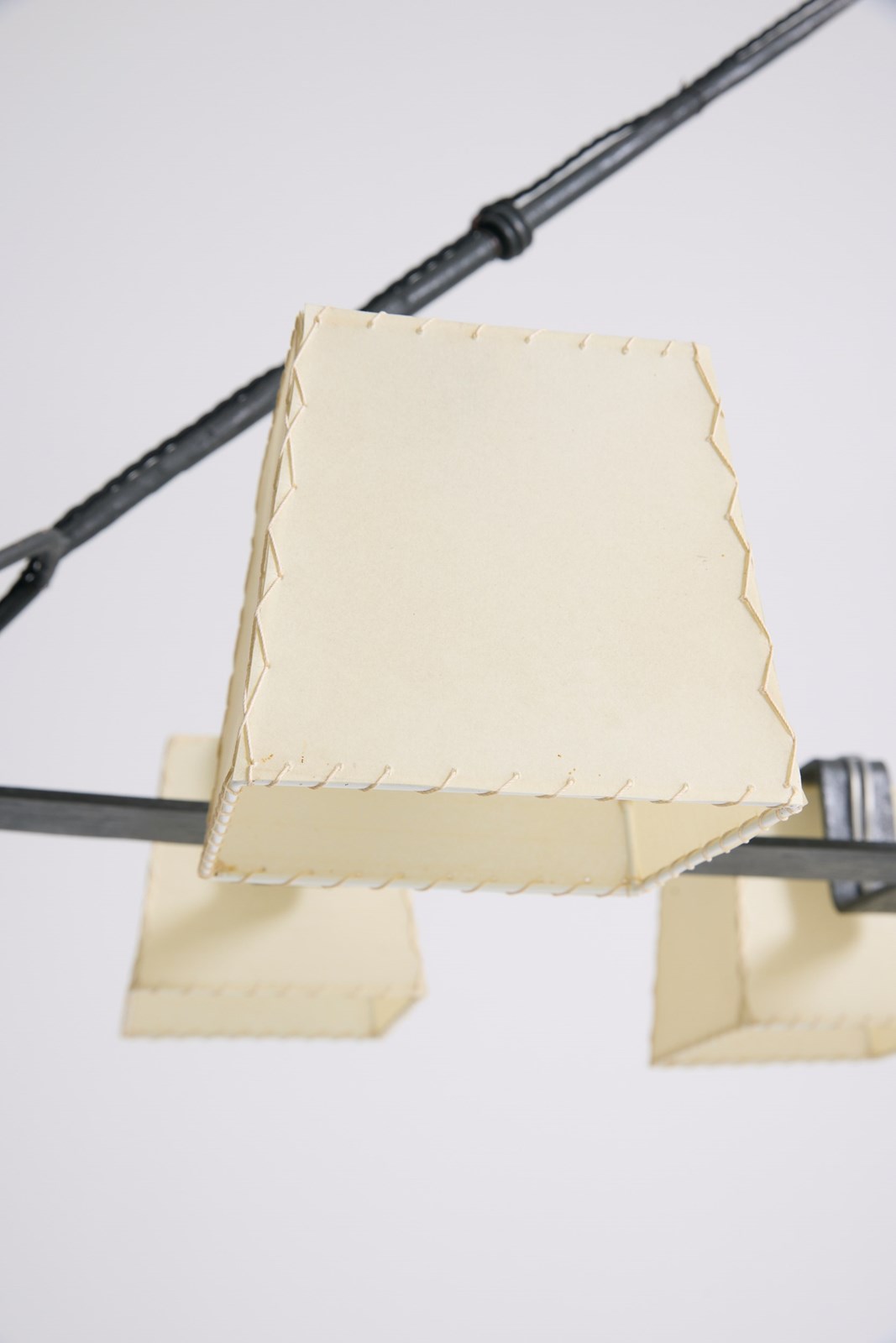 A six-light forged iron and parchment shades ceiling light