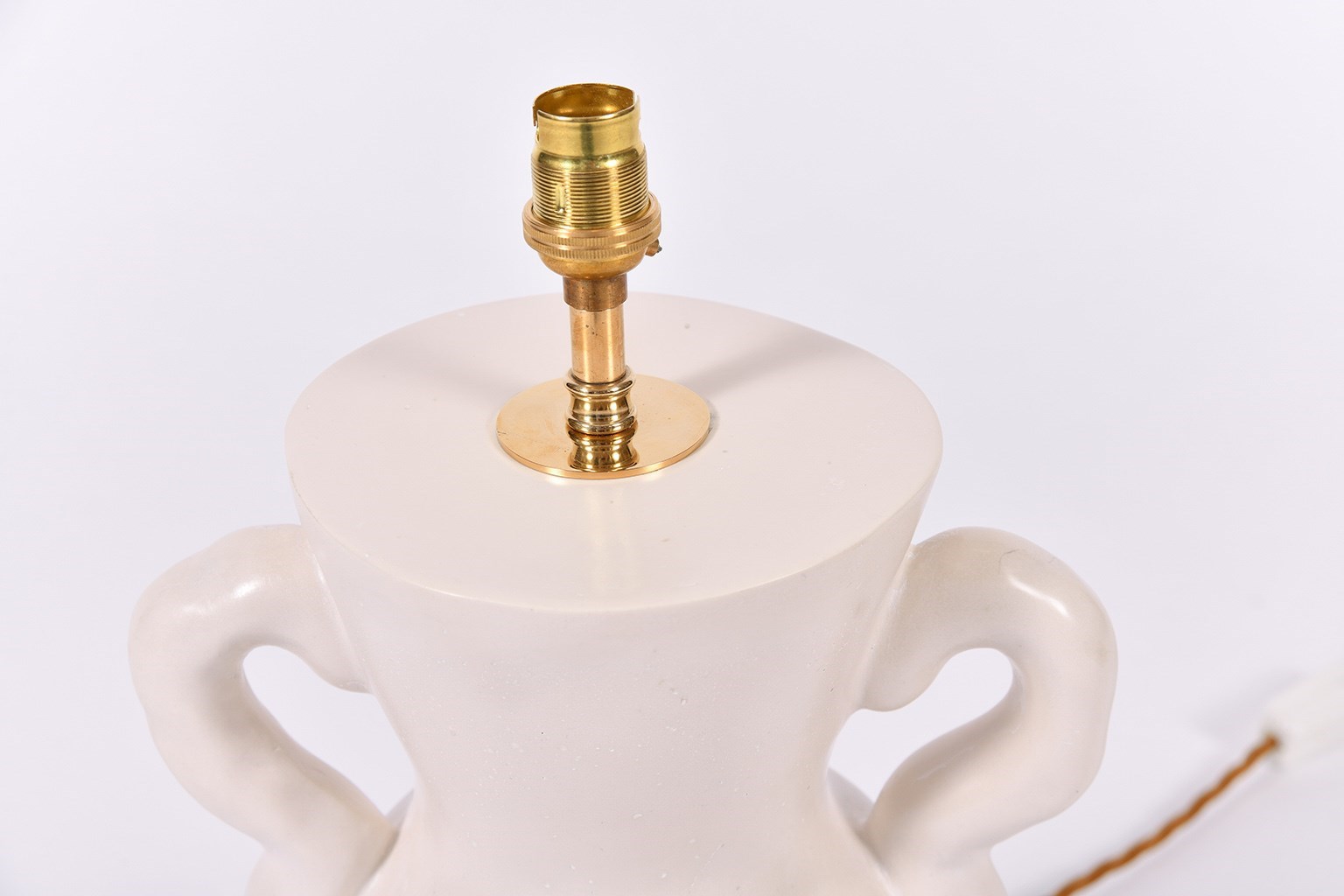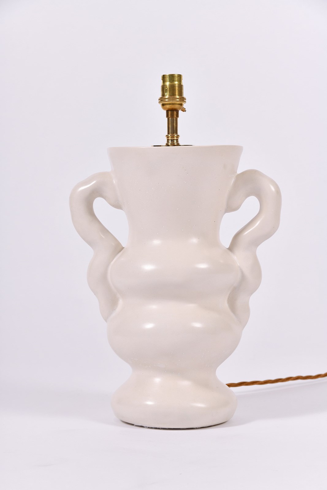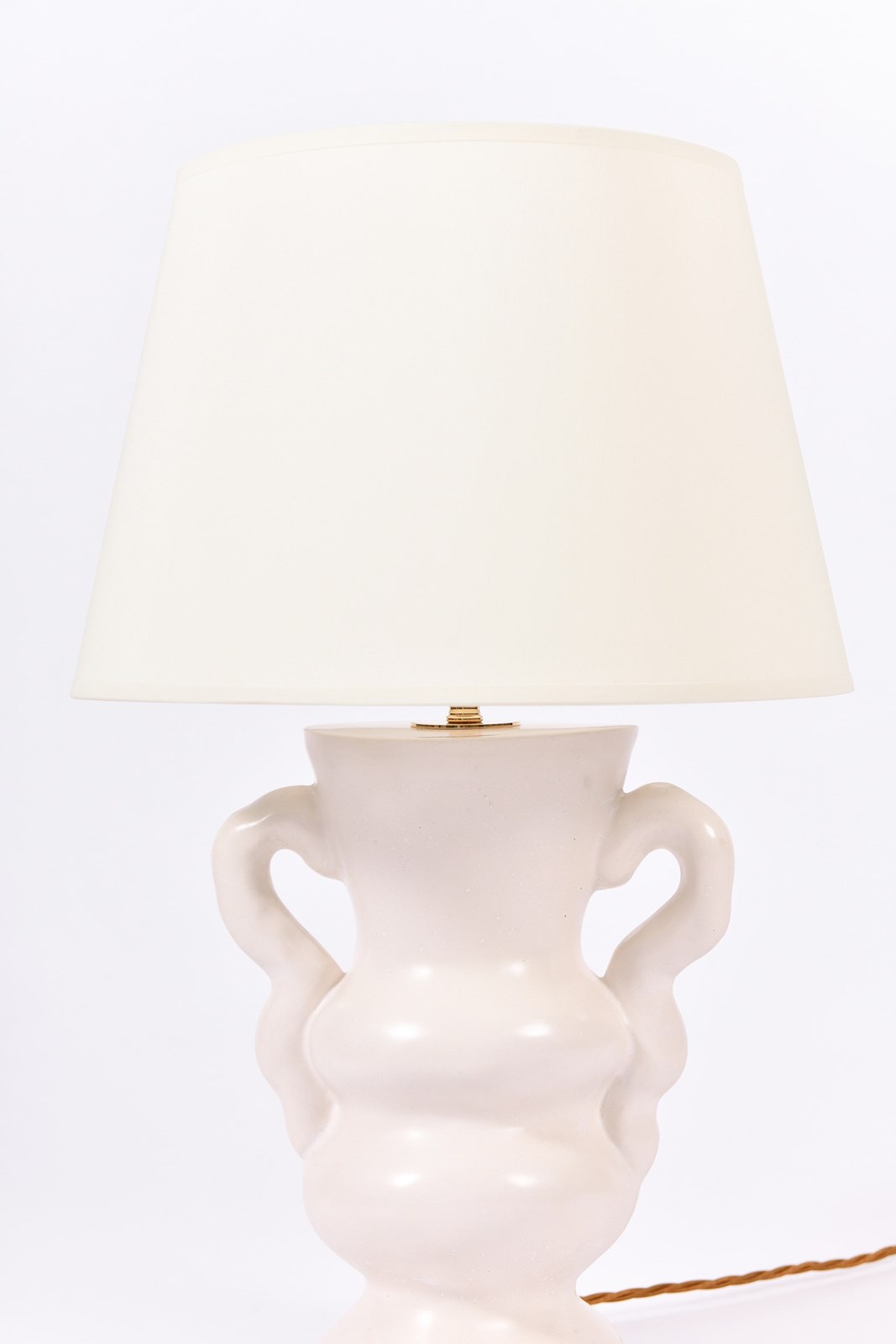Hand cast in London, polished and waxed high quality plaster with a bespoke ivory fabric tapered shade
