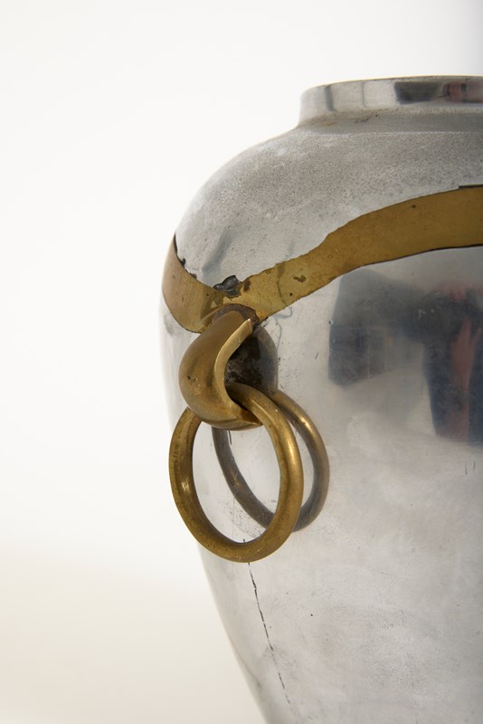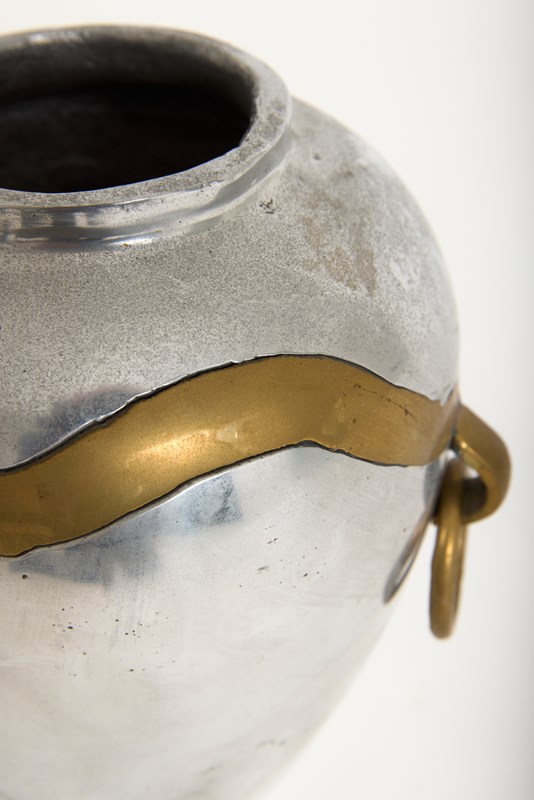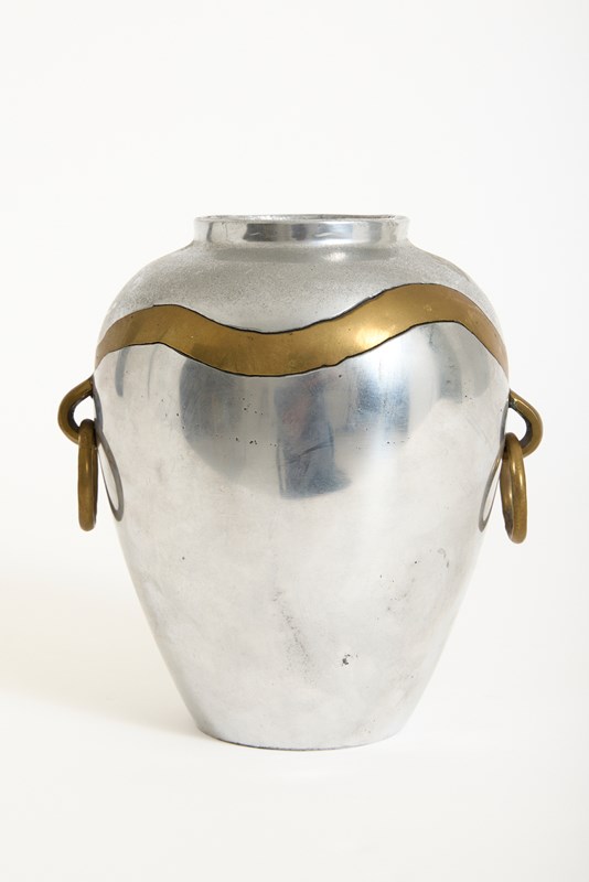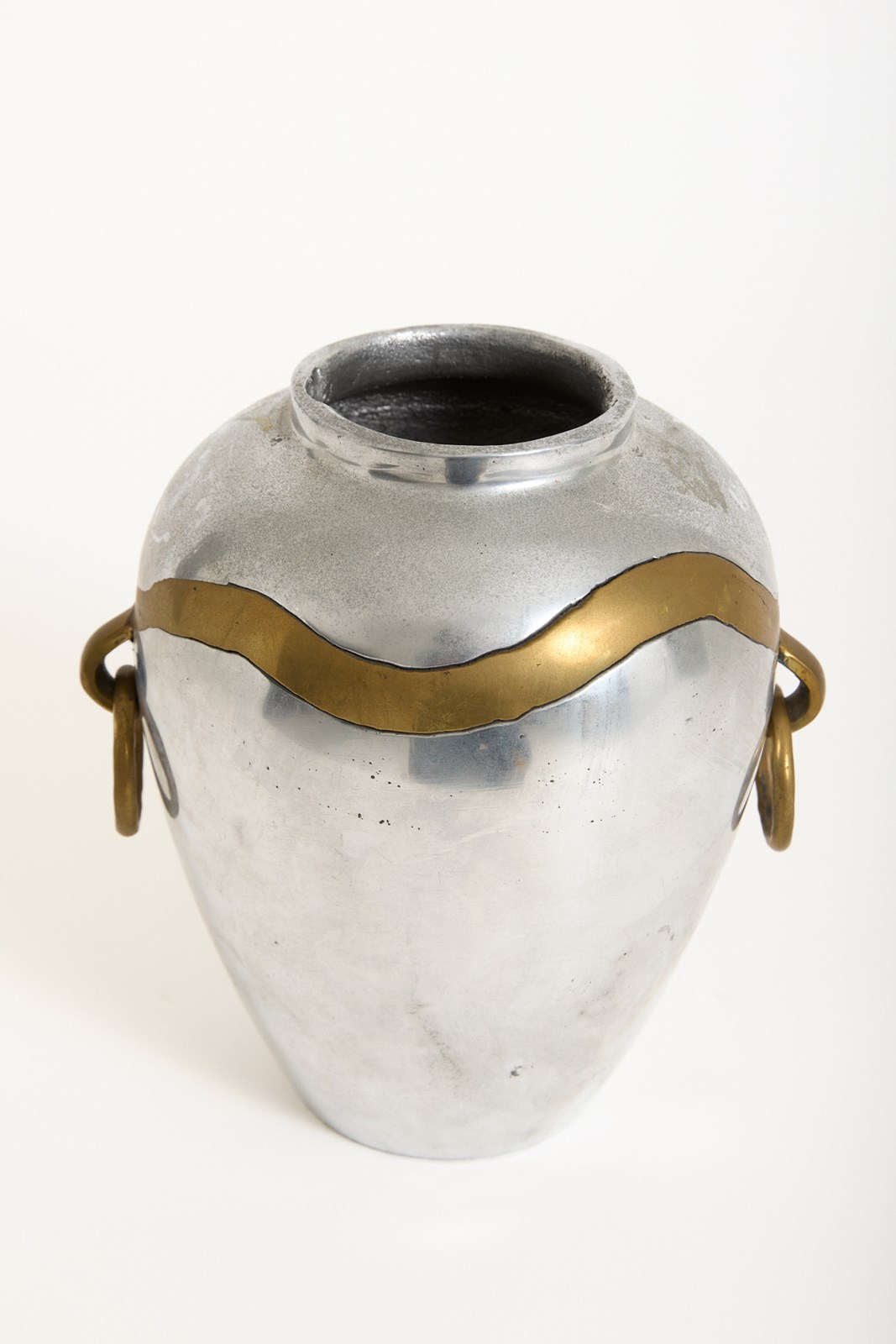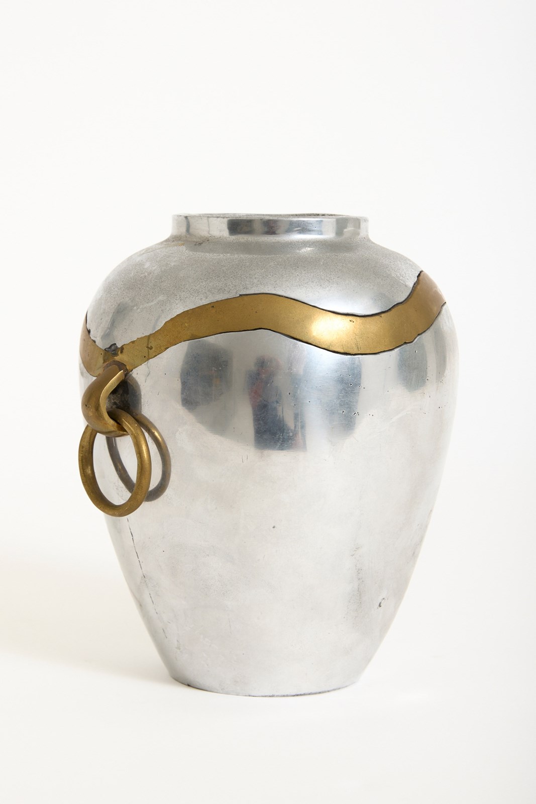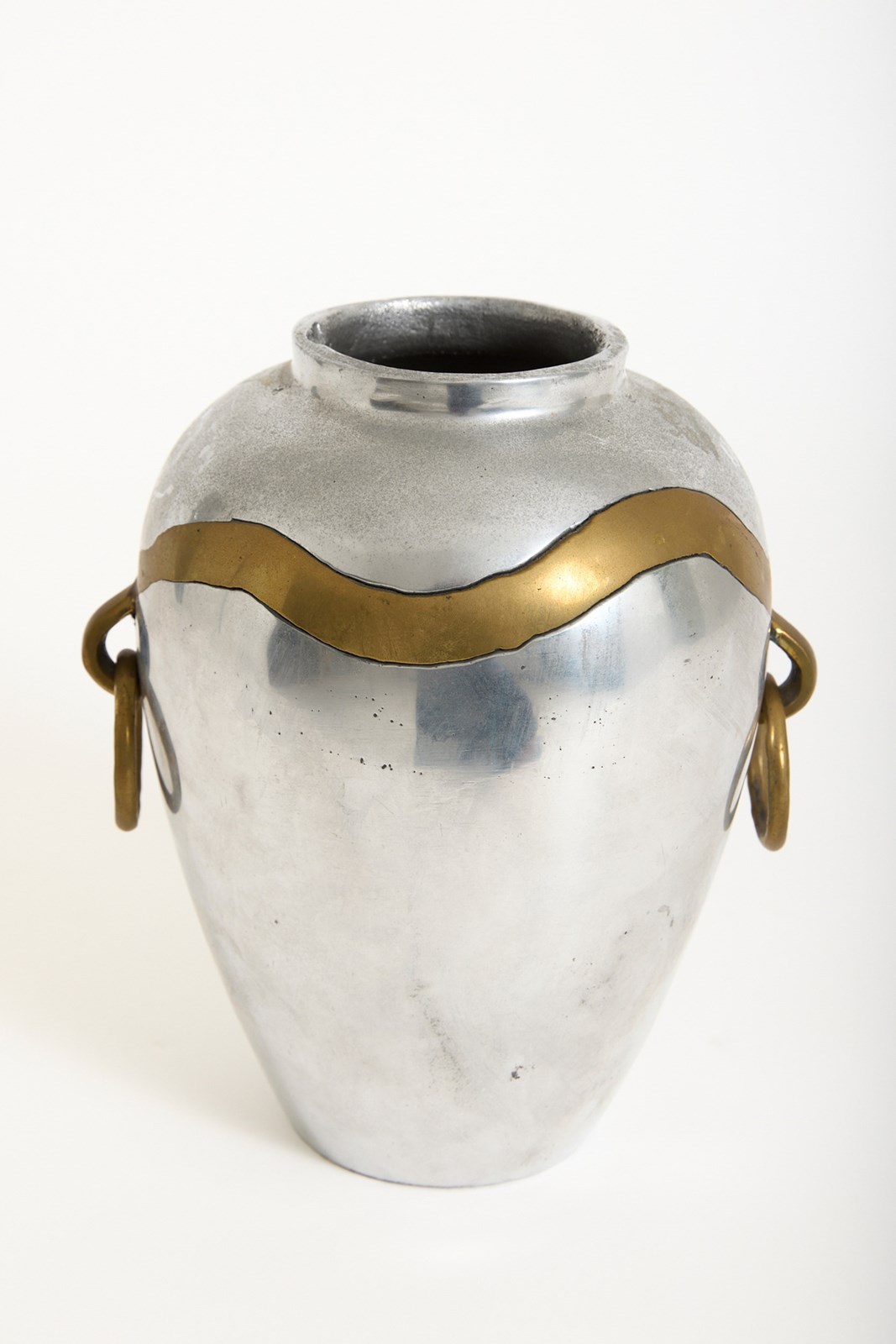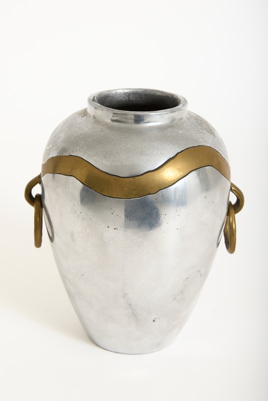 A large Brutalist brass and aluminium vase with twin handles by David Marshall