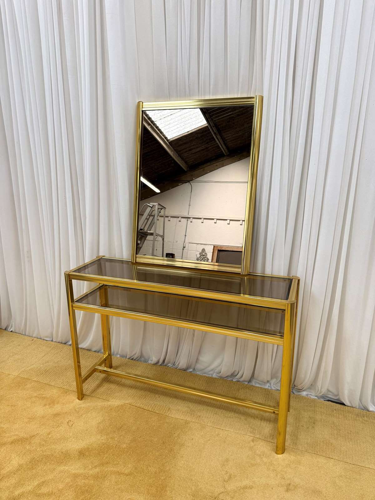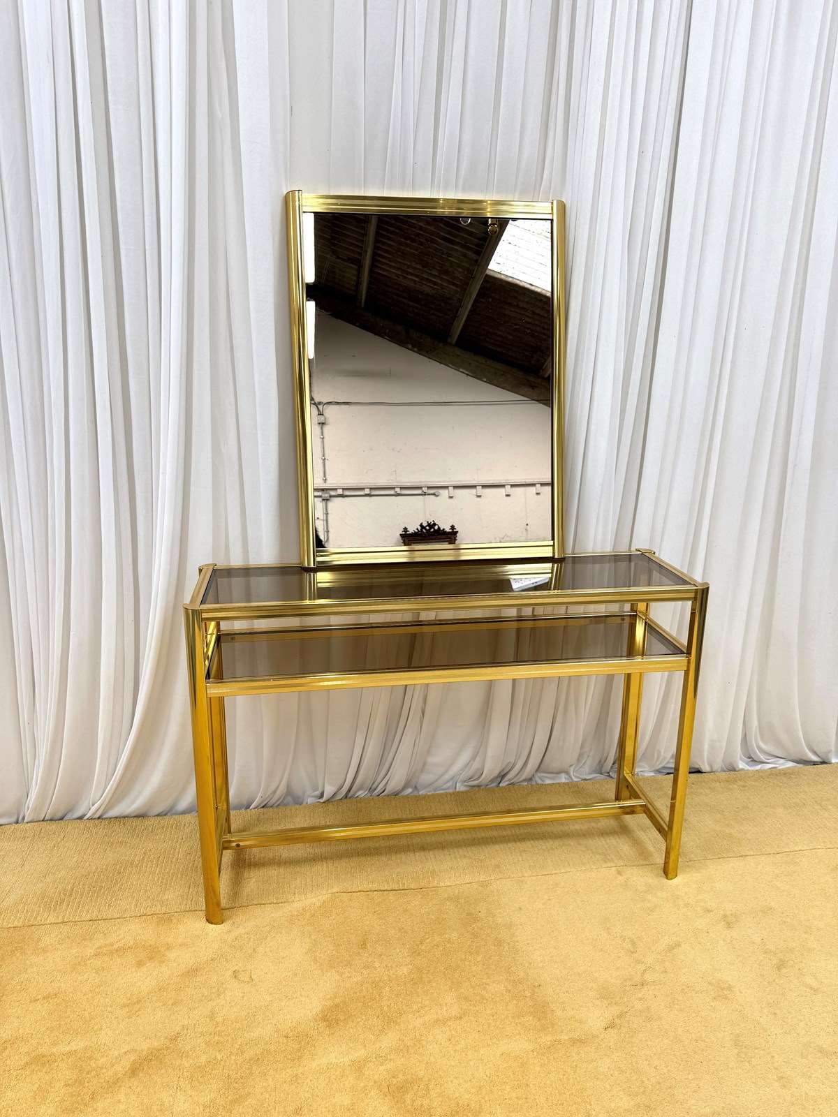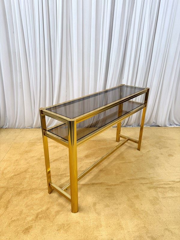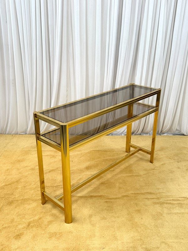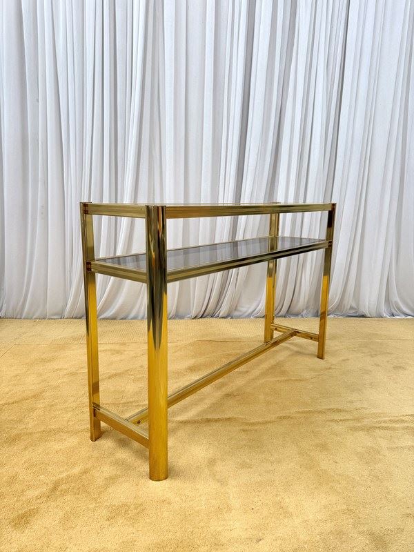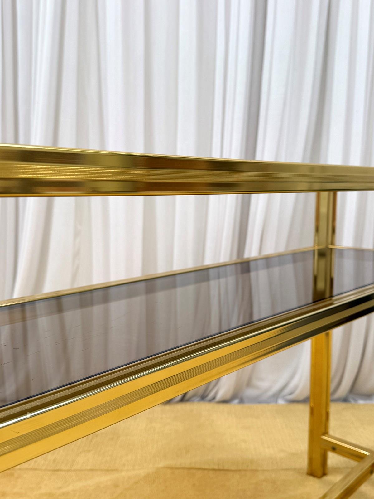 A striking and highly collectible 1970s console table and matching wall mirror set by renowned French designer Pierre Vandel. Known for his sleek, modernist aesthetic, this set perfectly captures the refined glamour of the era.The console features a clean-lined metal frame with a rich gold-tone powder-coated finish, paired with a sophisticated smoked glass top and lower shelf. The tinted glass adds depth and contrast, enhancing the overall elegance of the piece.